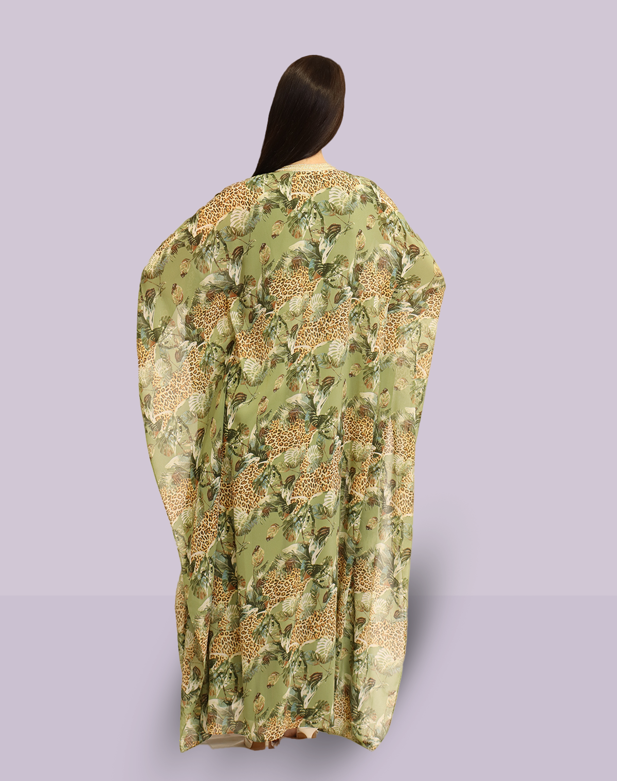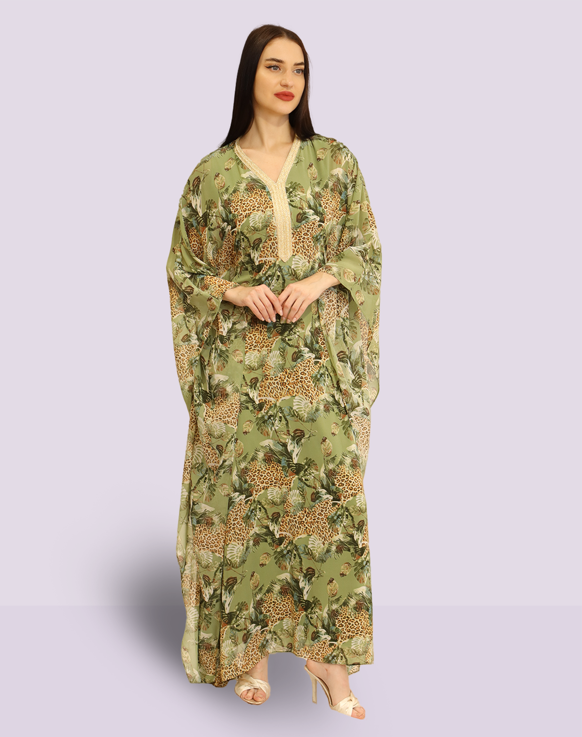 An exotic kaftan in a lush green, featuring a sophisticated animal print and elegant neckline embroidery.