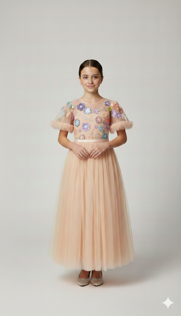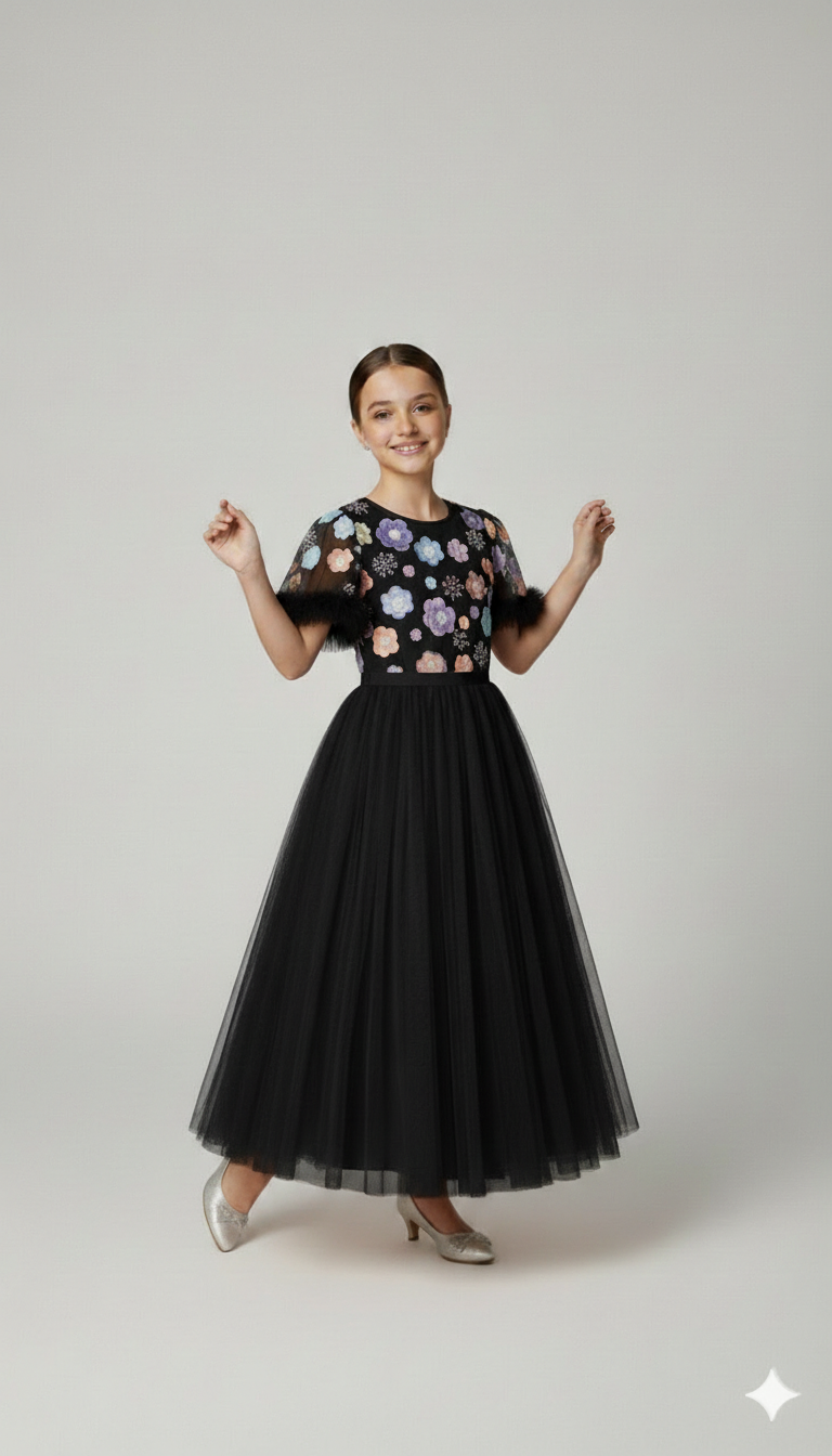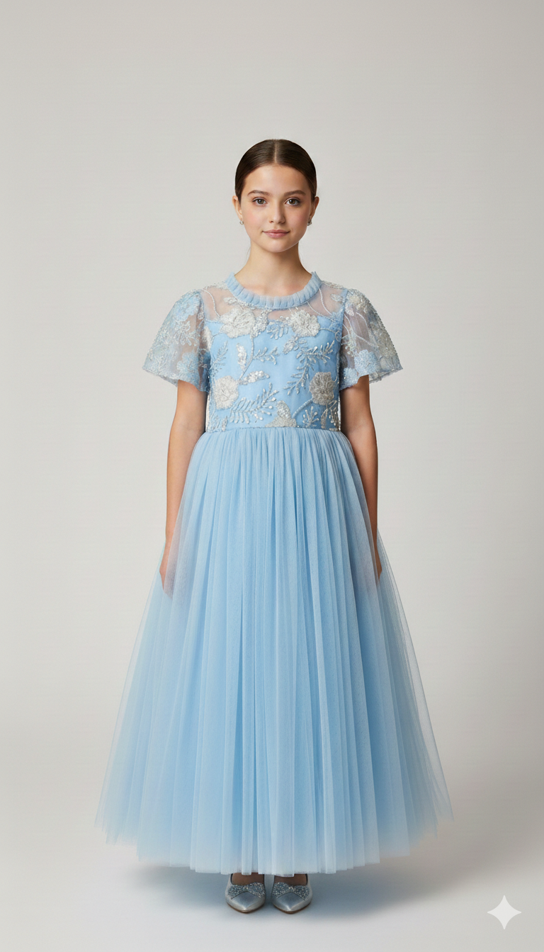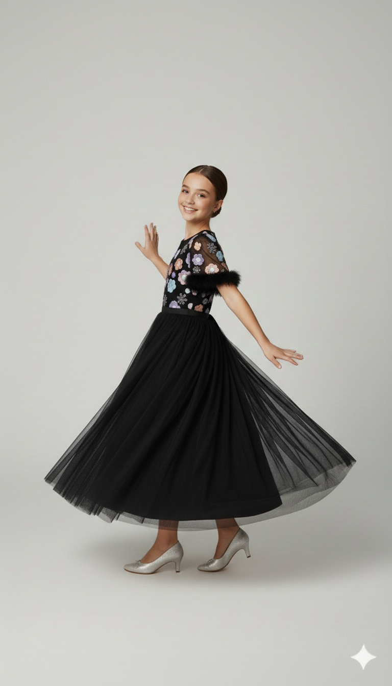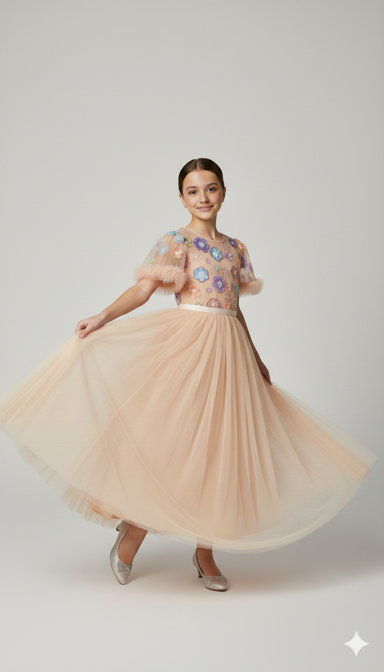 This elegant dress features a fancy embellished bodice with a flowy tulle skirt and a soft silky satin inner lining.