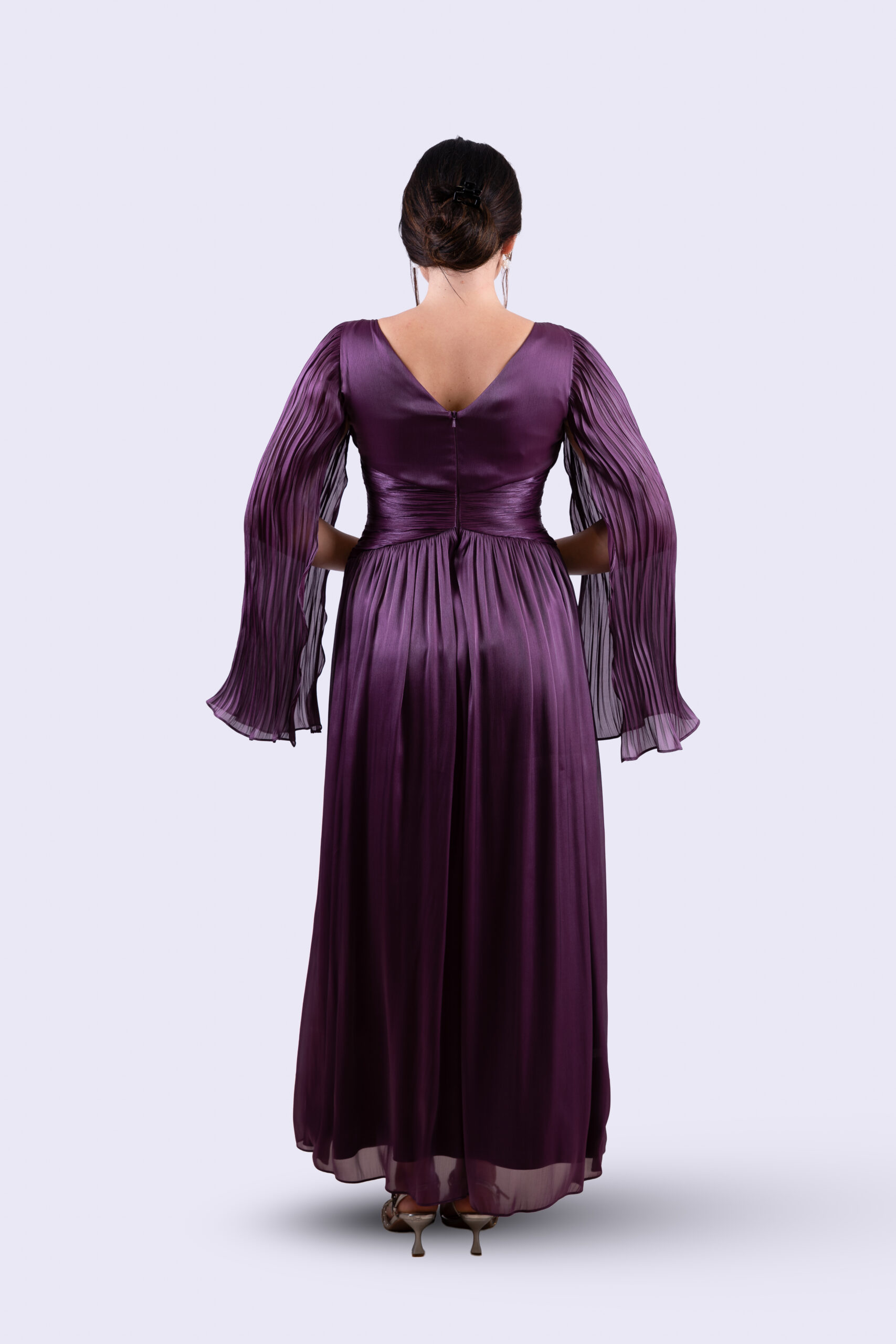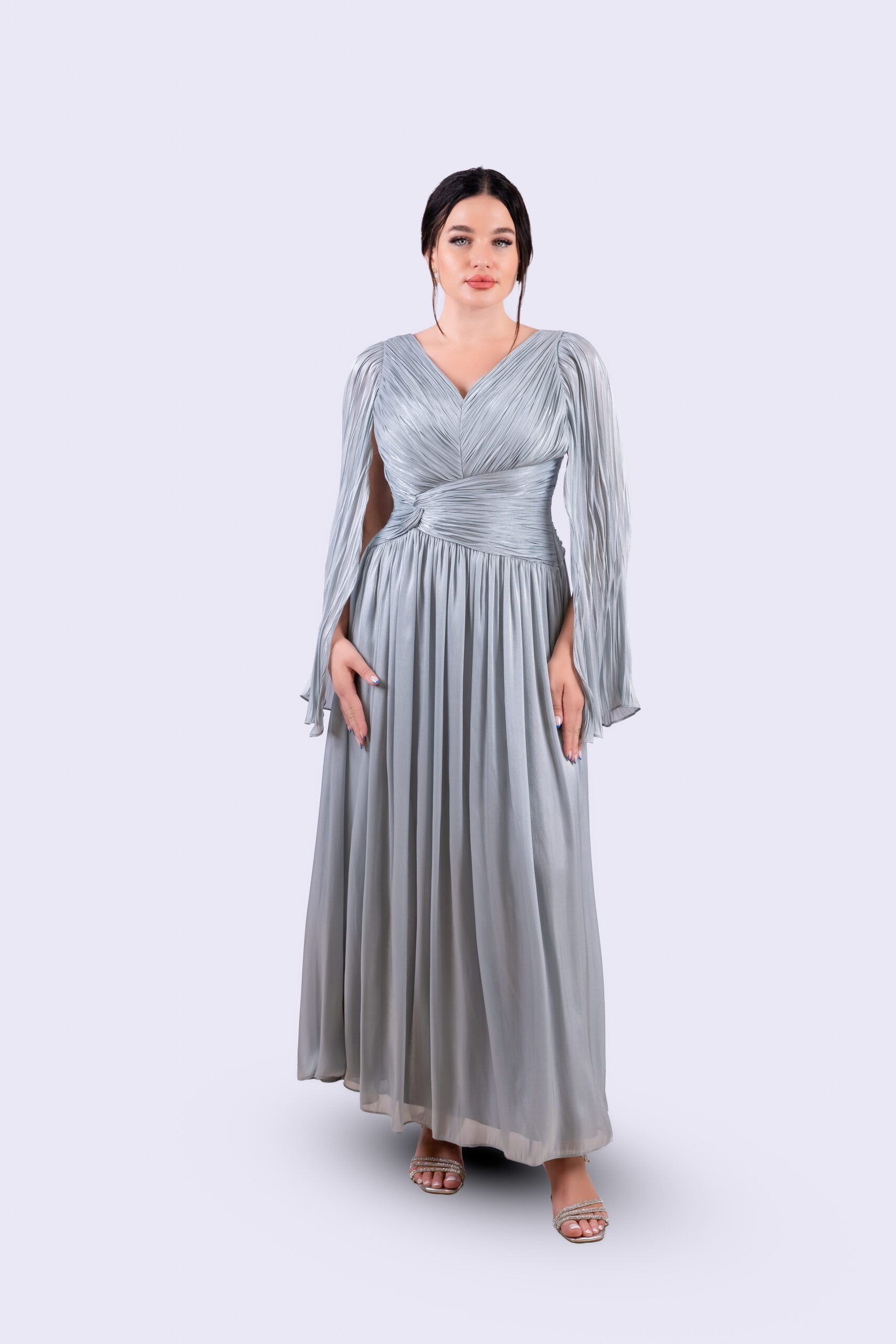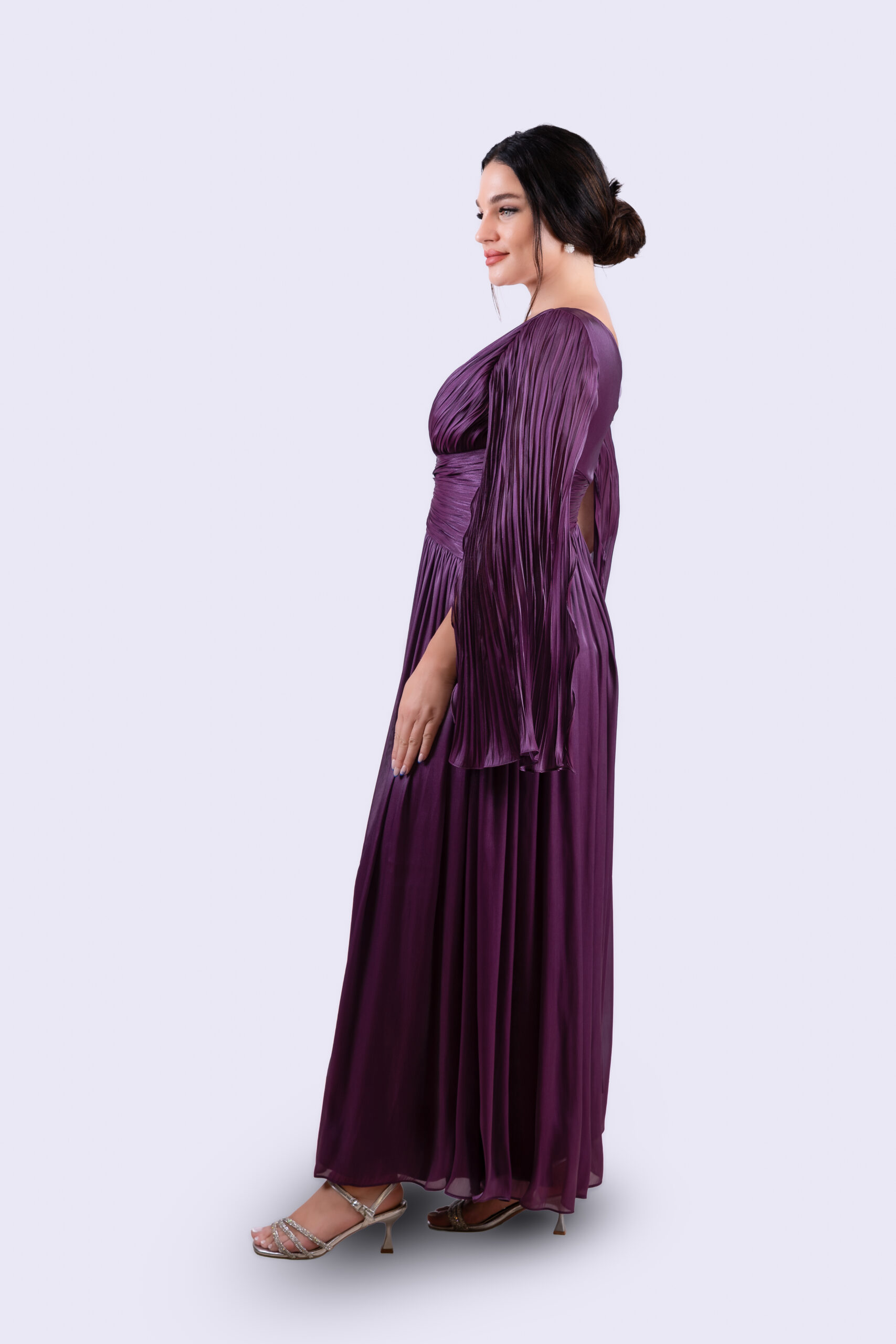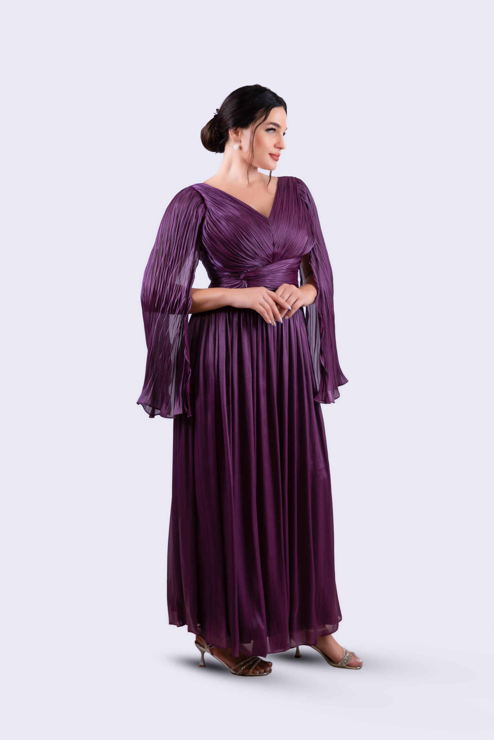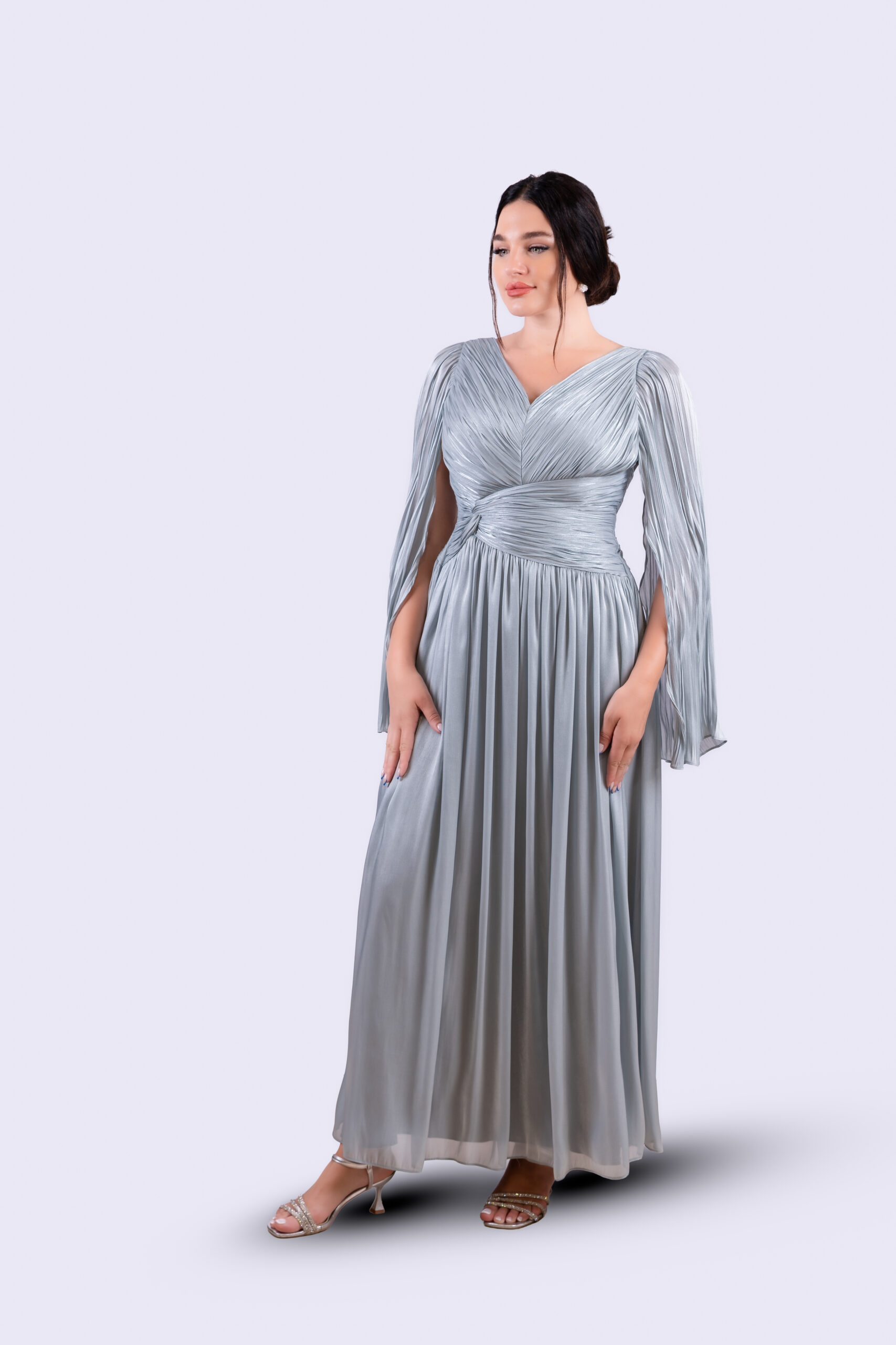 An ethreal gown that captivates with its shimmering fabric and dramatic, flowing open pleated sleeves.