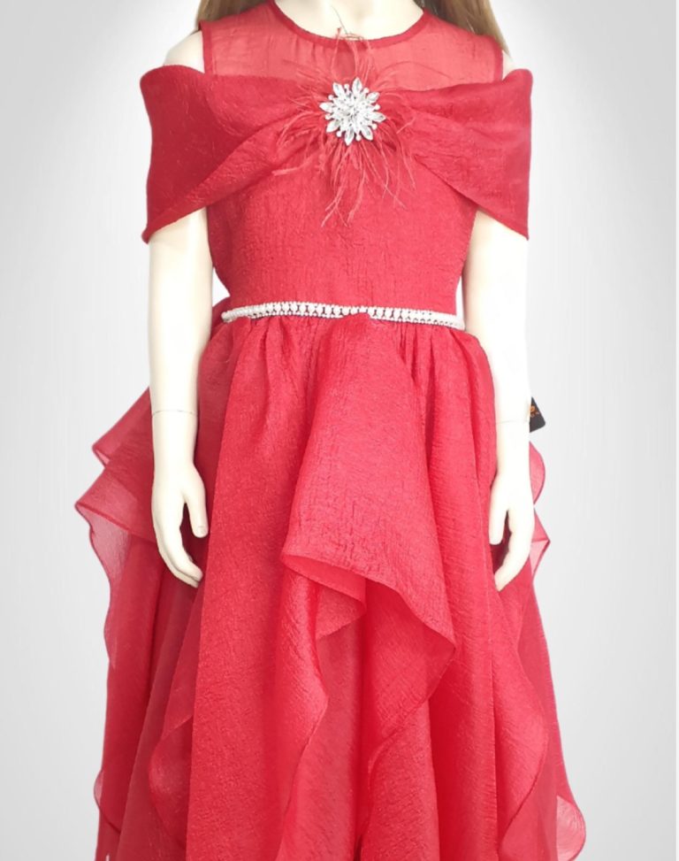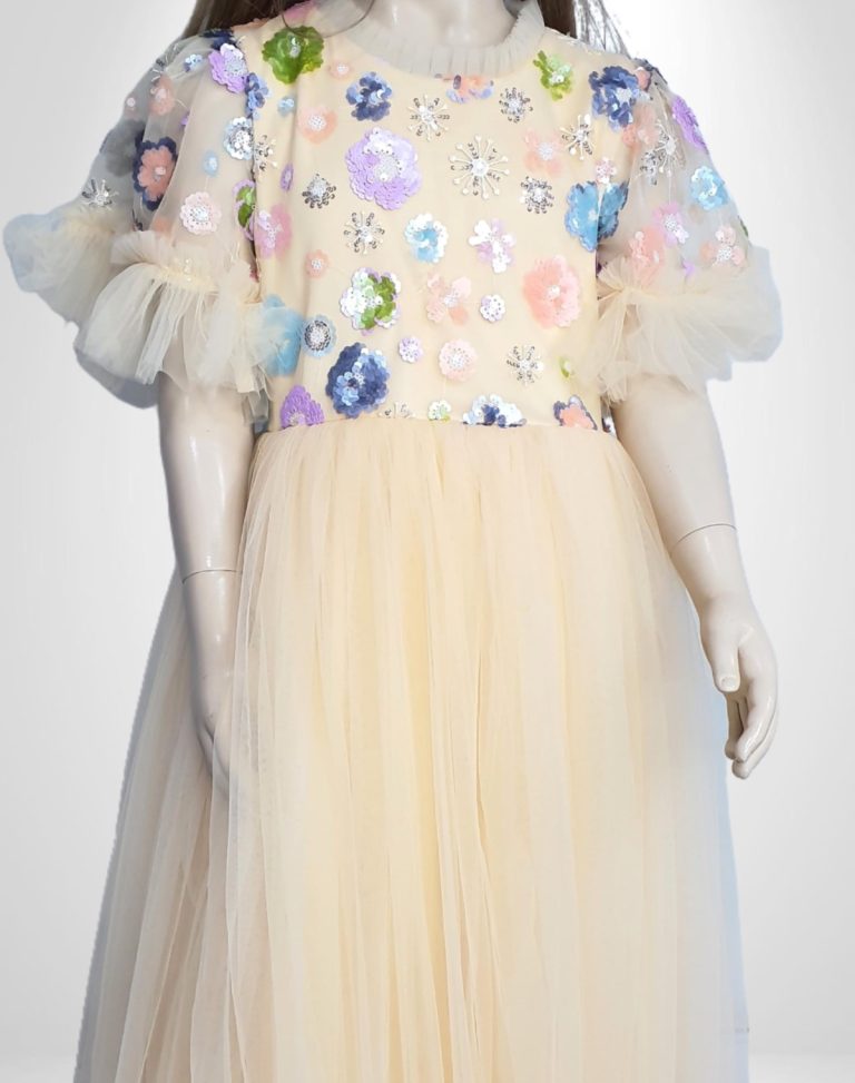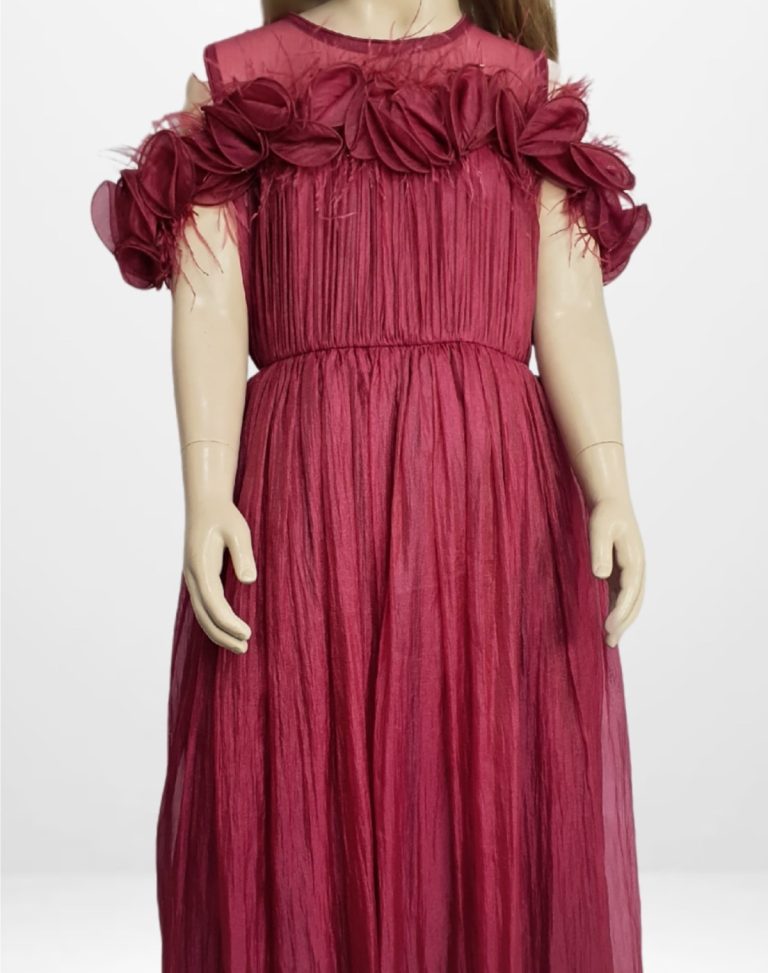 This etherea frock features a sheer yoke with an off-the-shoulde handcrafted organza flowers and delicate feather accents.