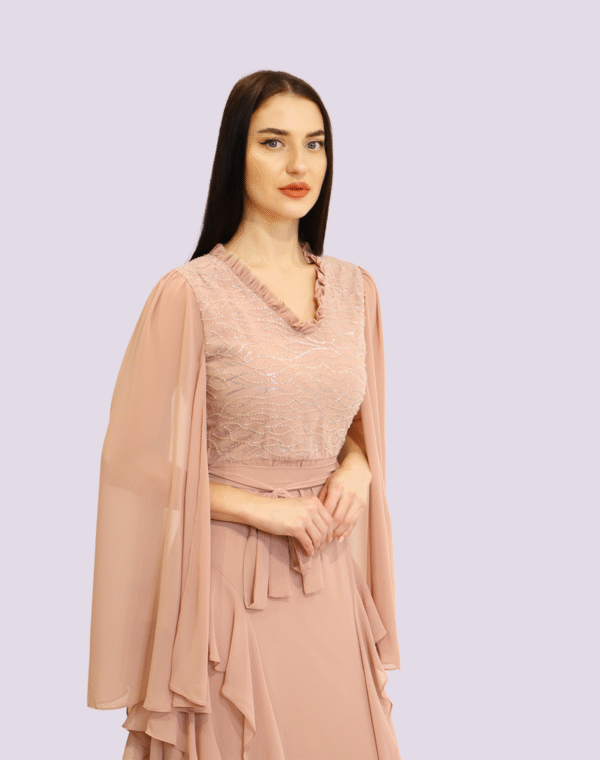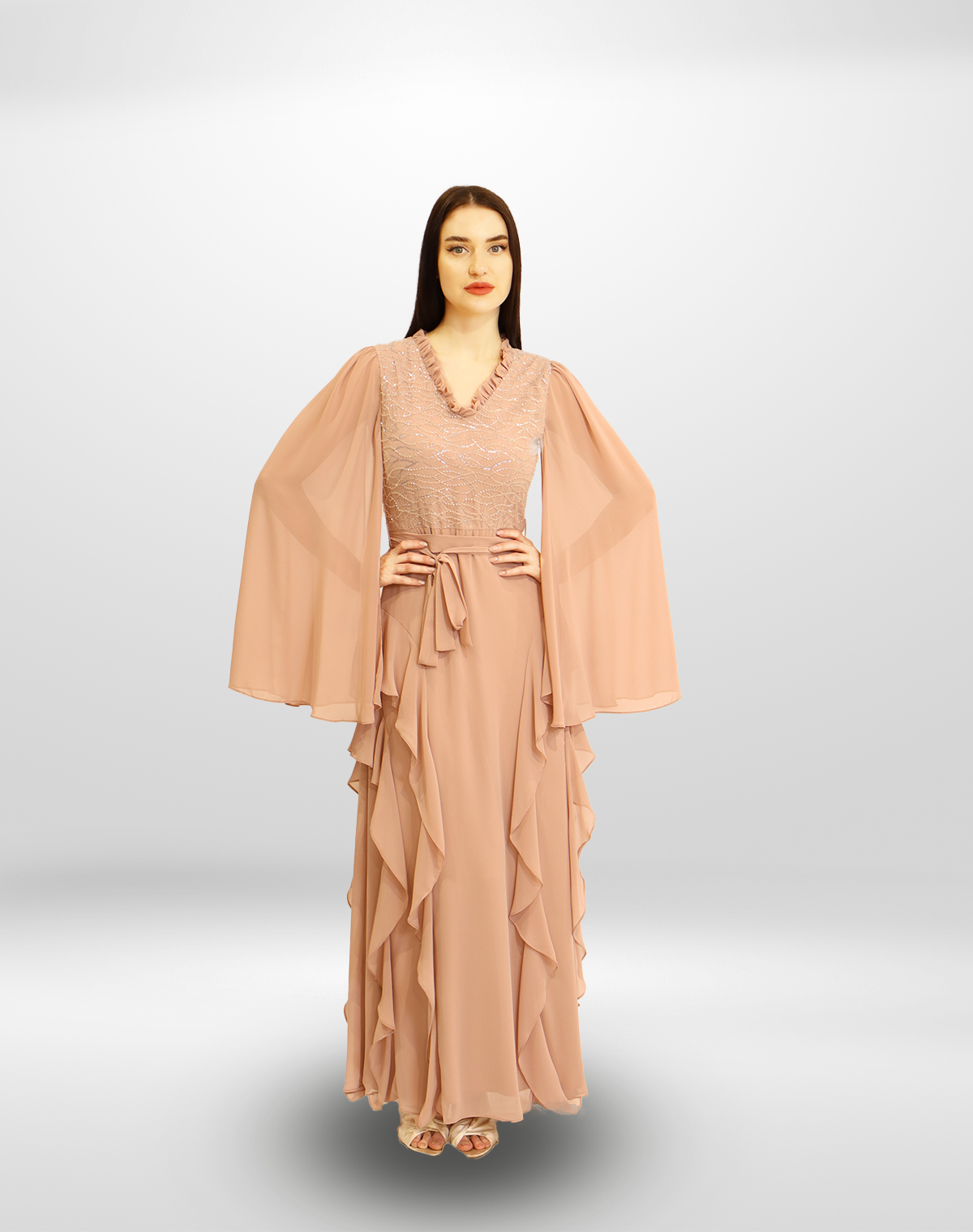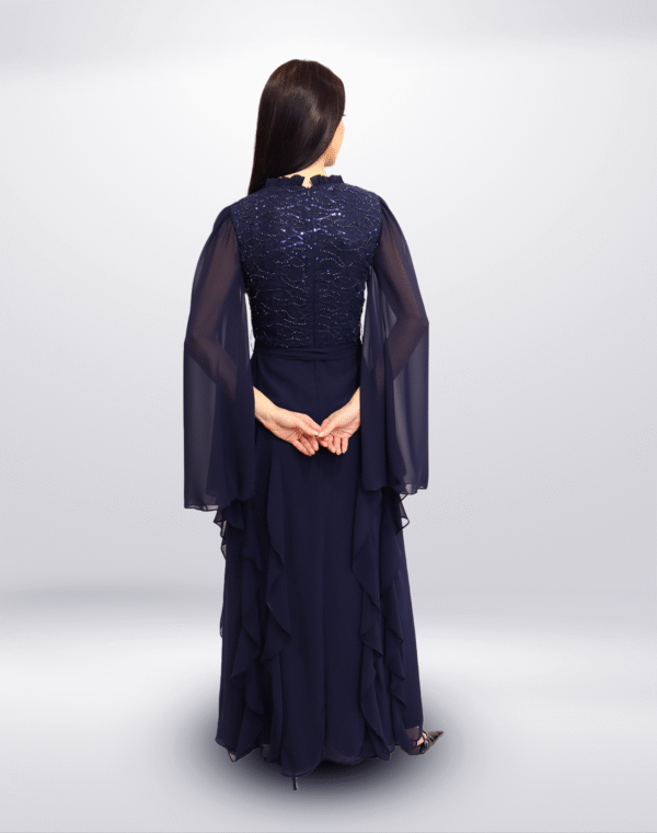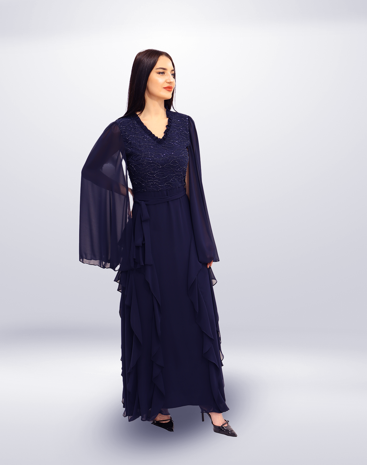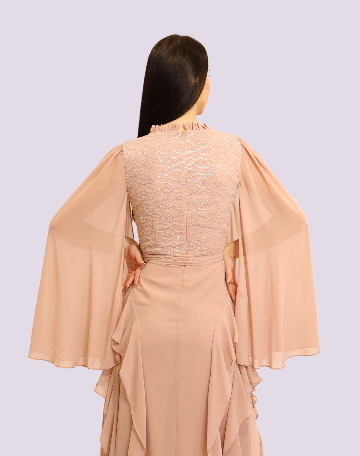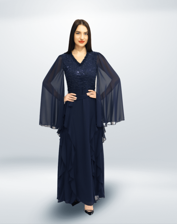 Graceful full-length gown with flowing chiffon sleeves and intricate sequin detailing on the bodice.
