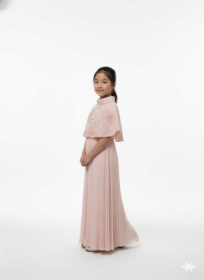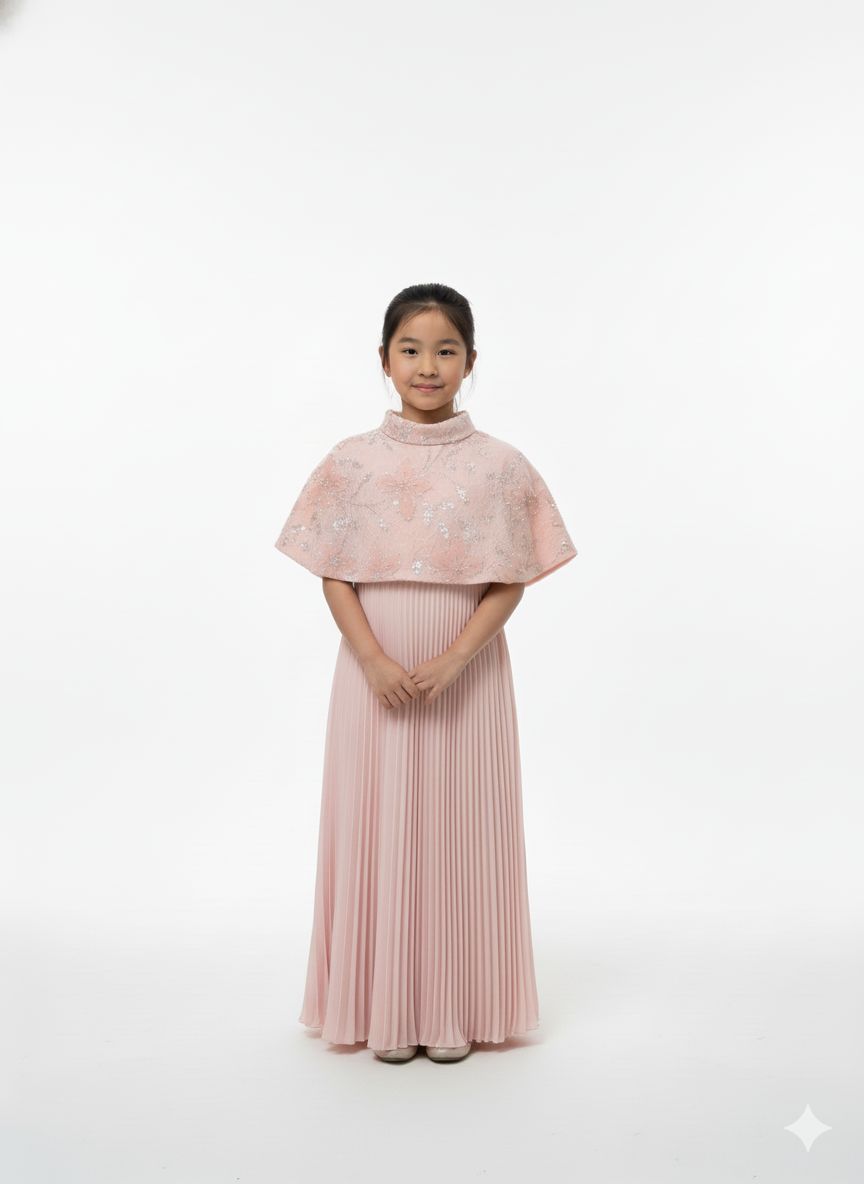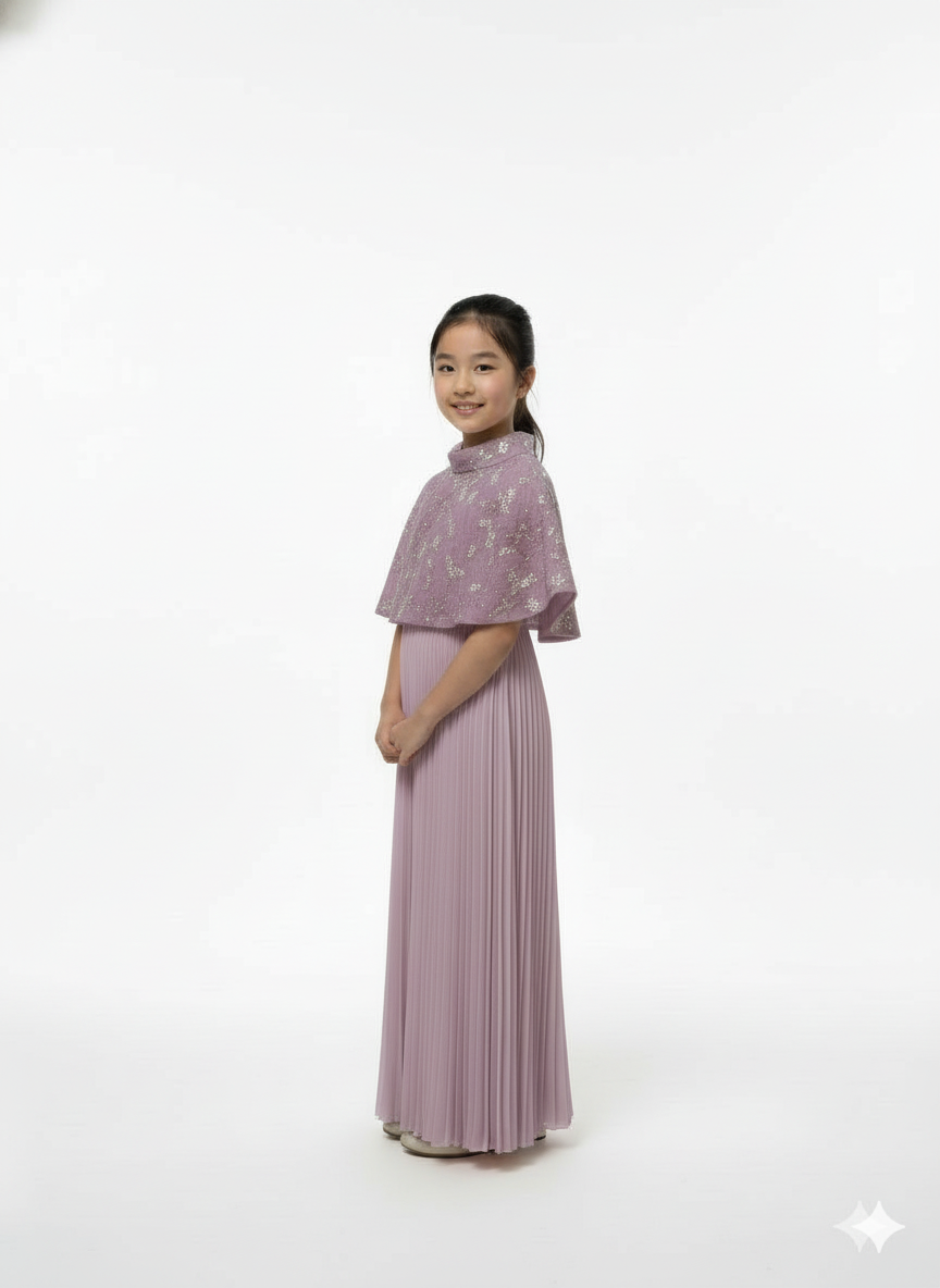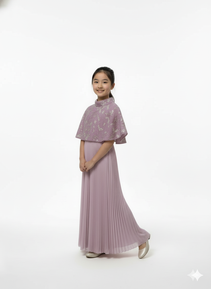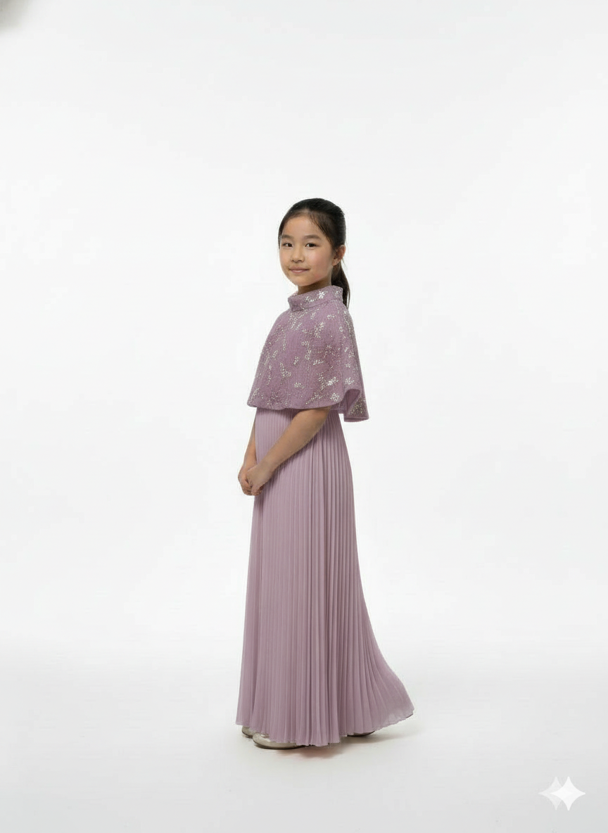 A sophisticated gown featuring a graceful cape overlay and a classic pleated skirt.