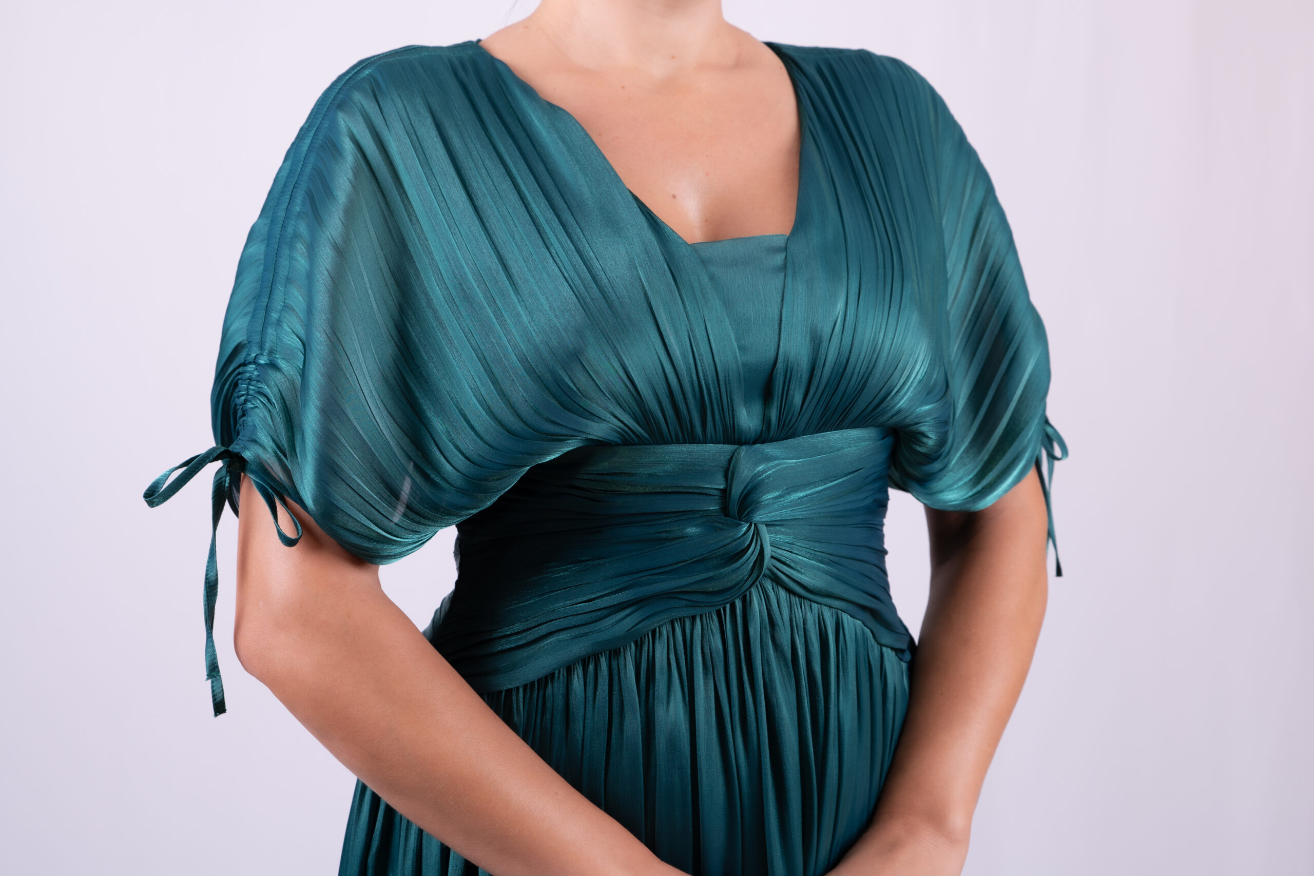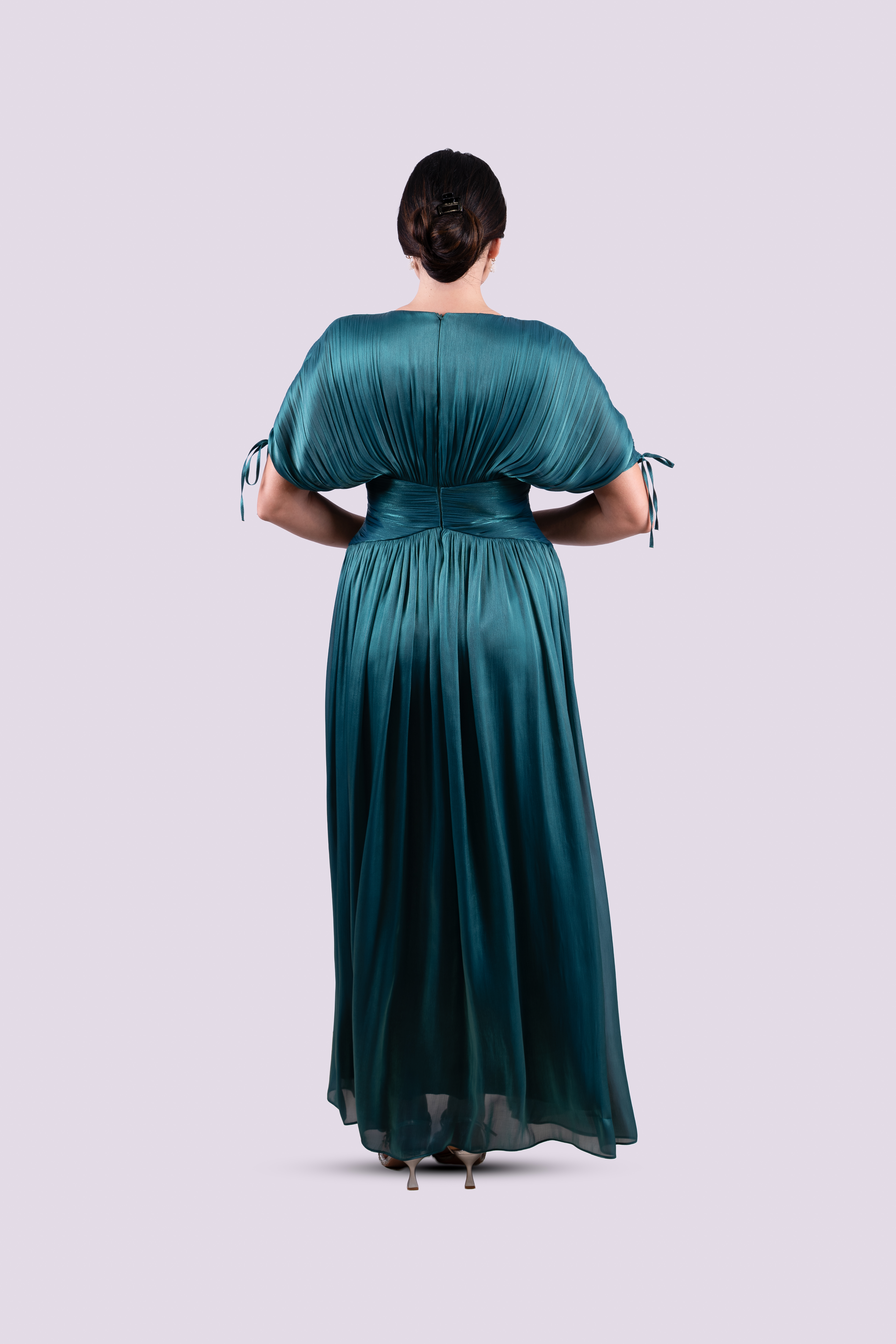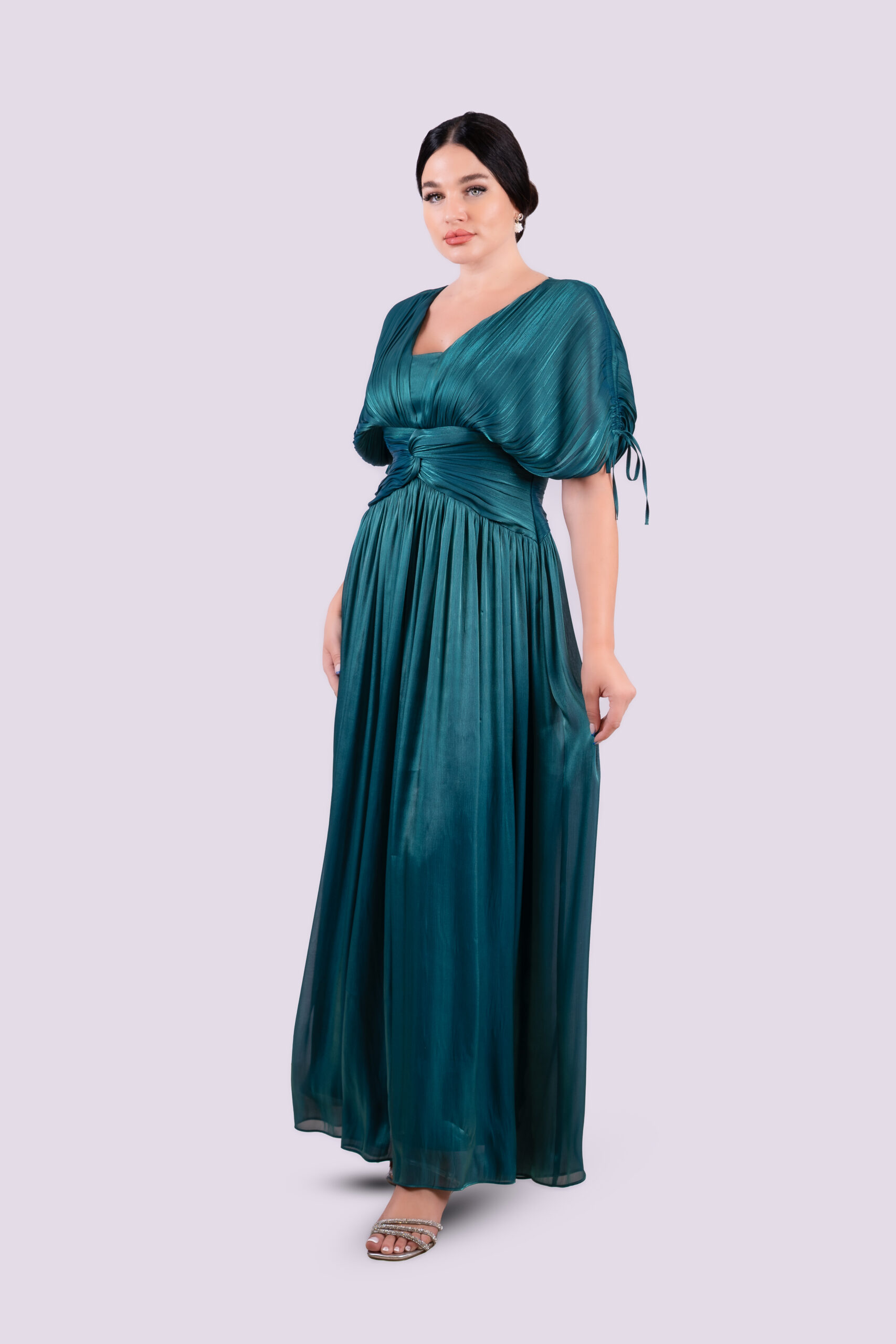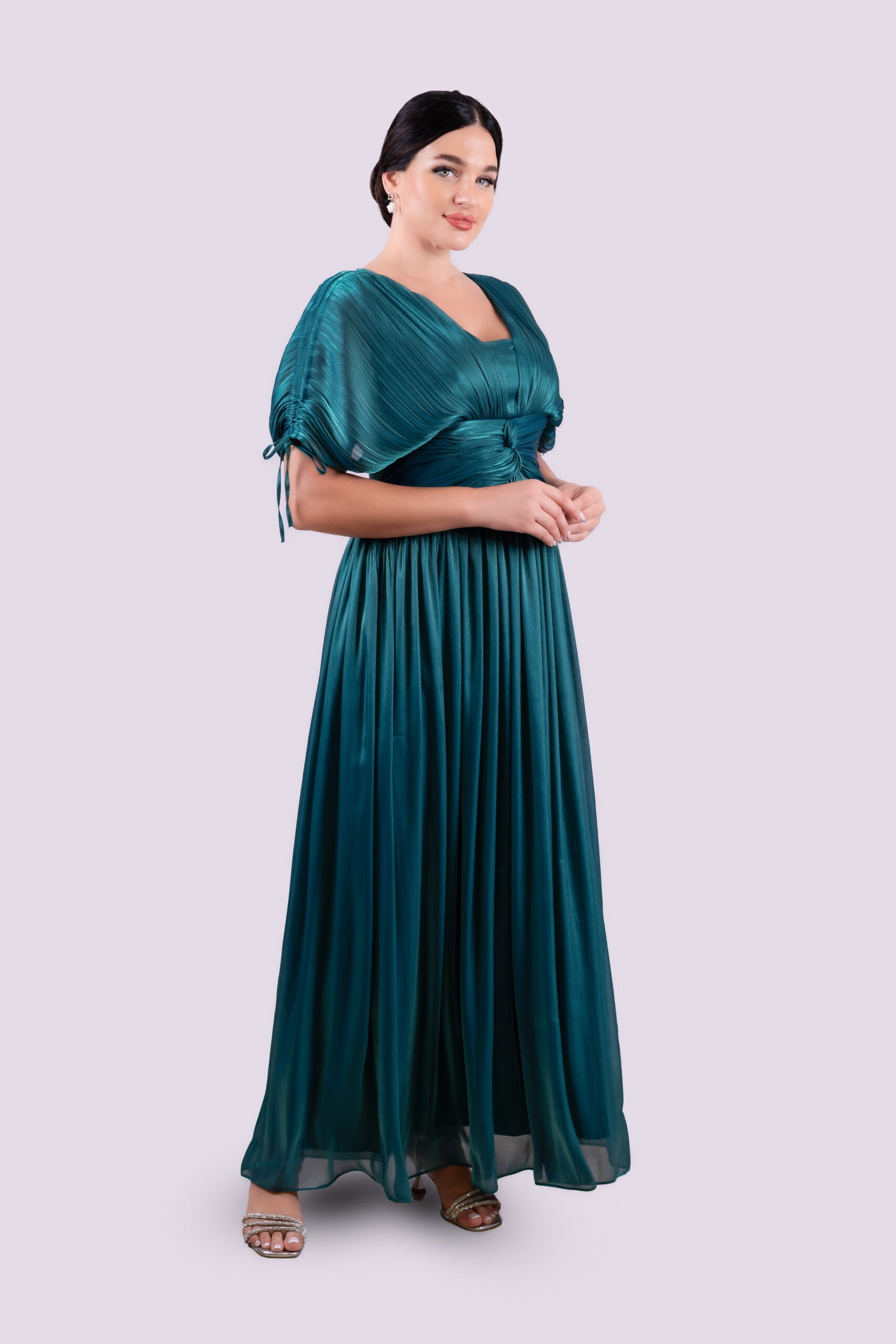A radiant teal gown defined by its unique pleated cape-like sleeves with drawstring details and a gracefully flowing A-line skirt.