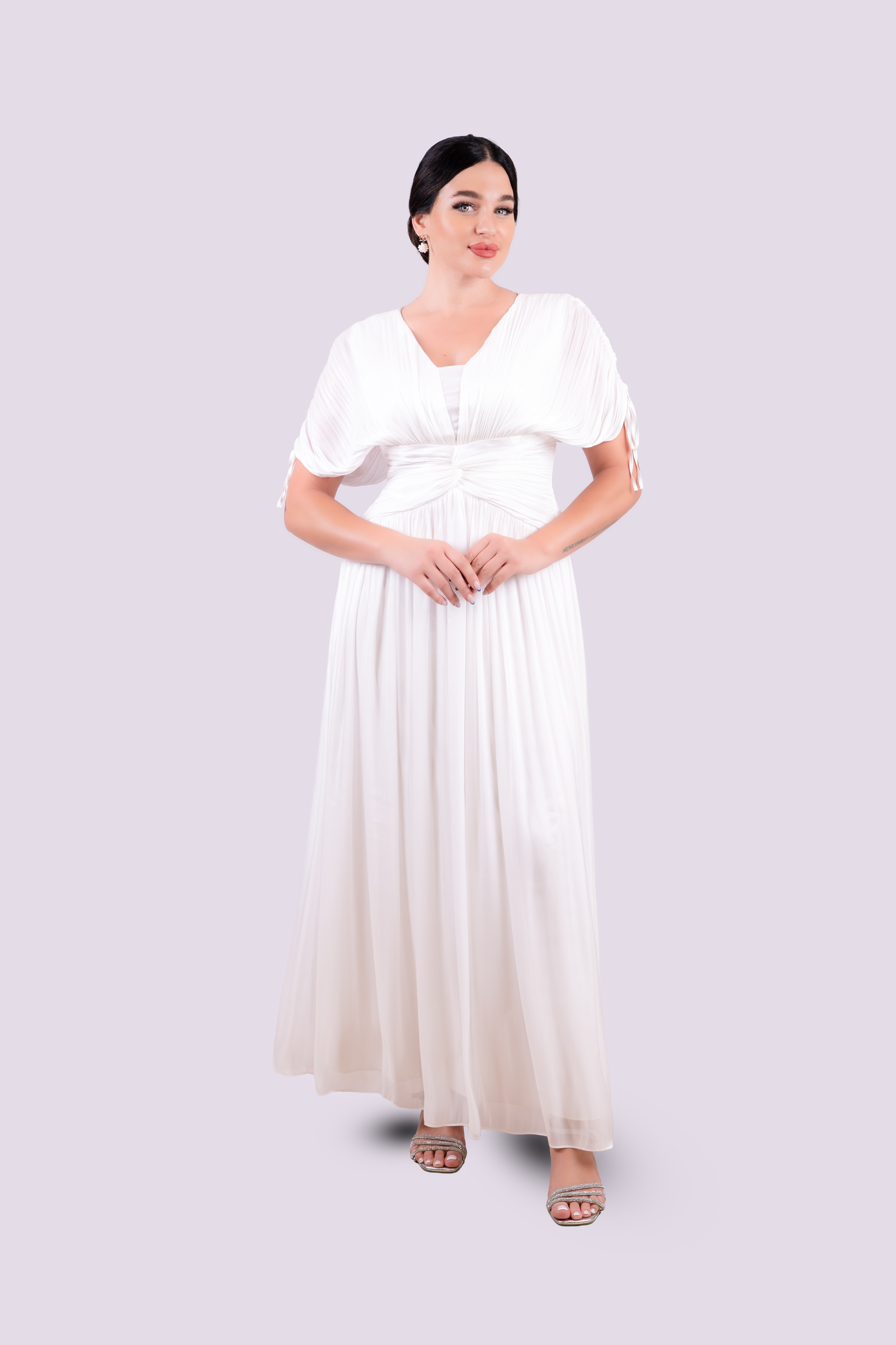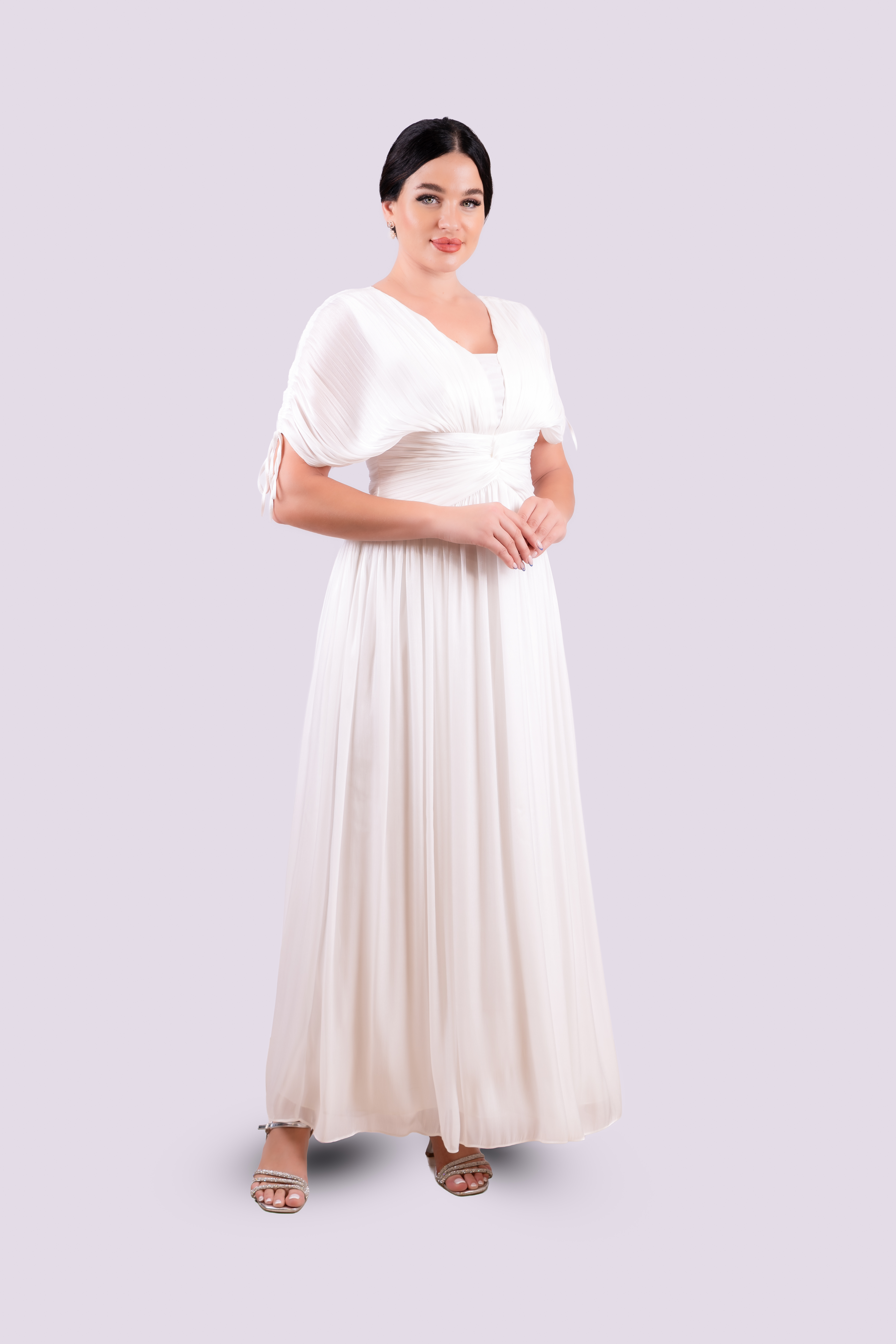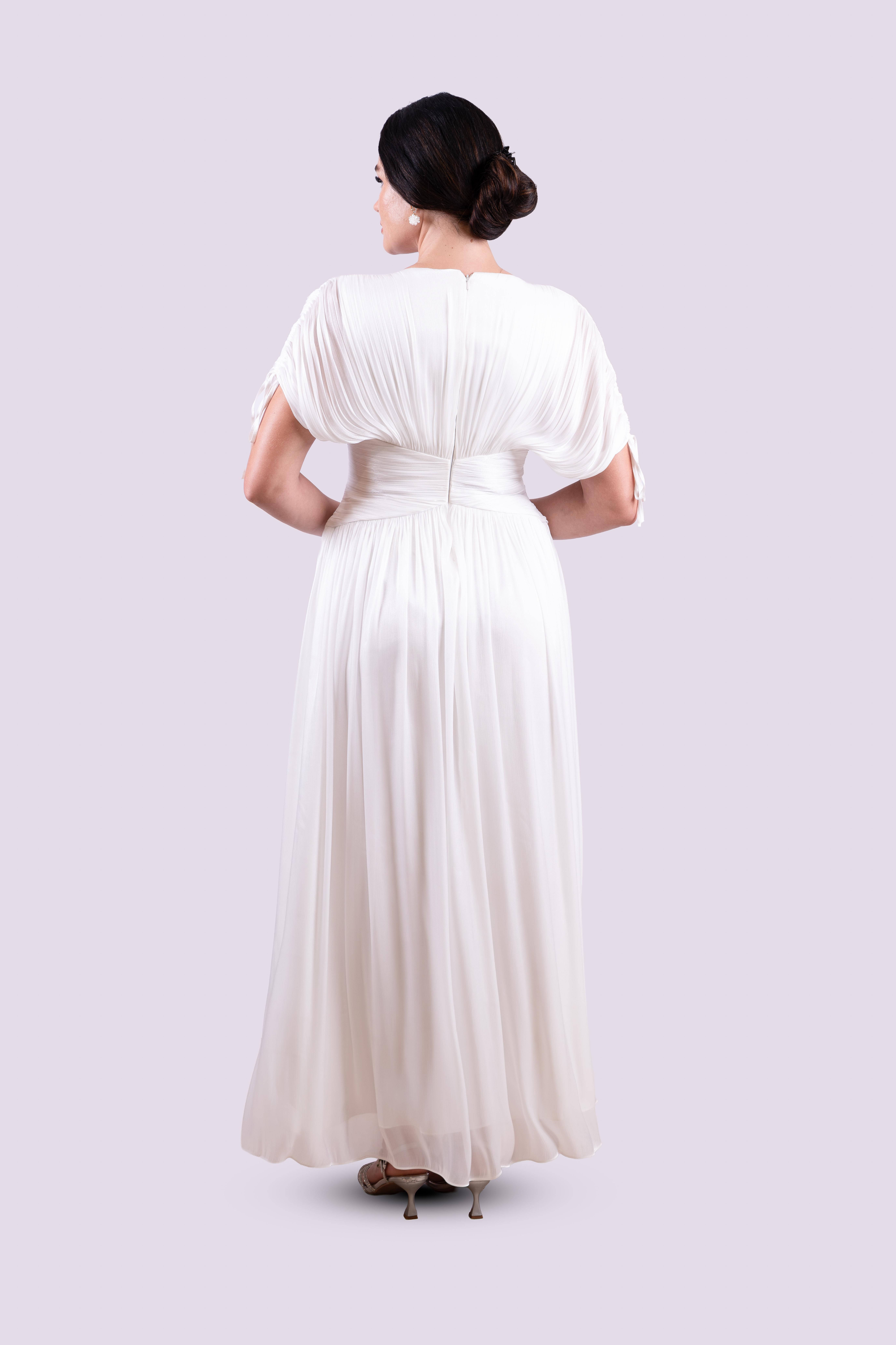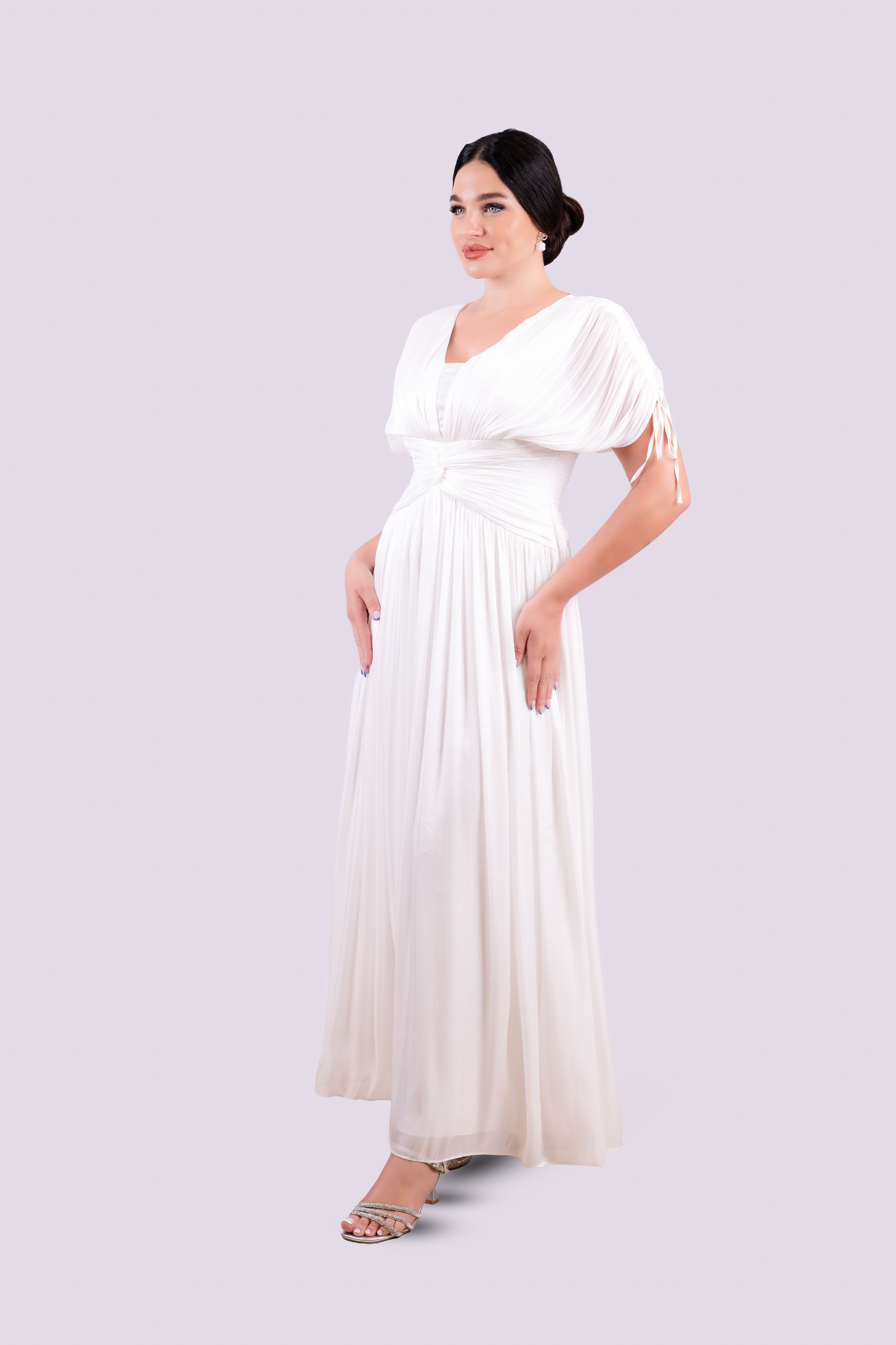Sleeves: Short, pleated cape-style sleeves with drawstring details.