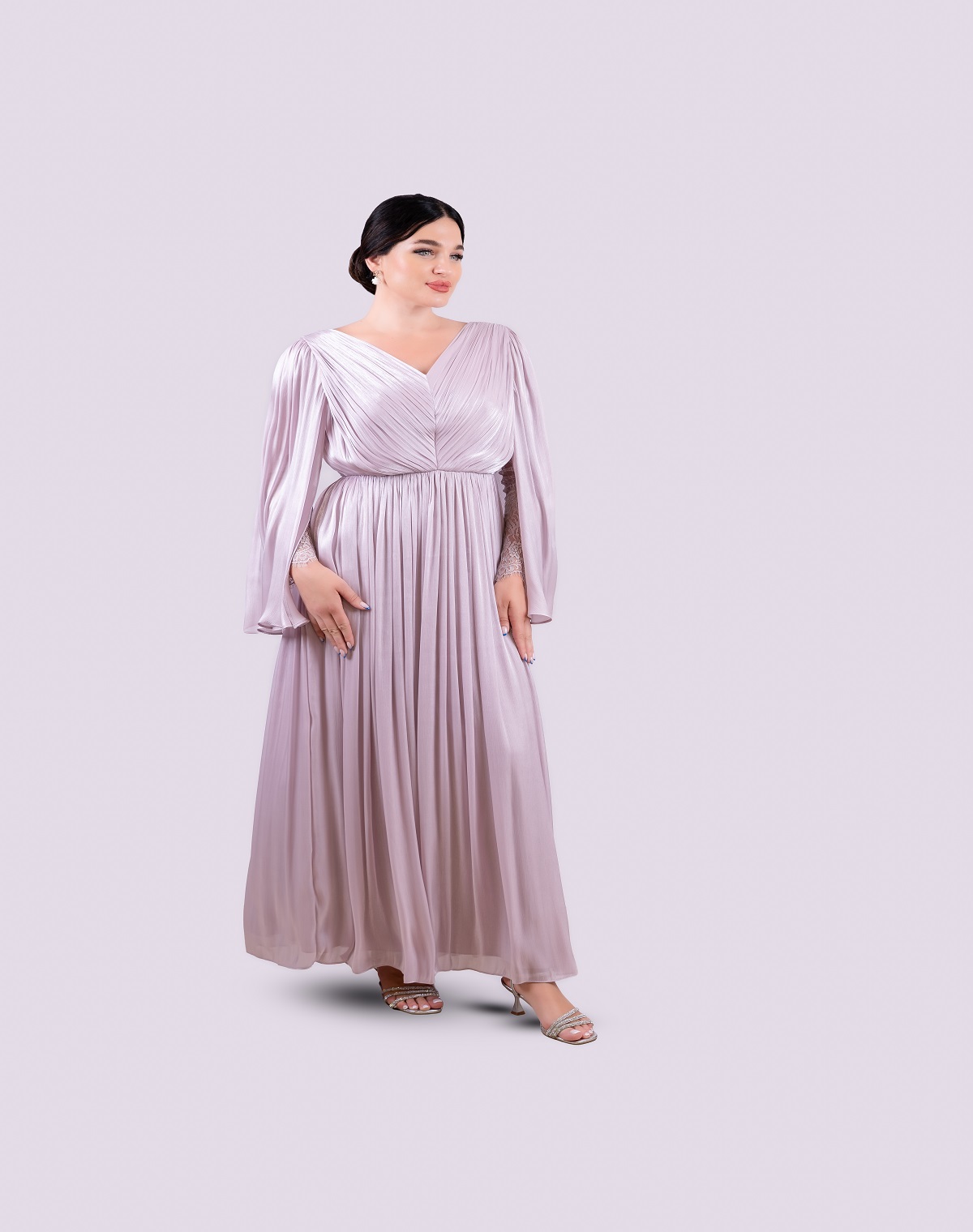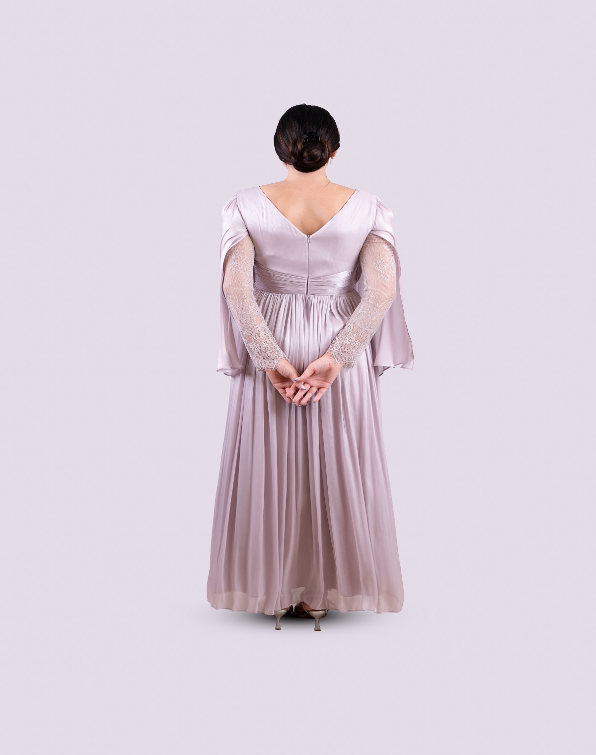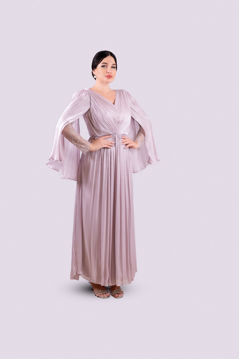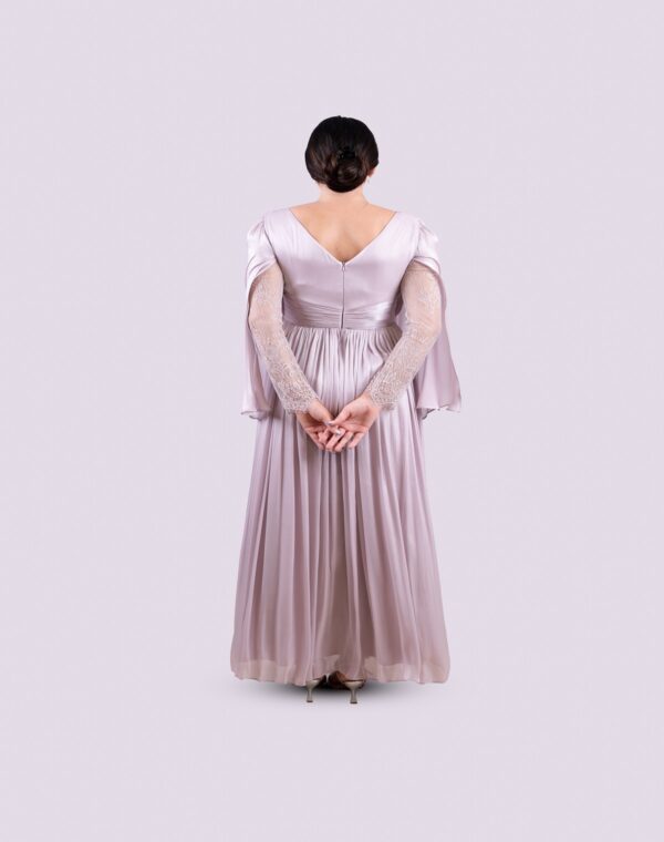 A gracefully pleated gown in a soft rosie hue, defined by its dramatic open sleeves with a delicate lace interior.