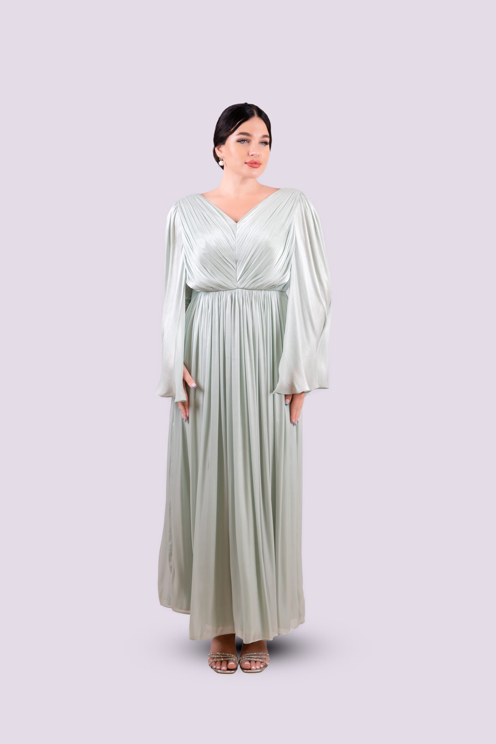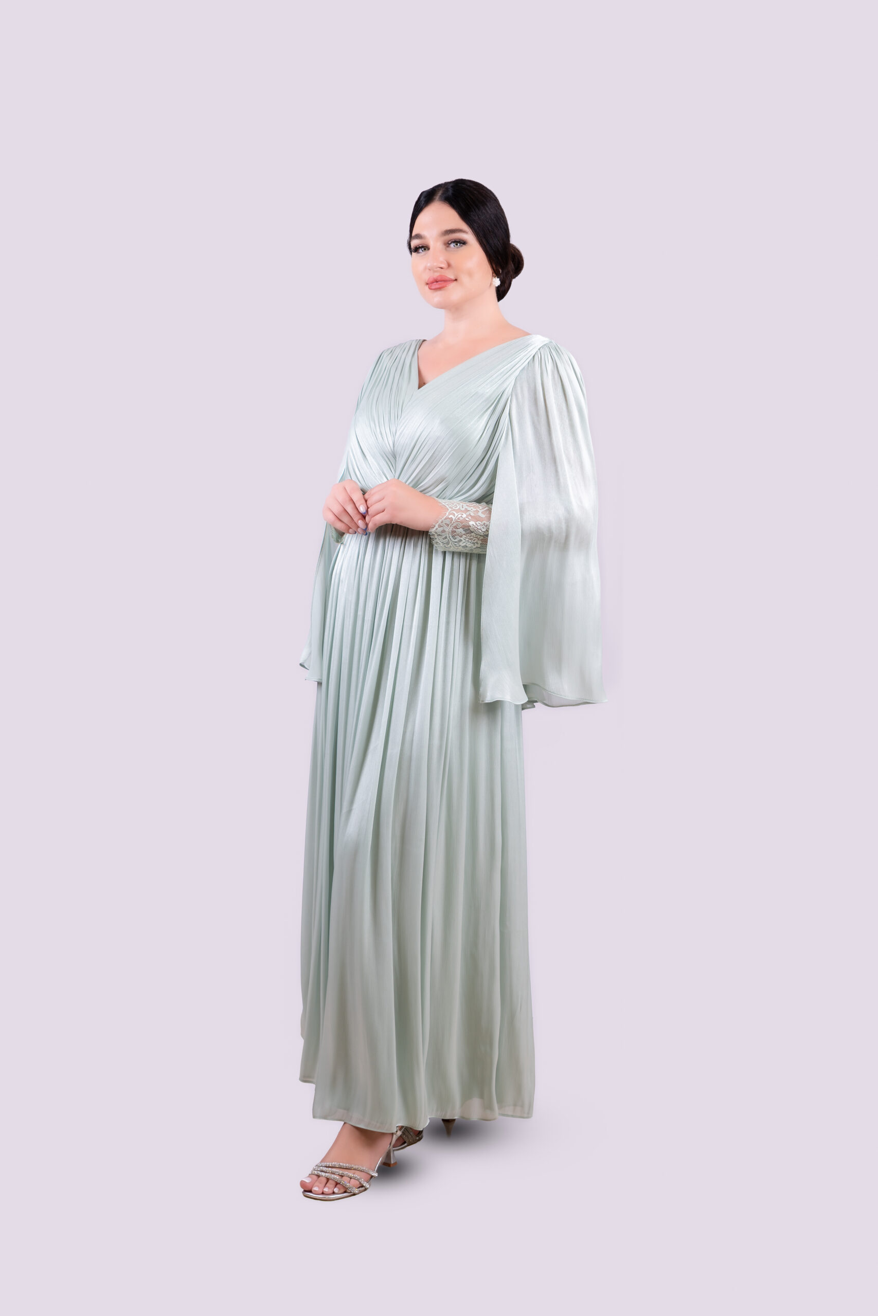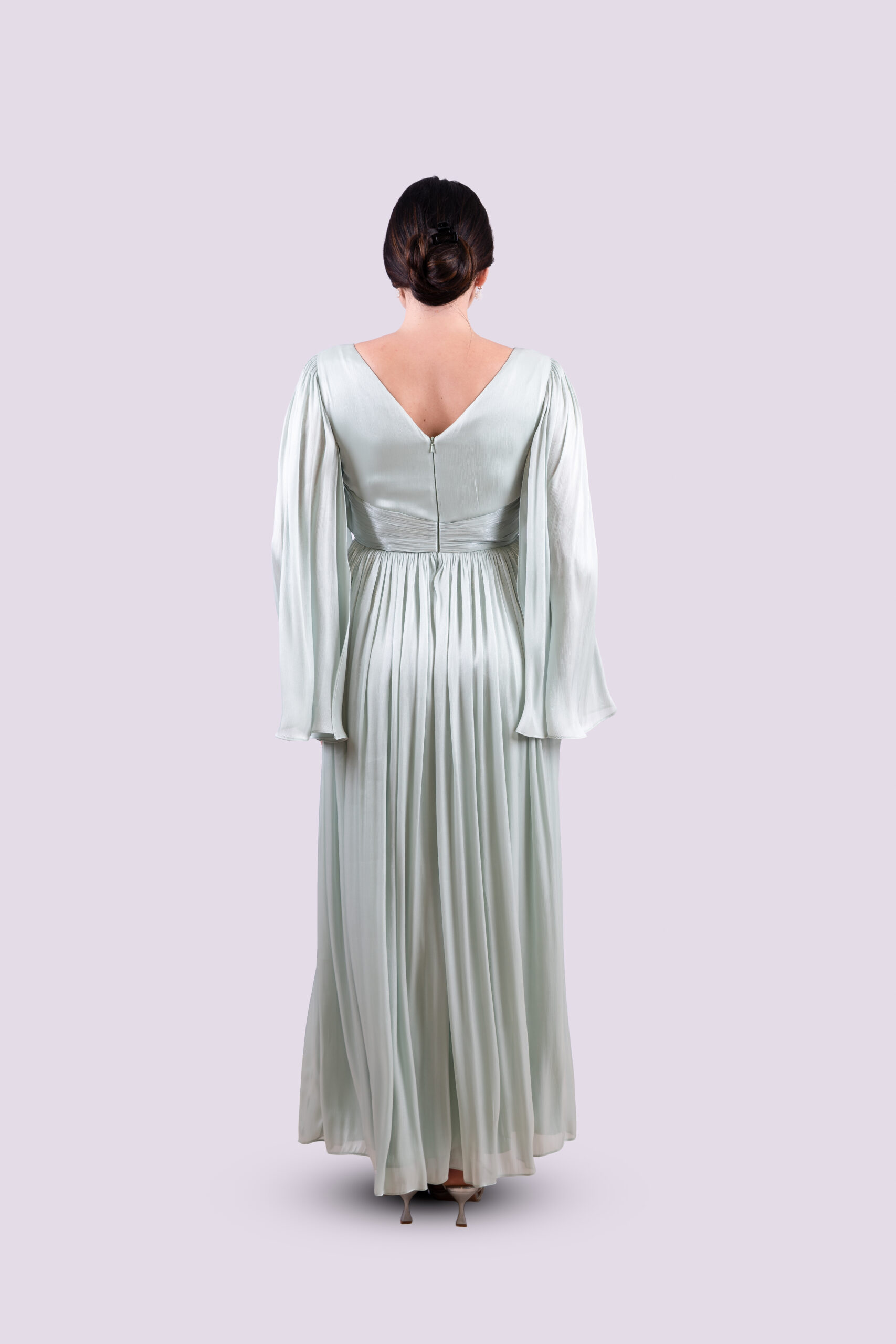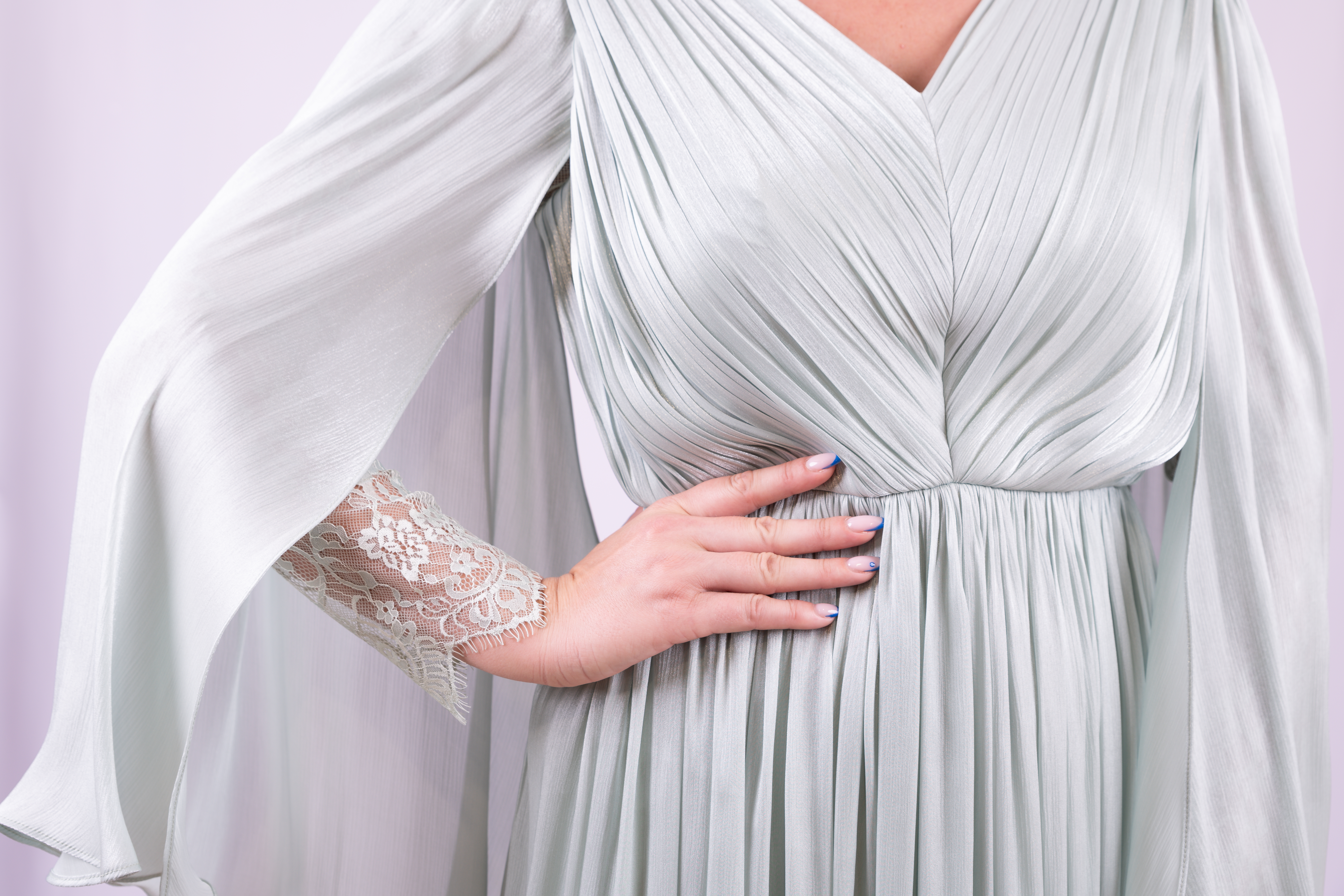 A gracefully pleated gown in a soft rosie hue, defined by its dramatic open sleeves with a delicate lace interior.