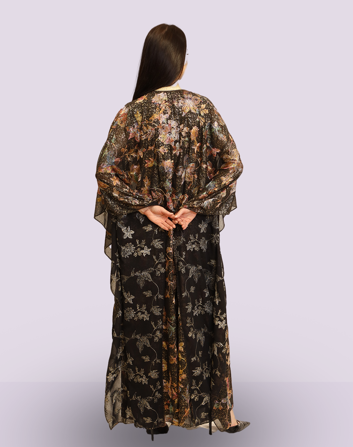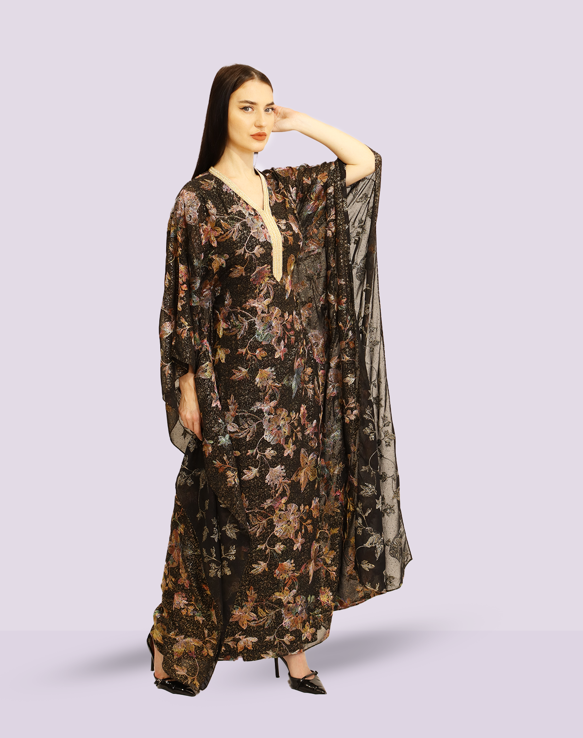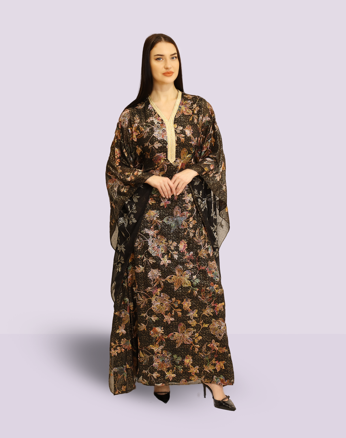 A captivating black kaftan adorned with subtle floral patterns and a hint of shimmer, perfect for evening elegance.
