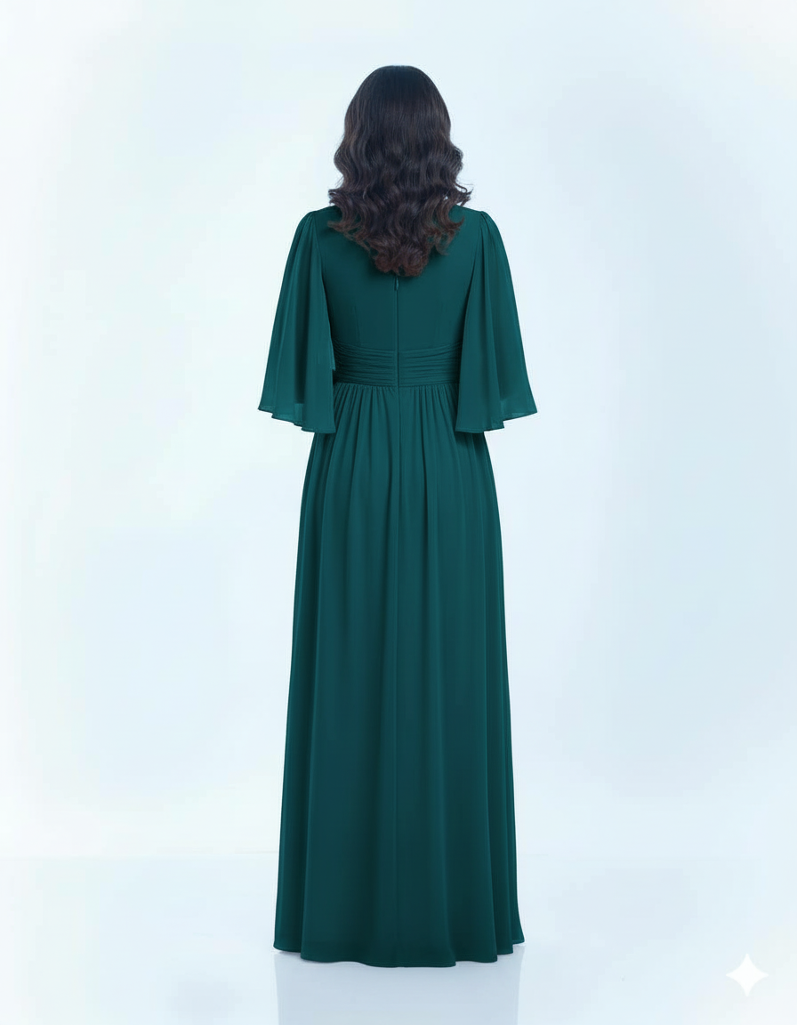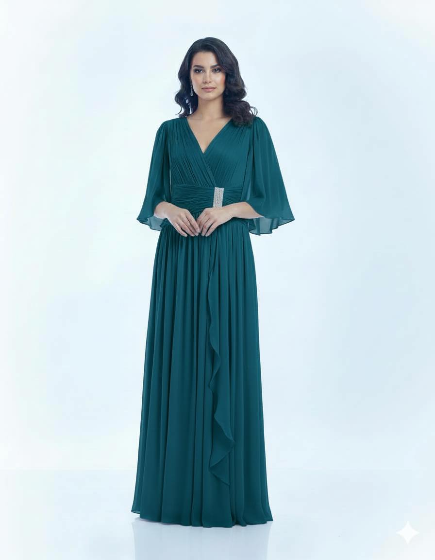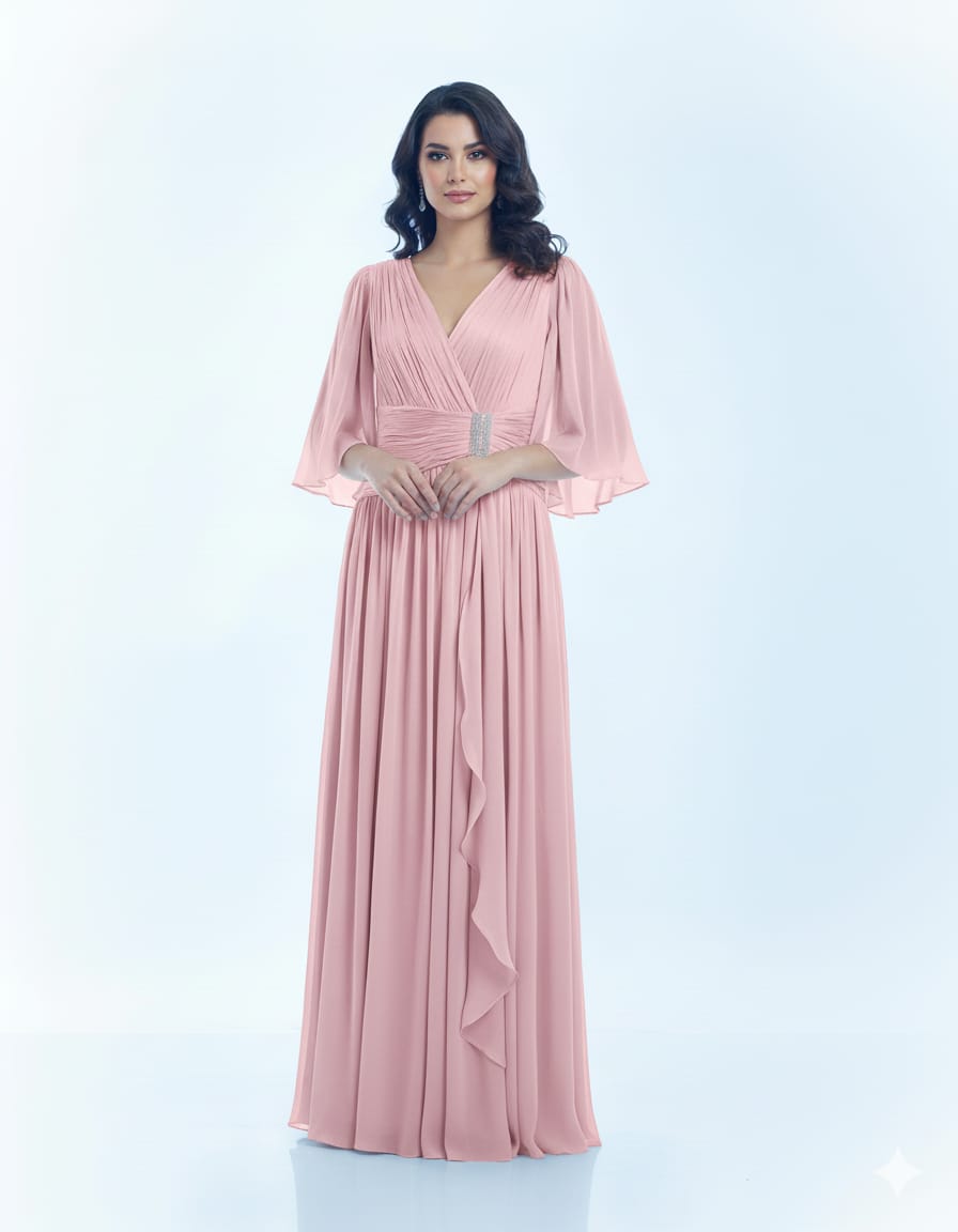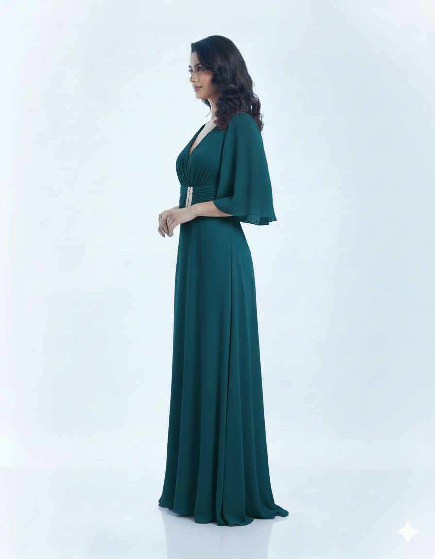 Elegant gown with flowing sleeves and a sparkling waist detail.