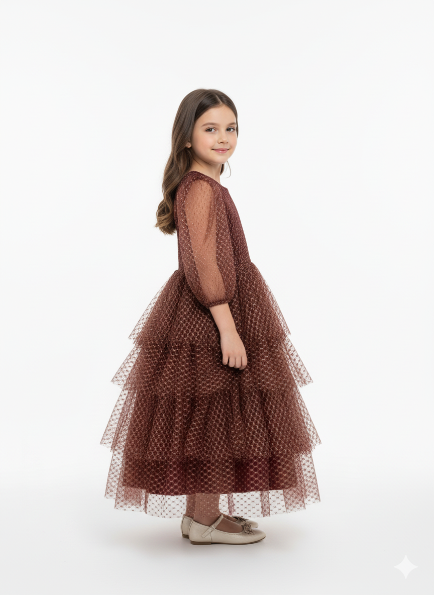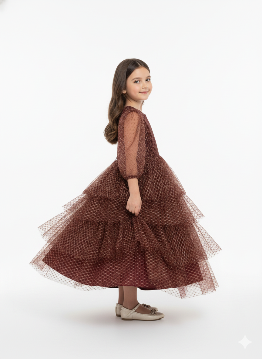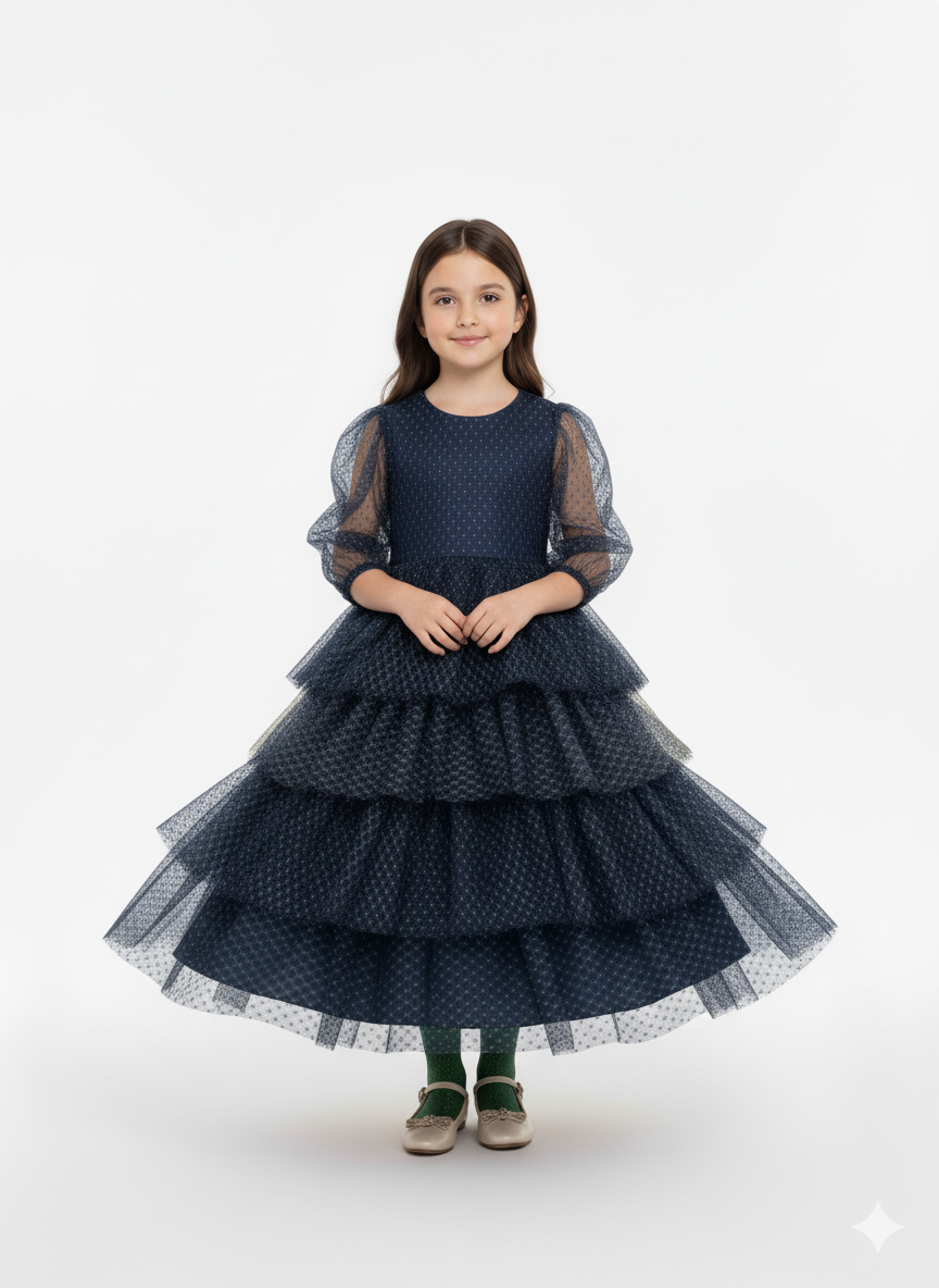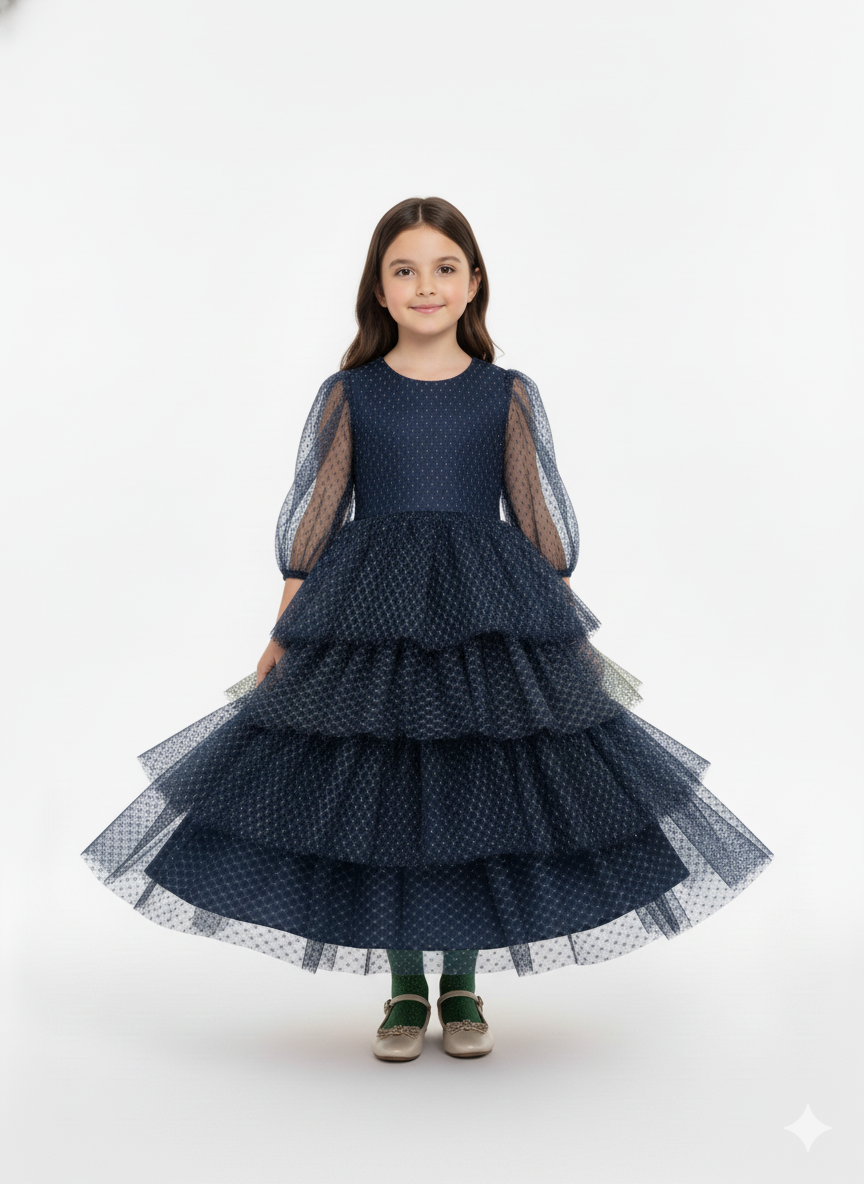 This navy blue children’s dress features a tiered tulle skirt, sheer patterned sleeves, and gold metallic accents.