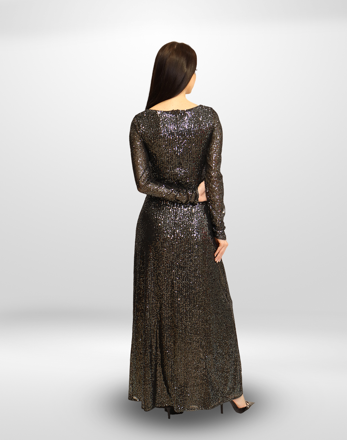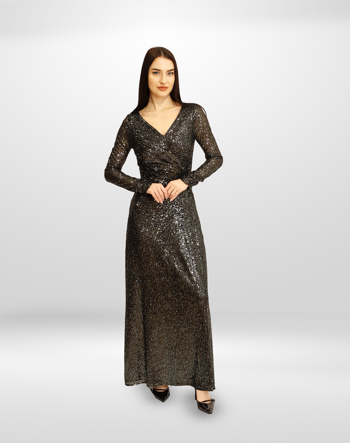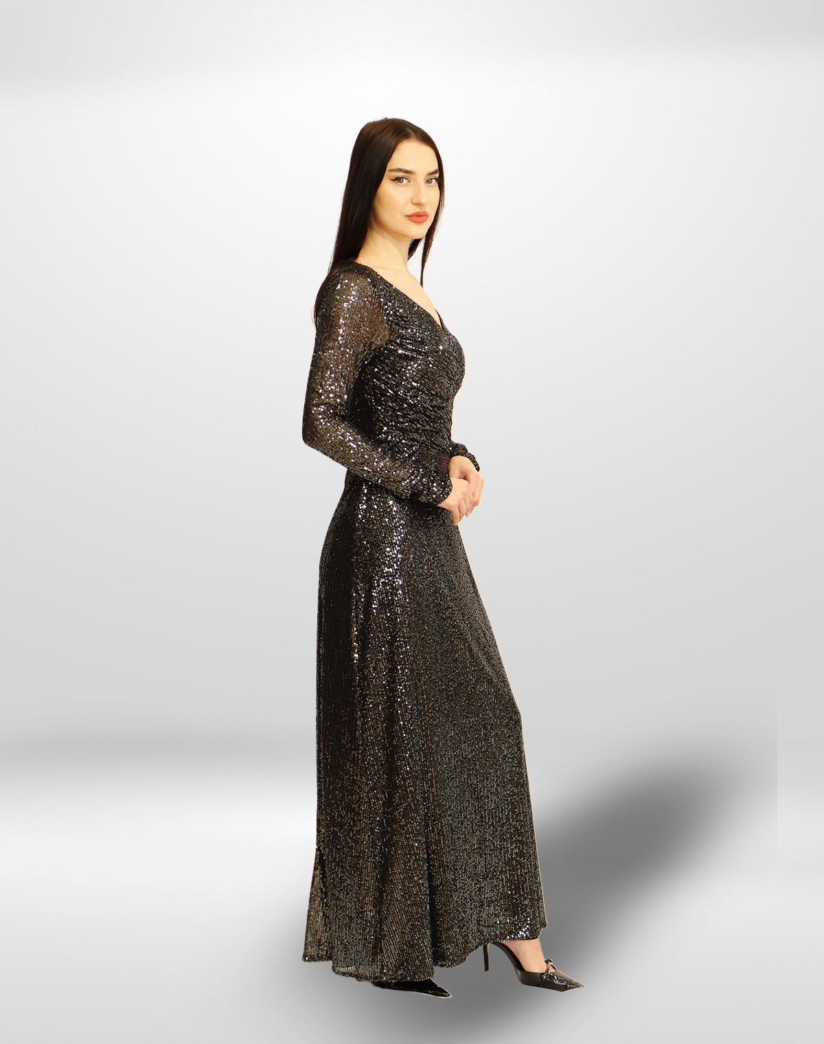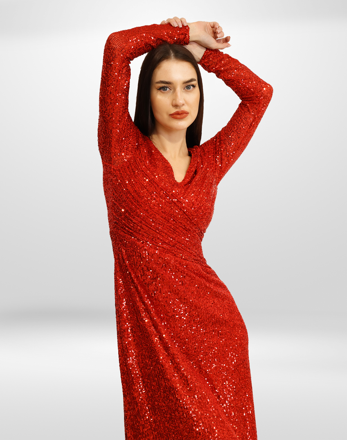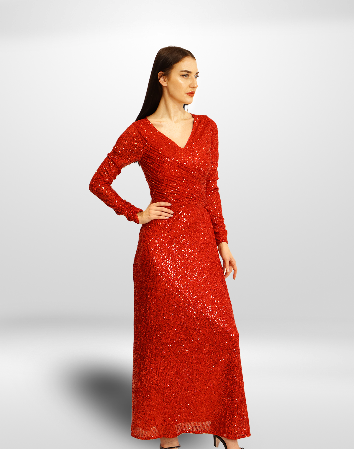 This dazzling red sequin gown features a flattering V-neckline and long sleeves, exuding elegance and glamour.