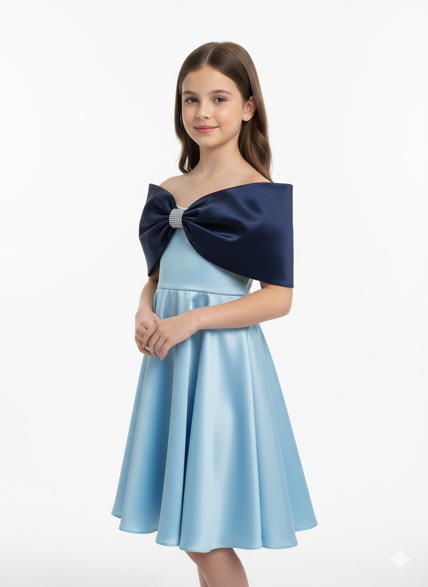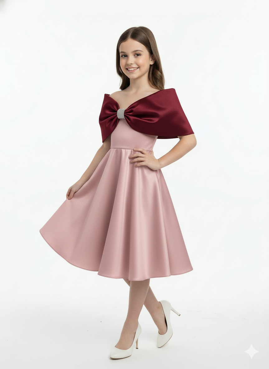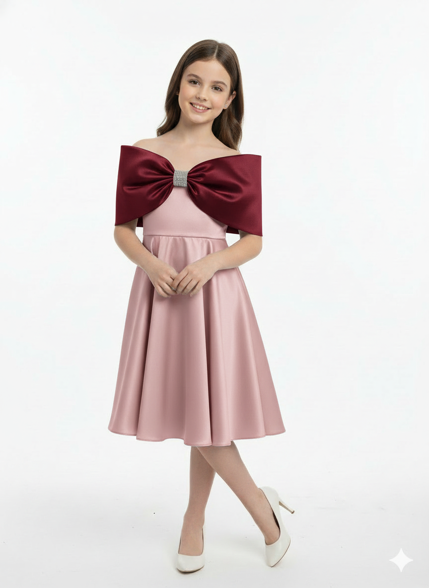 pink satin wrap-style dress featuring a striking, oversized burgundy double bow across the chest.