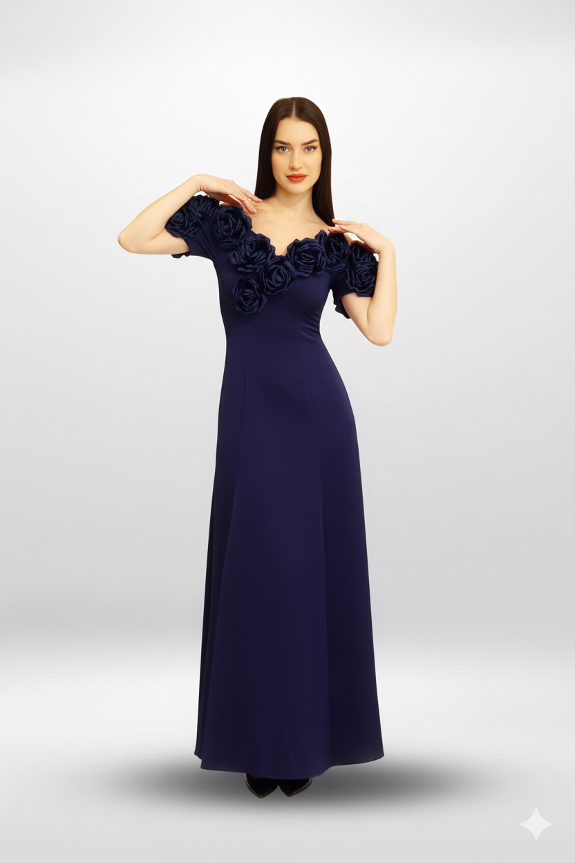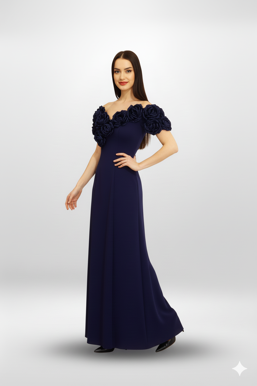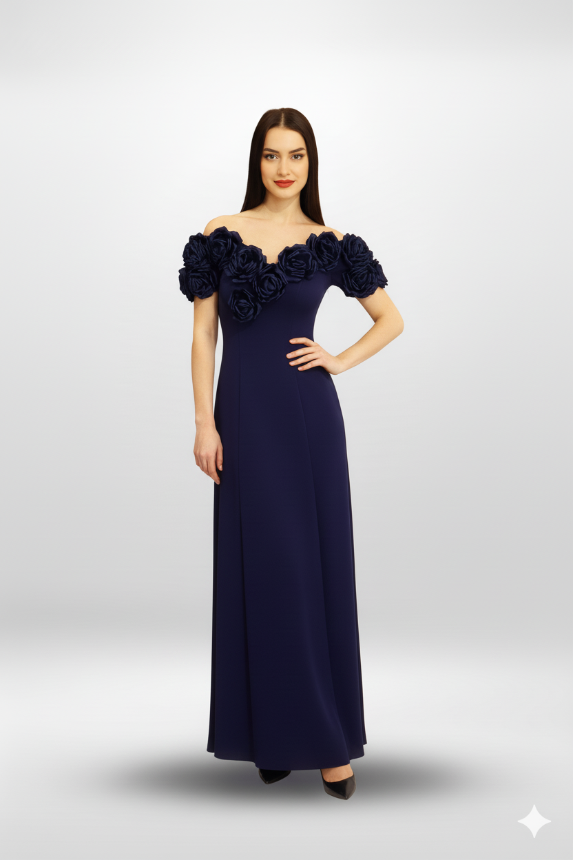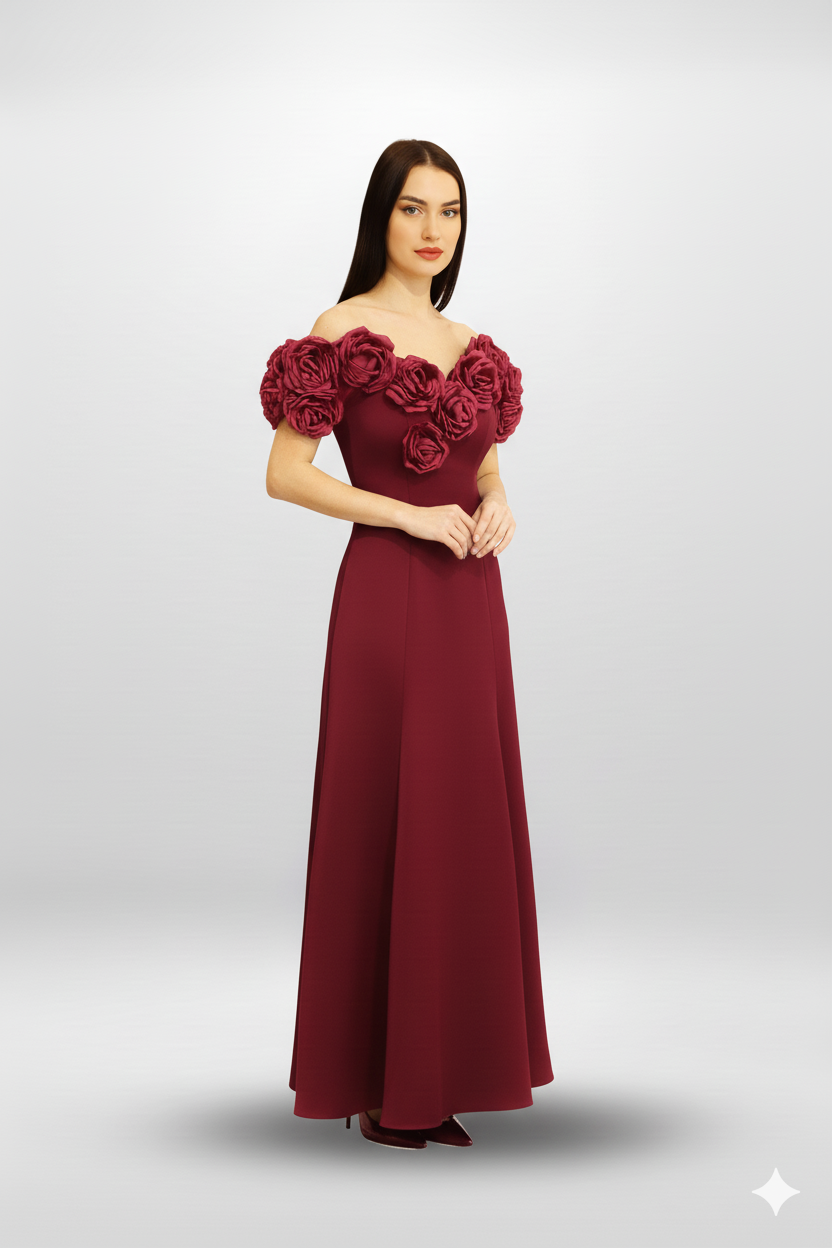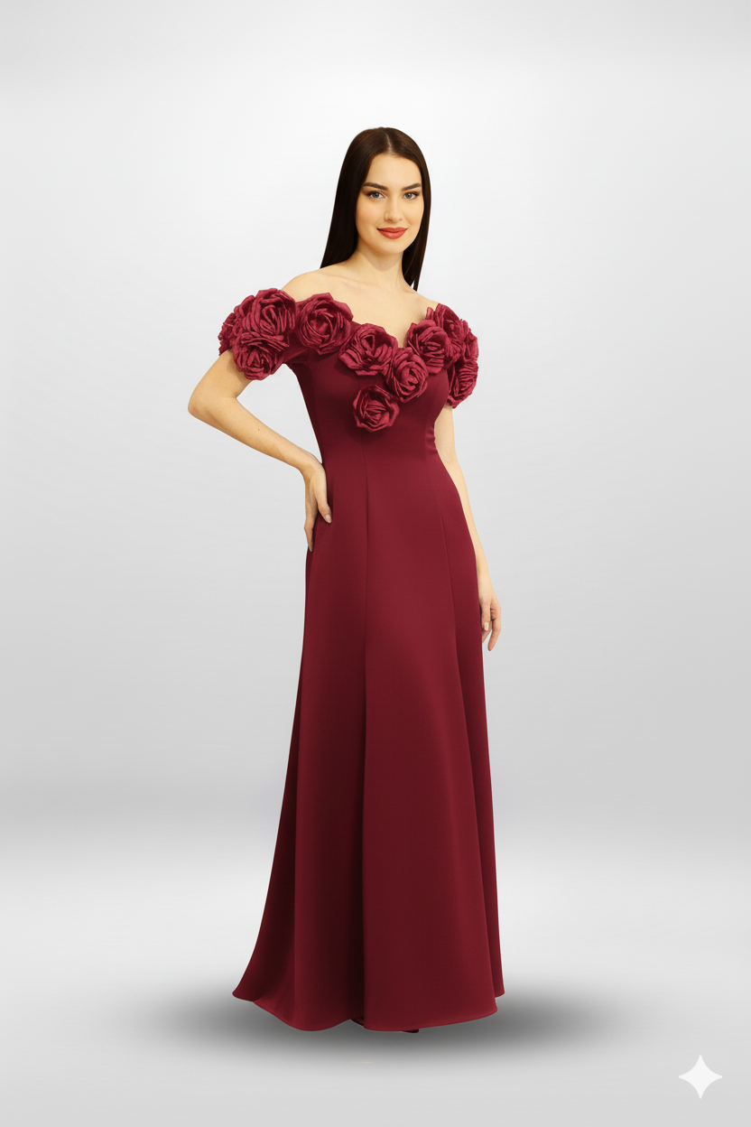 This elegant off-the-shoulder gown features beautiful rose detailing on the sleeves.