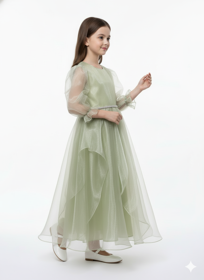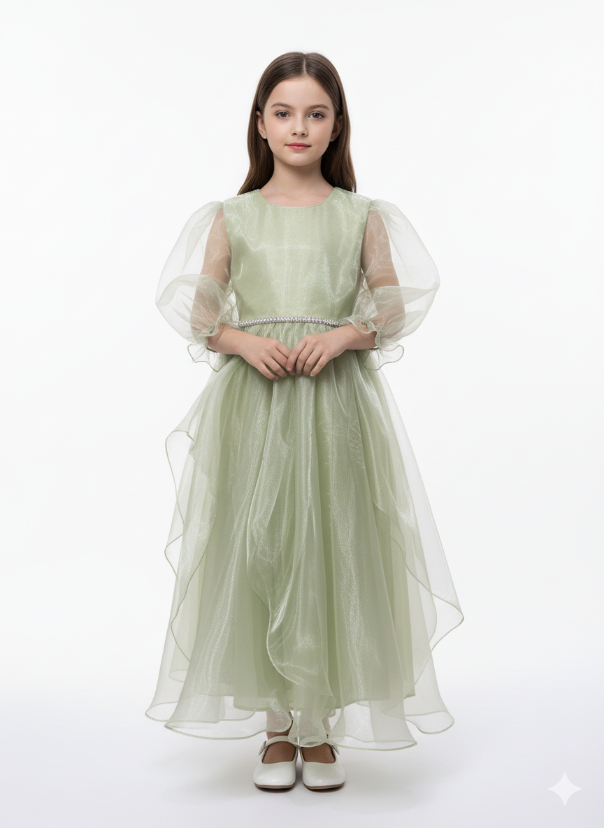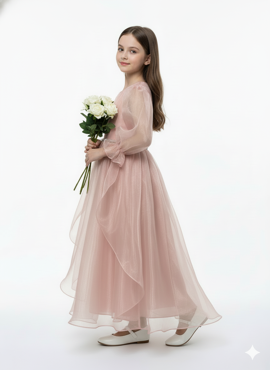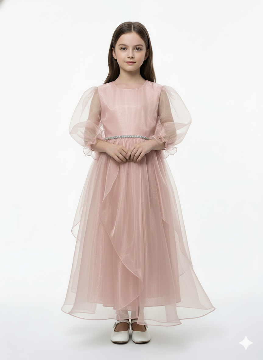 : A whimsical pink party dress featuring dramatic sheer puff sleeves and a voluminous high-low tiered organza skirt.
