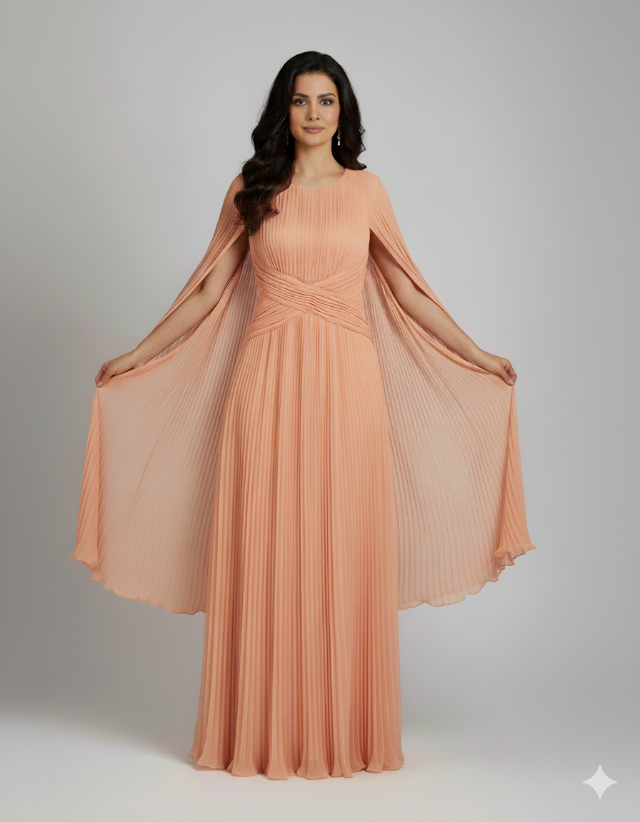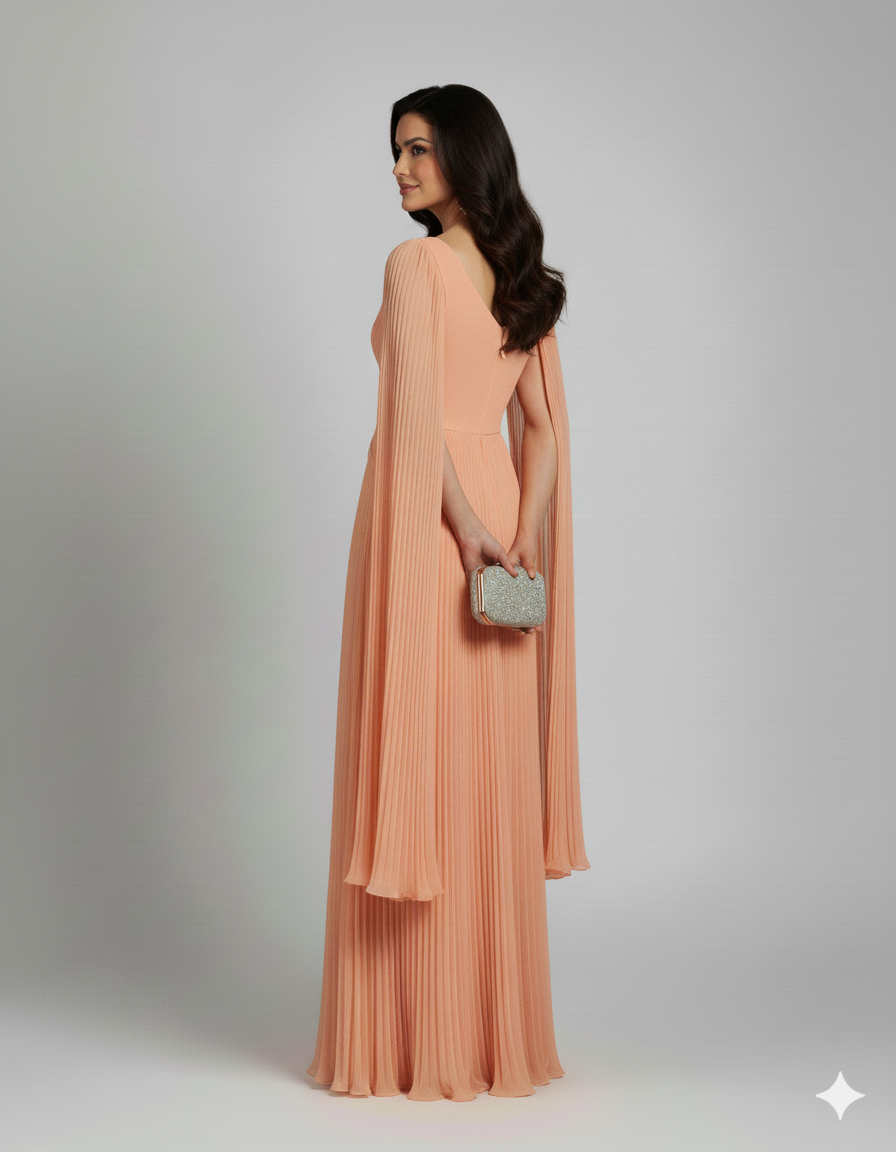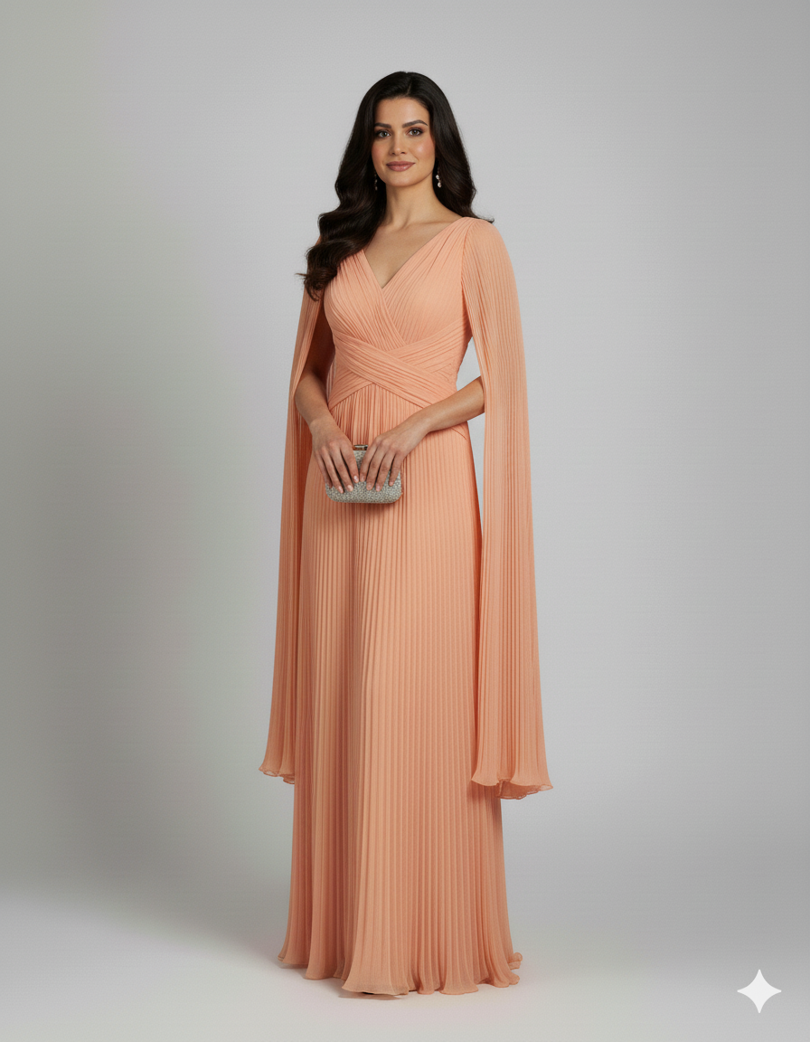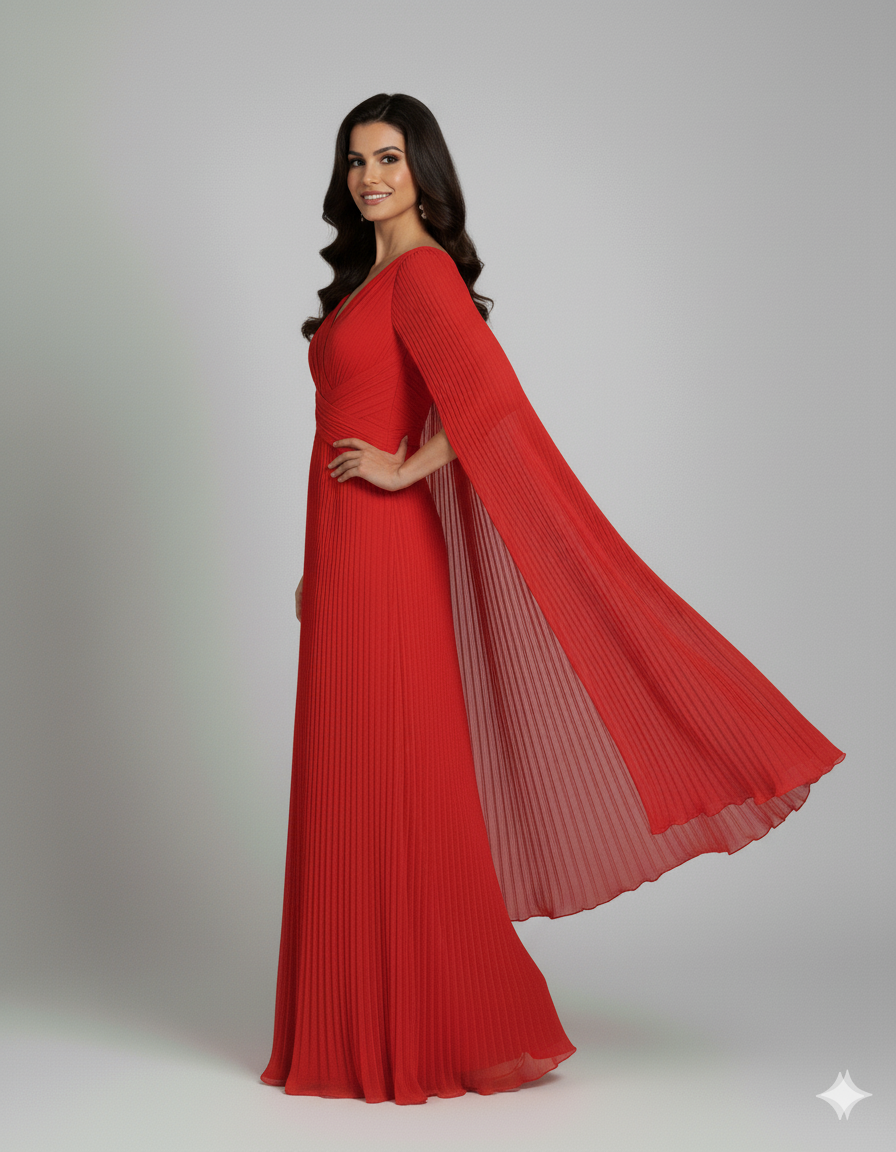 An elegant woman in a flowing red pleated gown with cape-like sleeves.