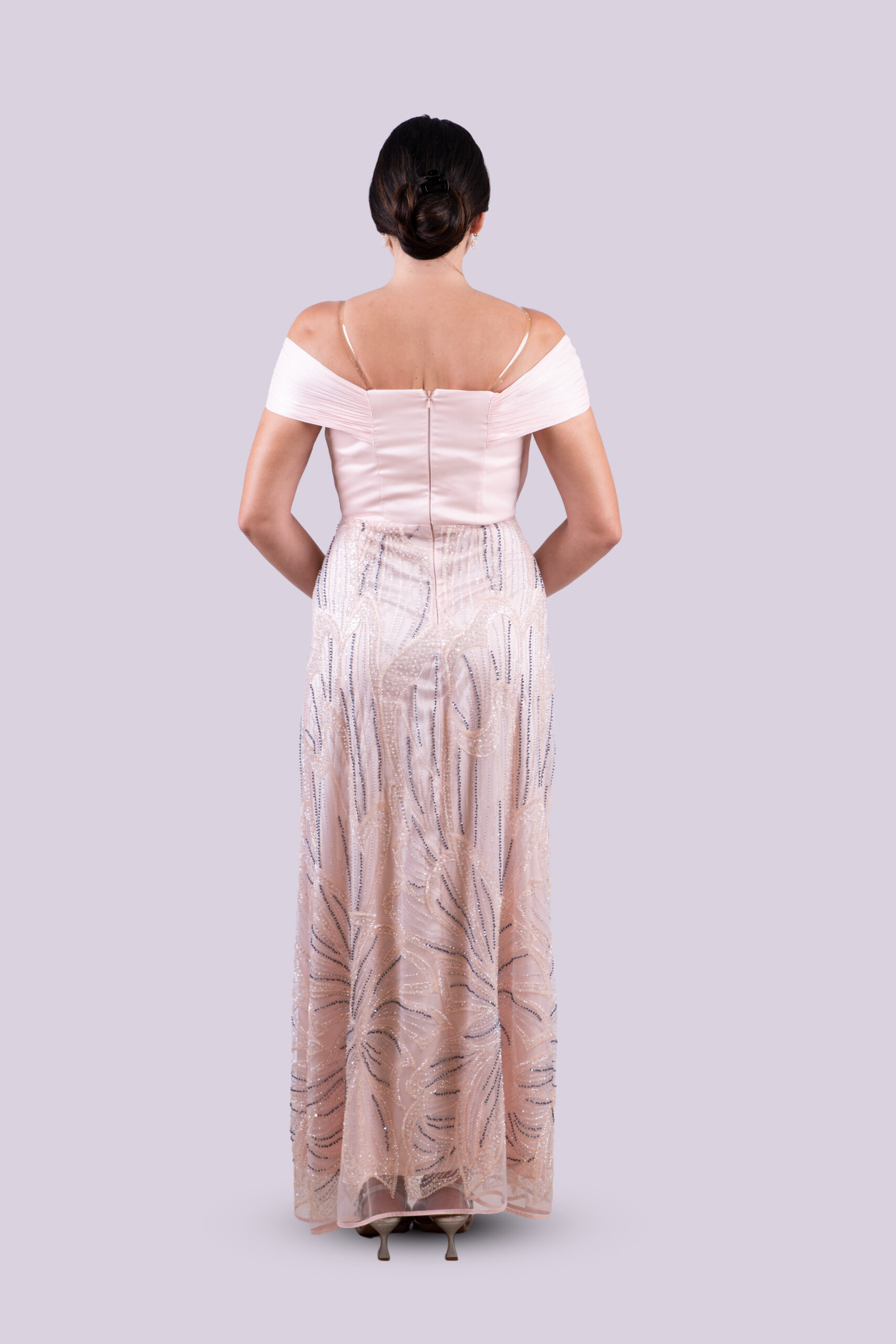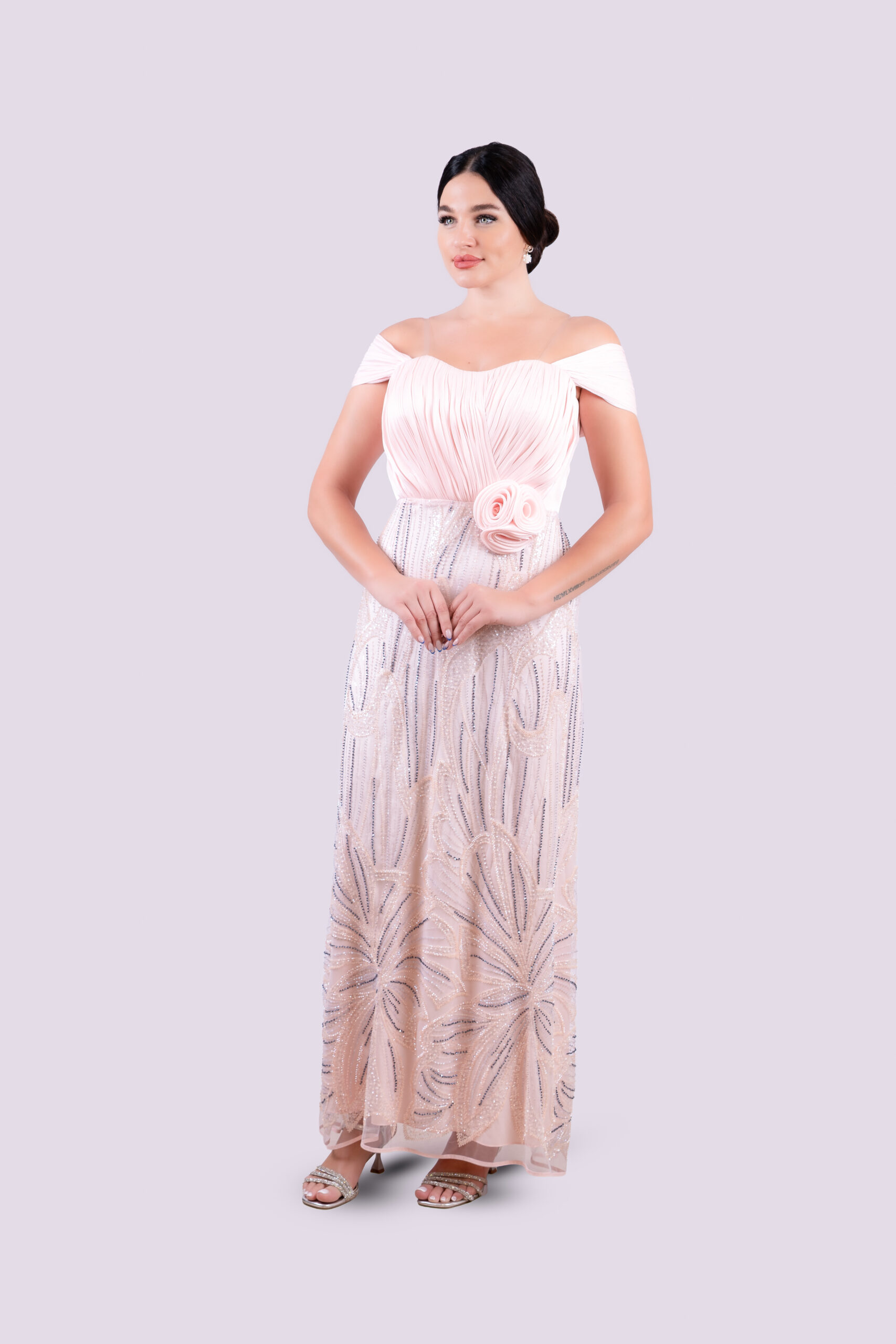 A timeless off-shoulder masterpiece blending rosy luxury with floral artistry and exquisite embroidery.