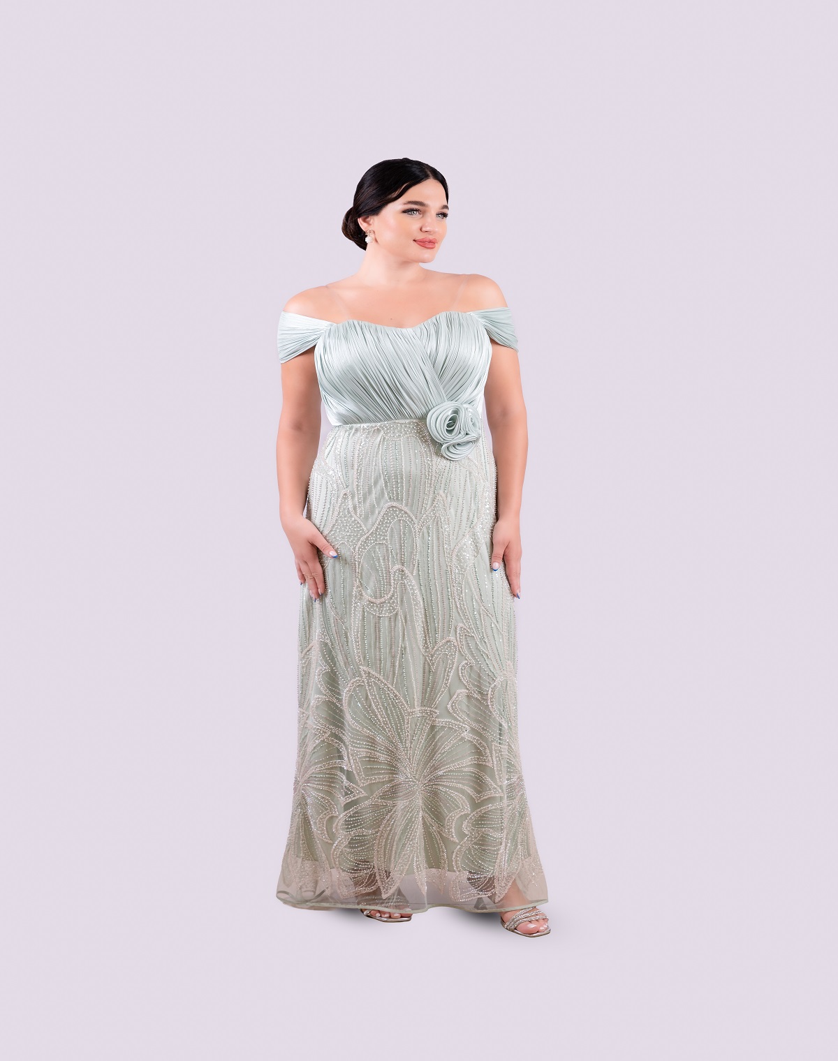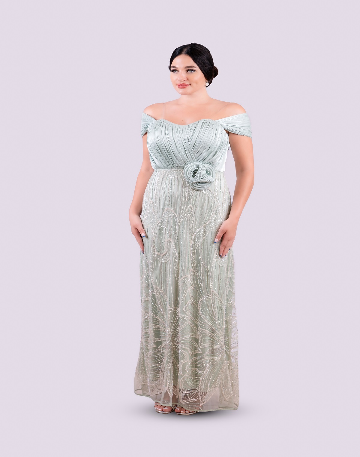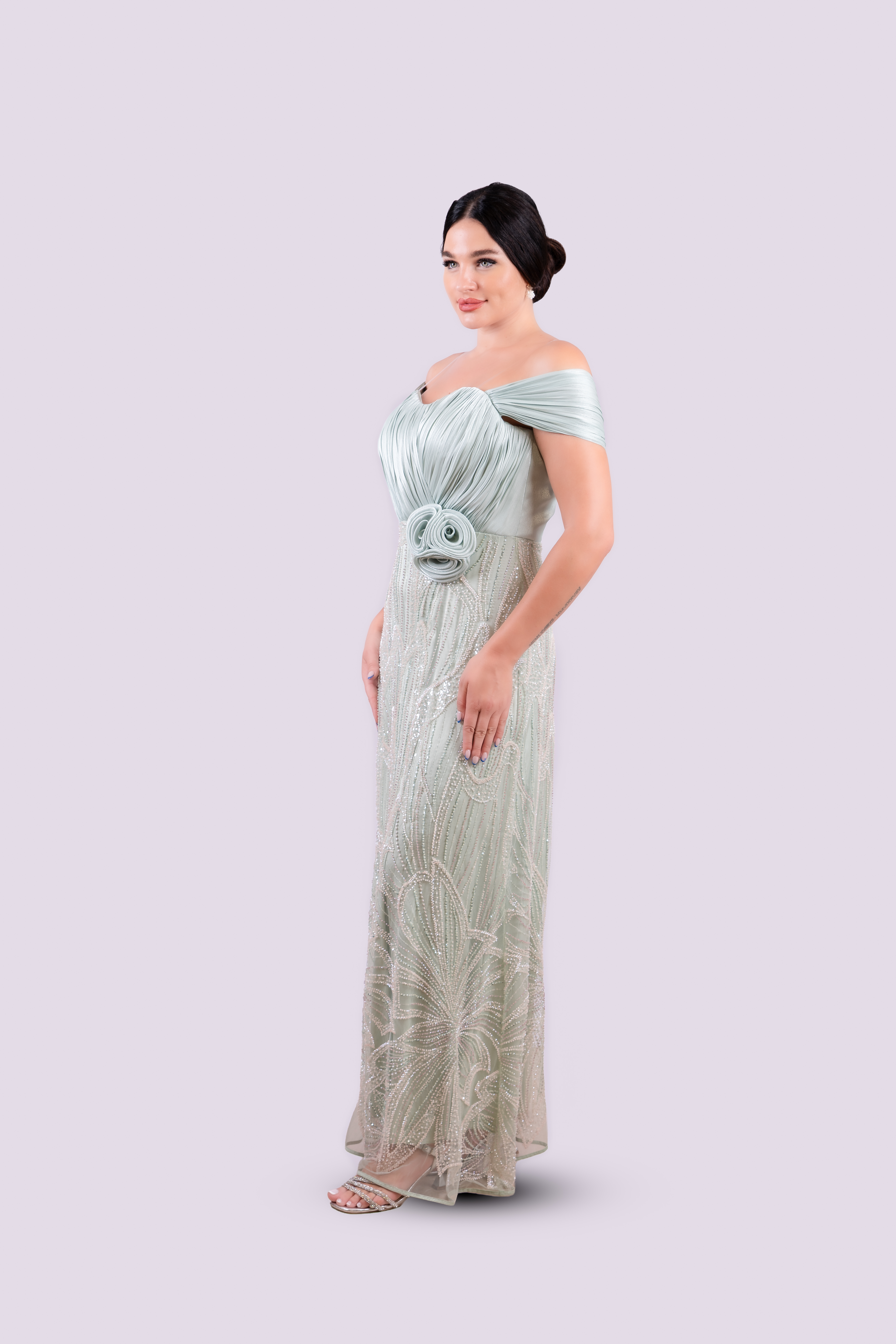 Neckline: Elegant off-shoulder cut highlighting the collarbone.