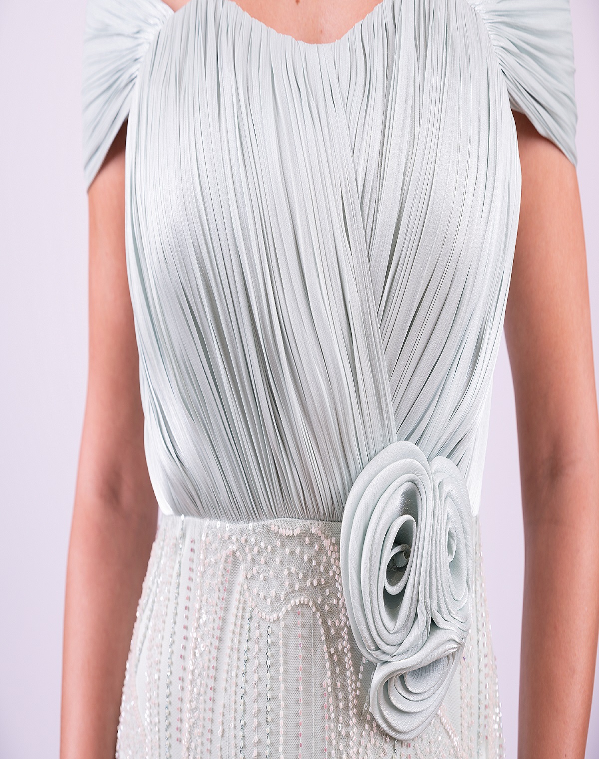 Side Accent: 3D flower detail in matching fabric, adding a couture-inspired touch.