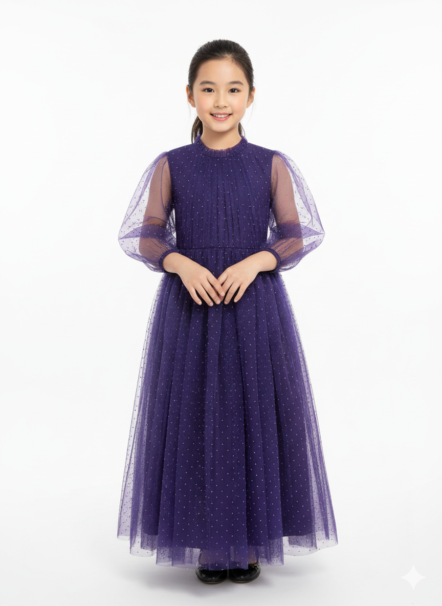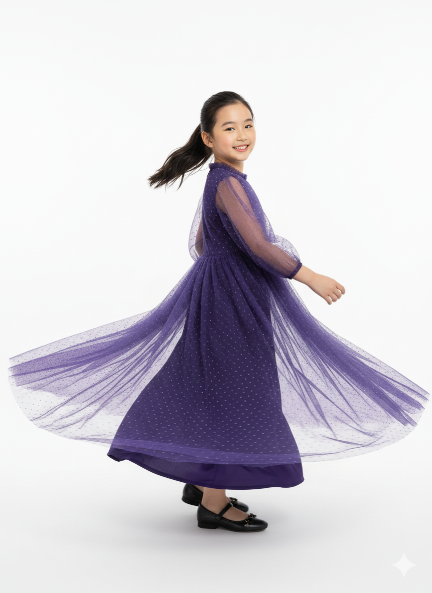 Embellishment:Â Small, evenly spaced Polka Dots (Subtle sparkle or texture, throughout the tulle layers)