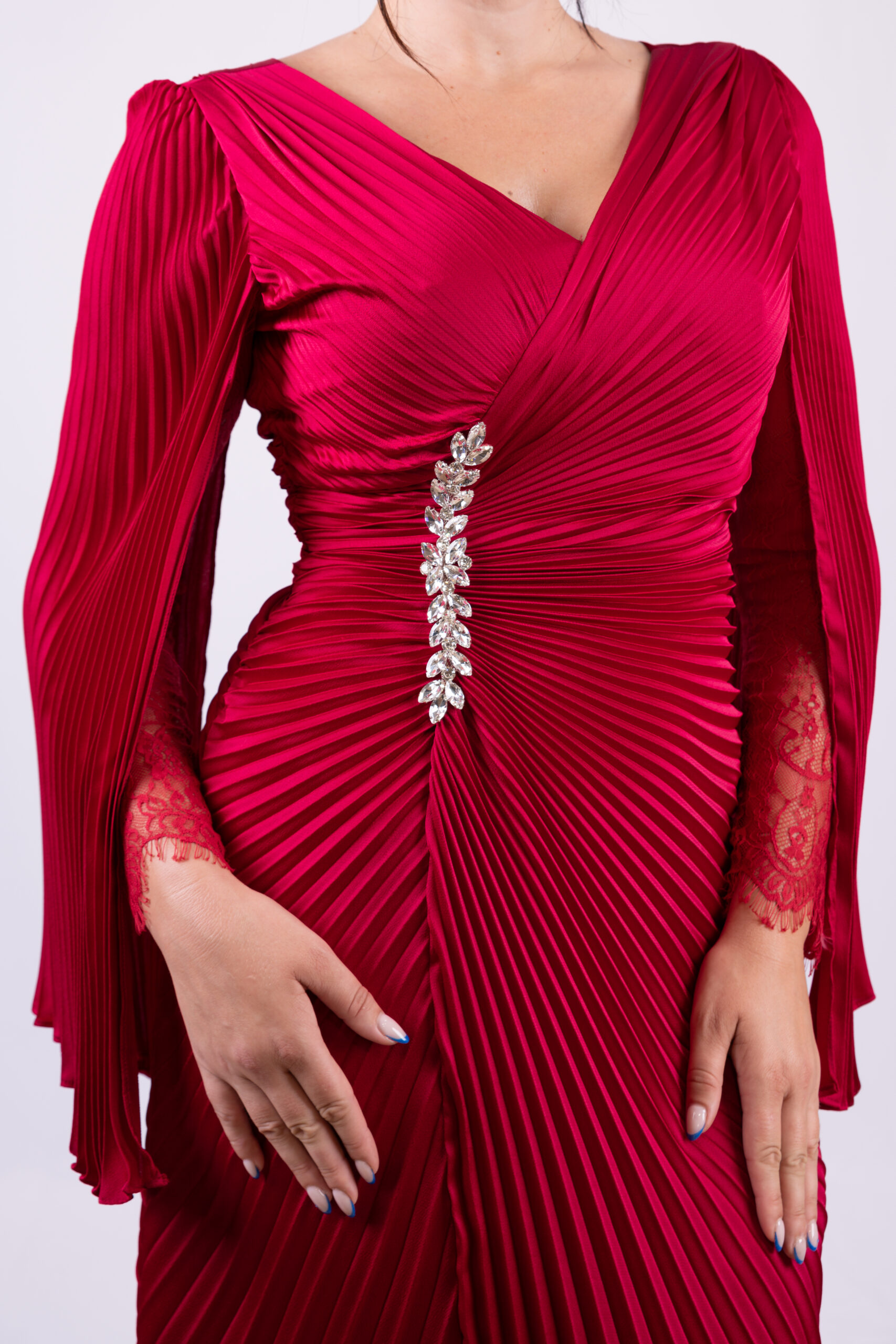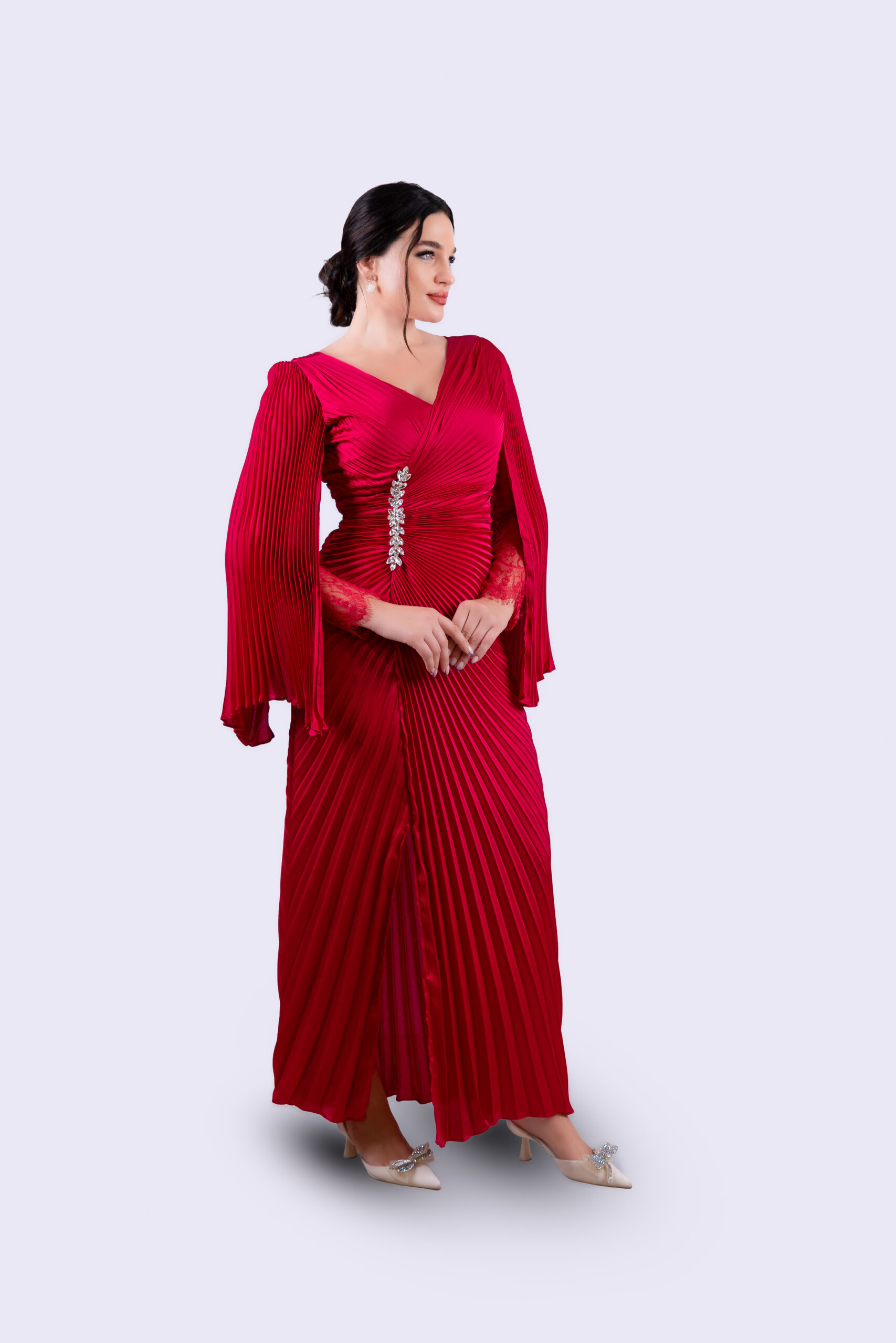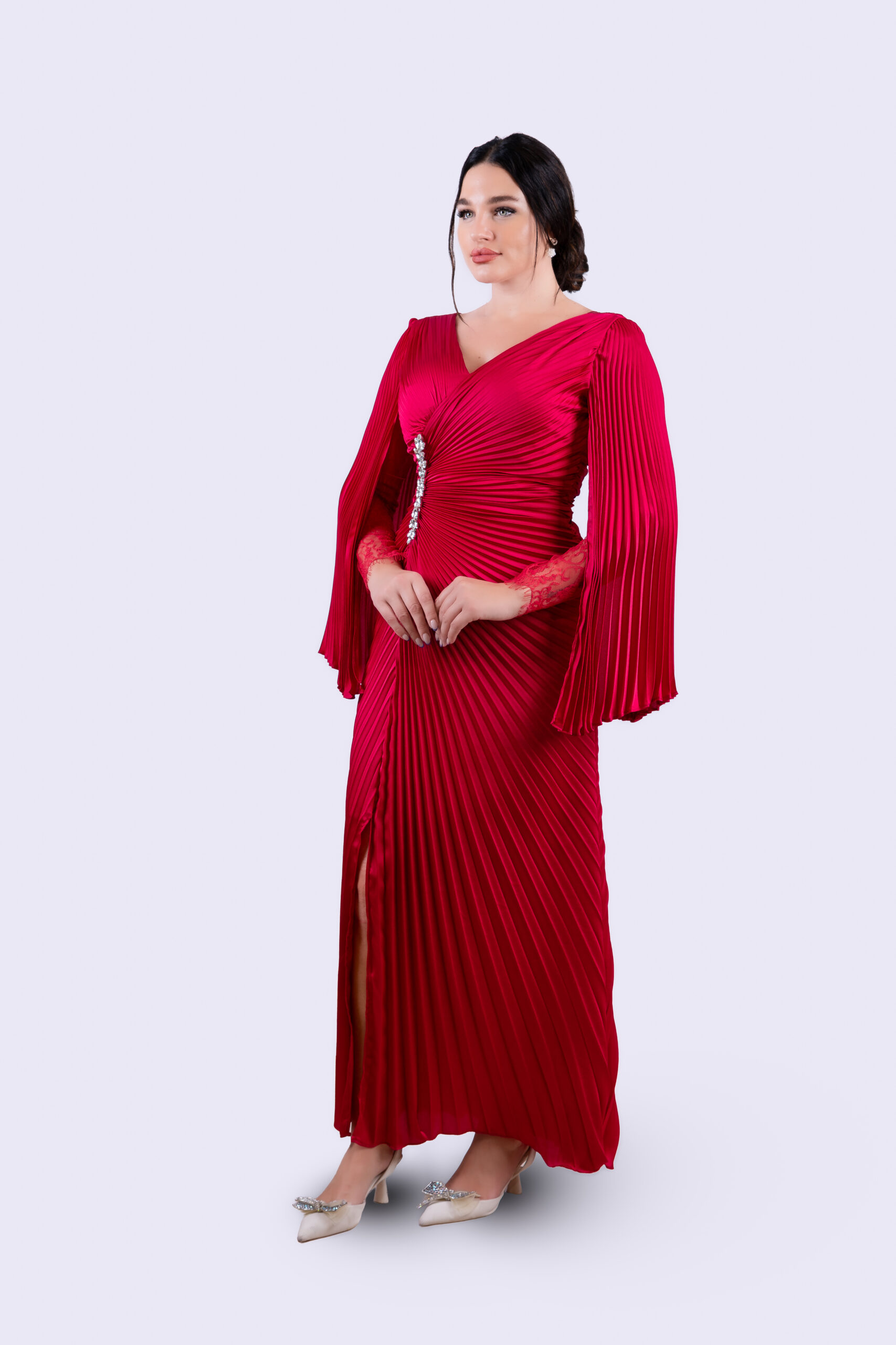 This model is wearing a stunning red pleated gown featuring a sparkling crystal buckle on the side, dramatic open-flowing sleeves, and delicate lace inner sleeves