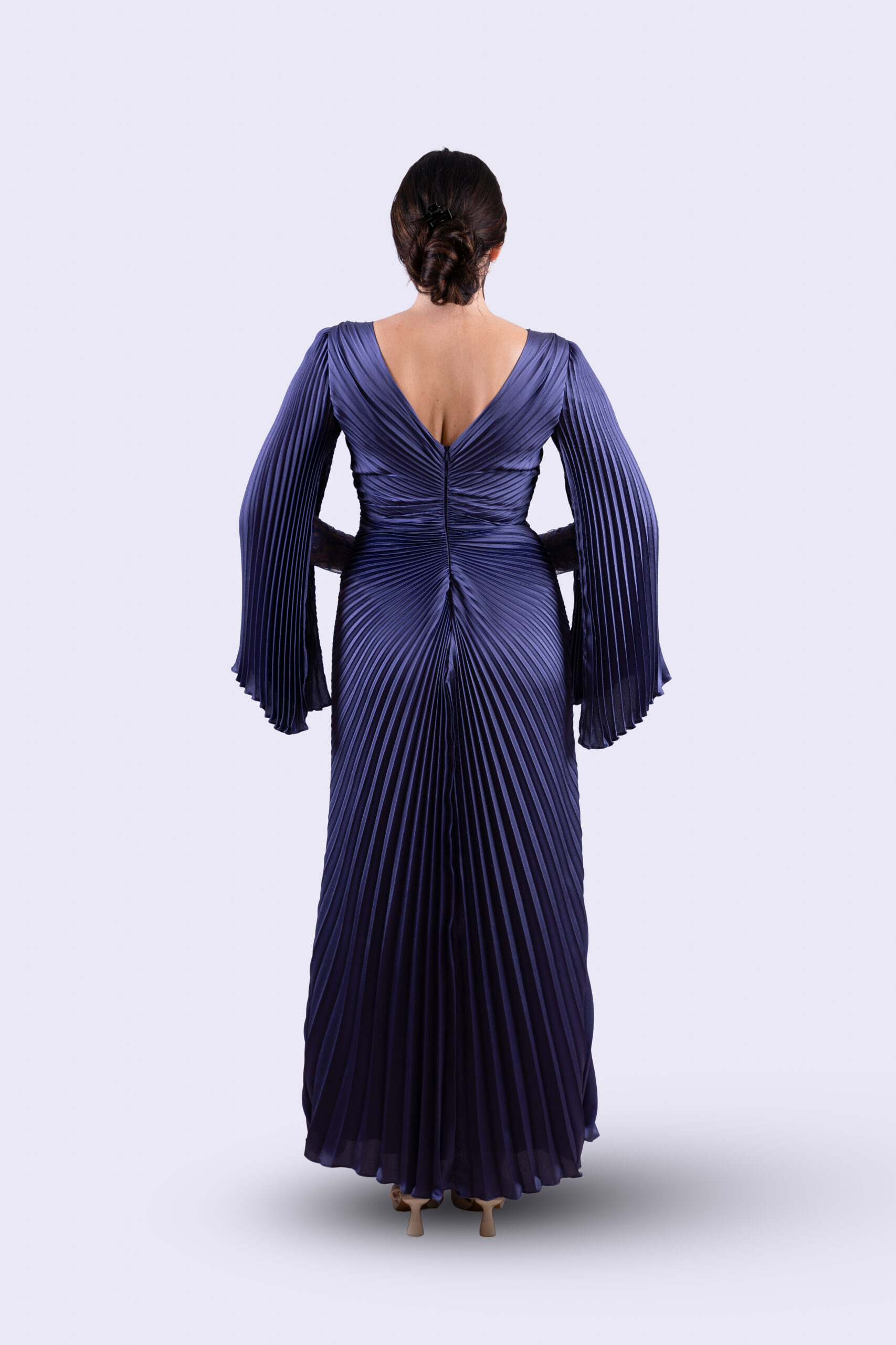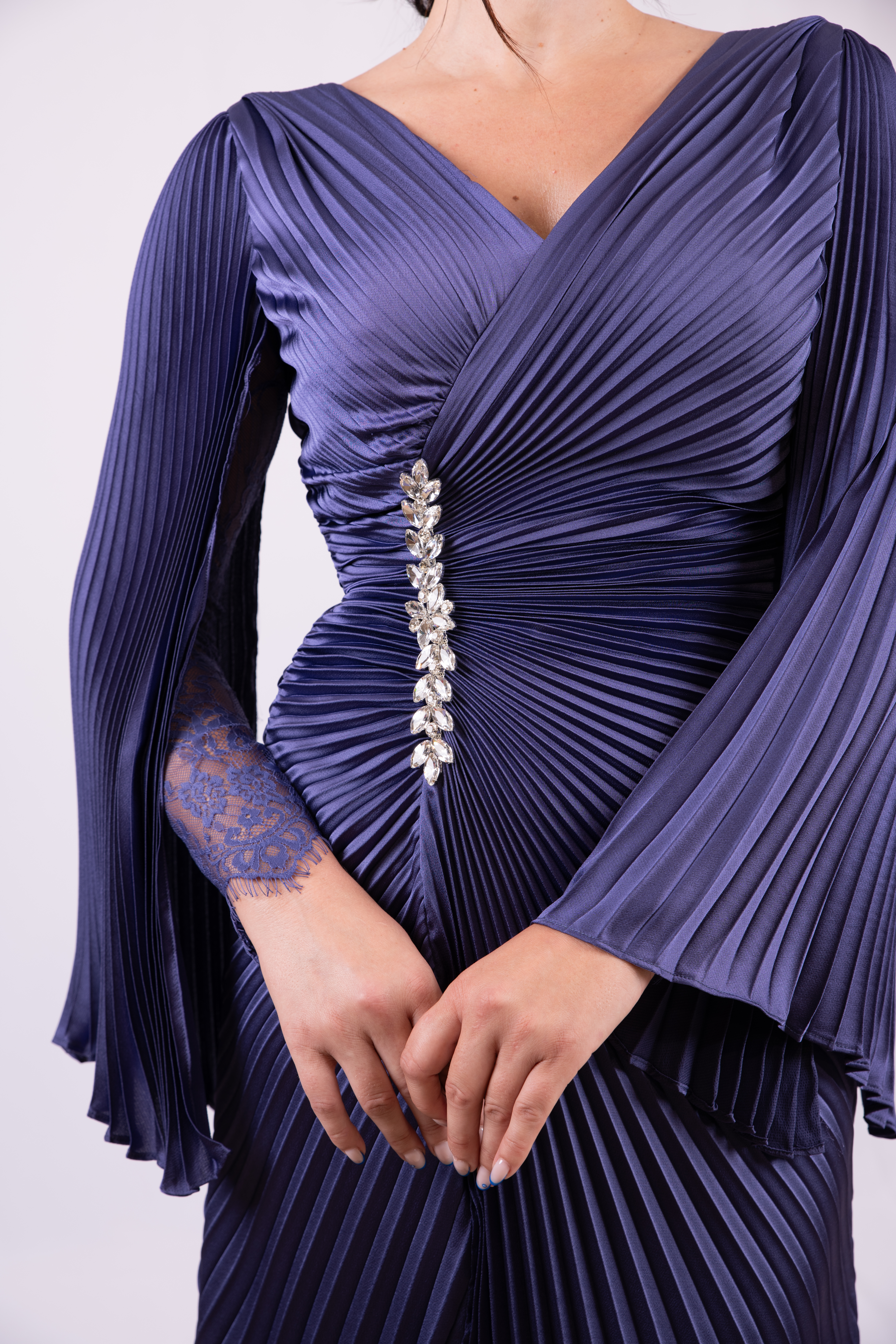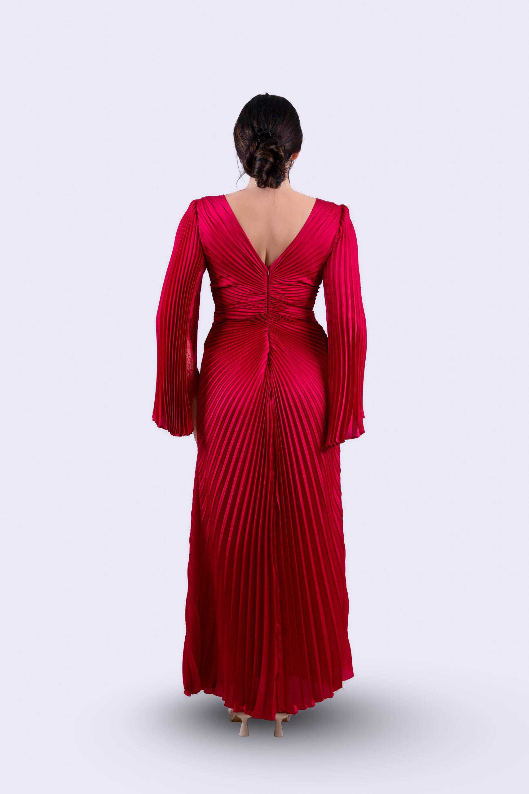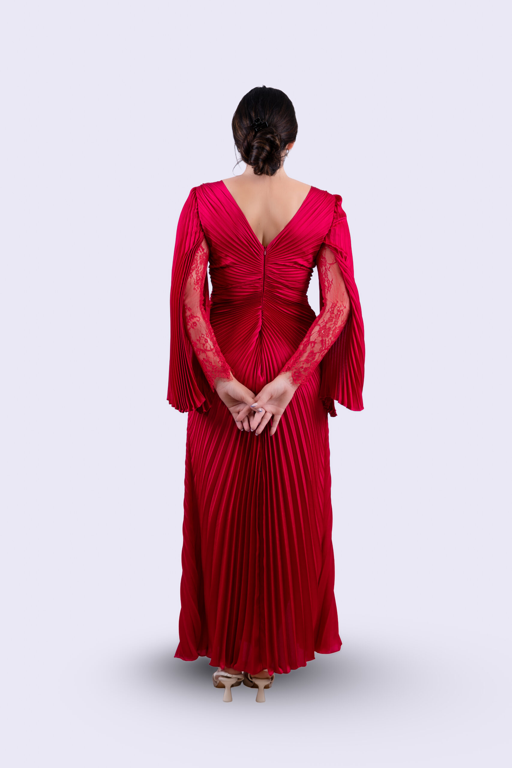 This model is wearing a stunning red pleated gown featuring a sparkling crystal buckle on the side, dramatic open-flowing sleeves, and delicate lace inner sleeves