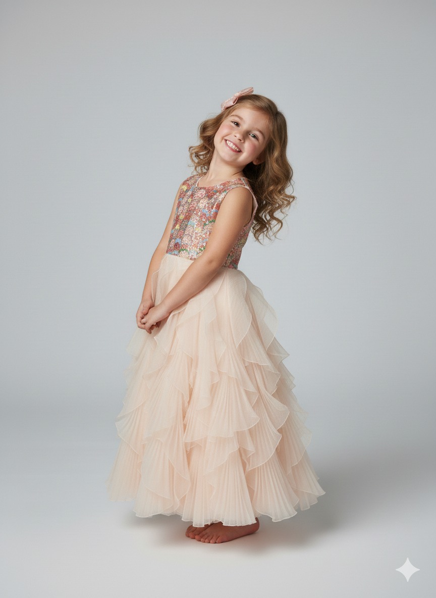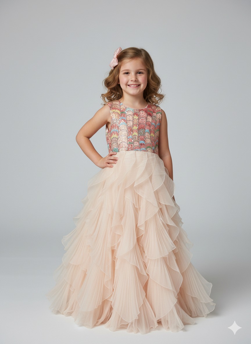 A vibrant sequined bodice paired with a voluminous cascading pleated ruffle skirt in soft peach