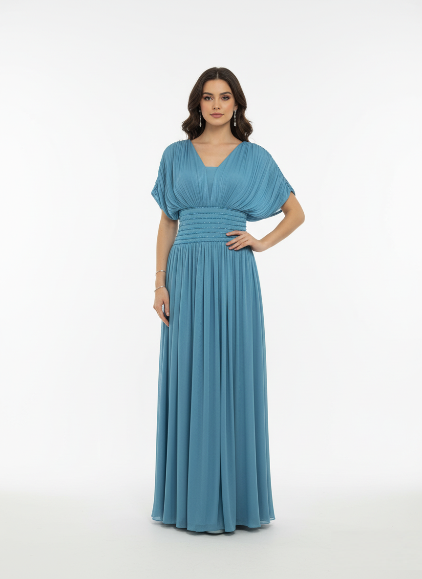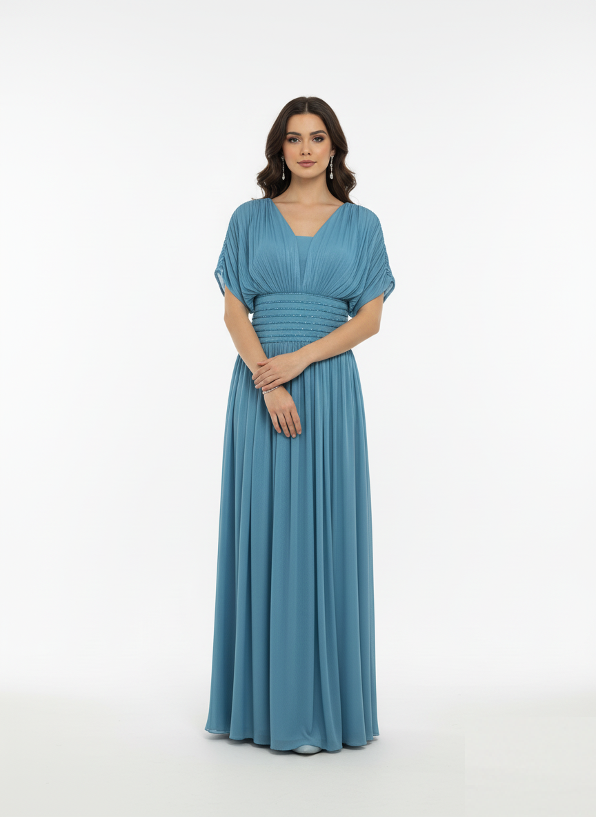 Be the first to review “Slate Blue Beaded Chiffon Gown”