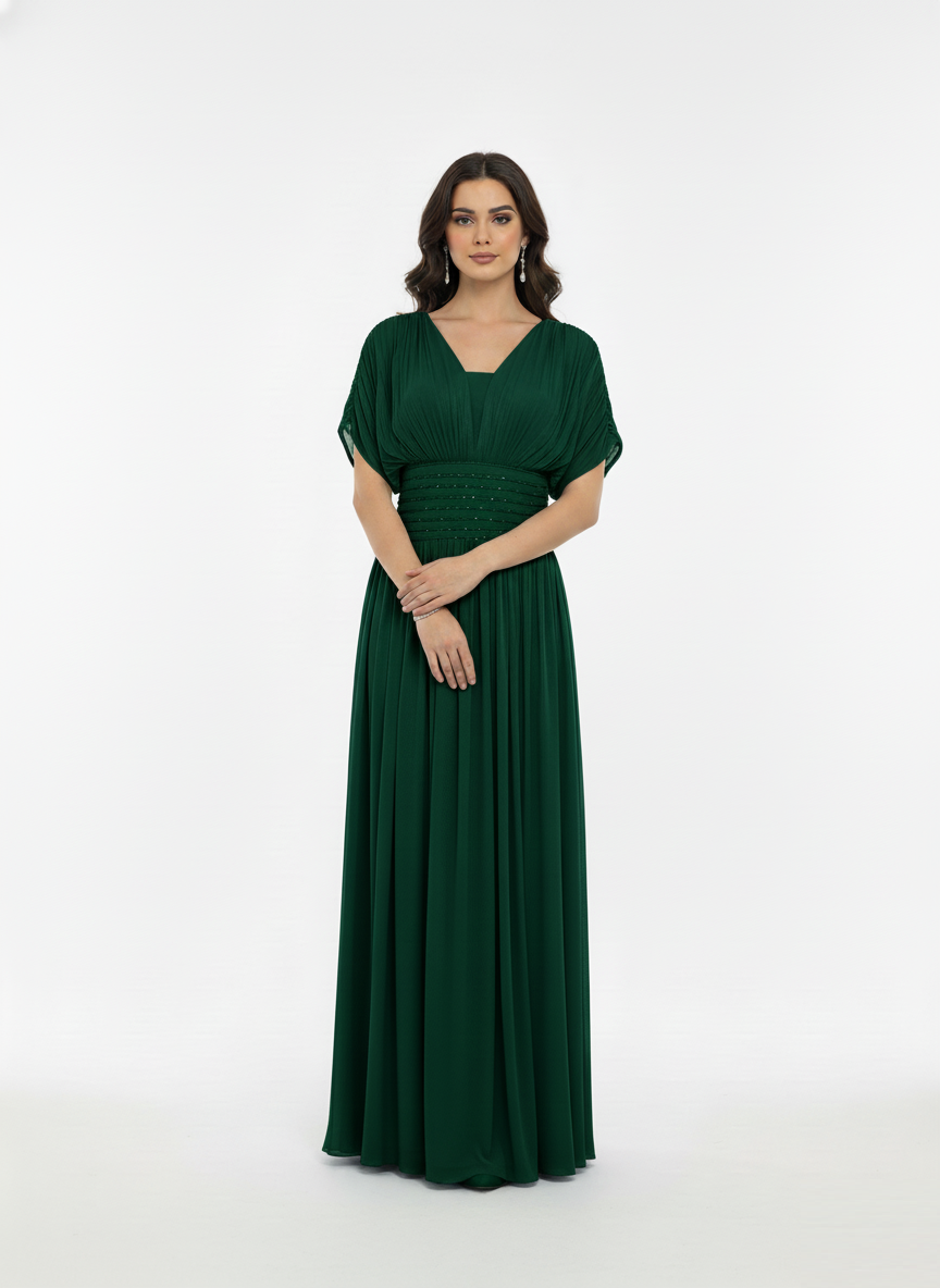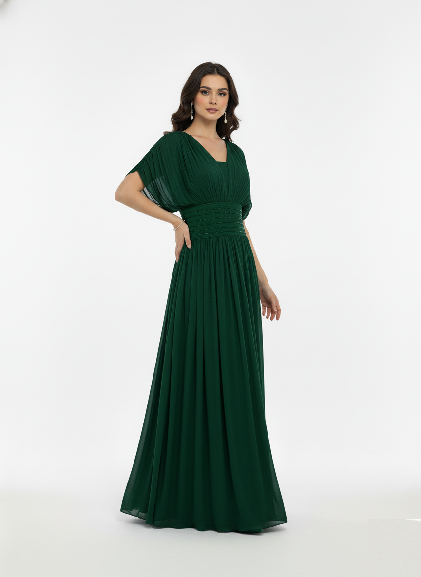 An elegant A-line gown crafted from airy chiffon, featuring a beaded waistband and delicate sheer sleeves.