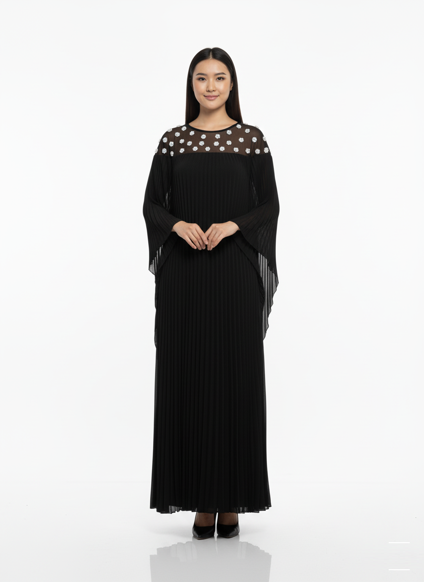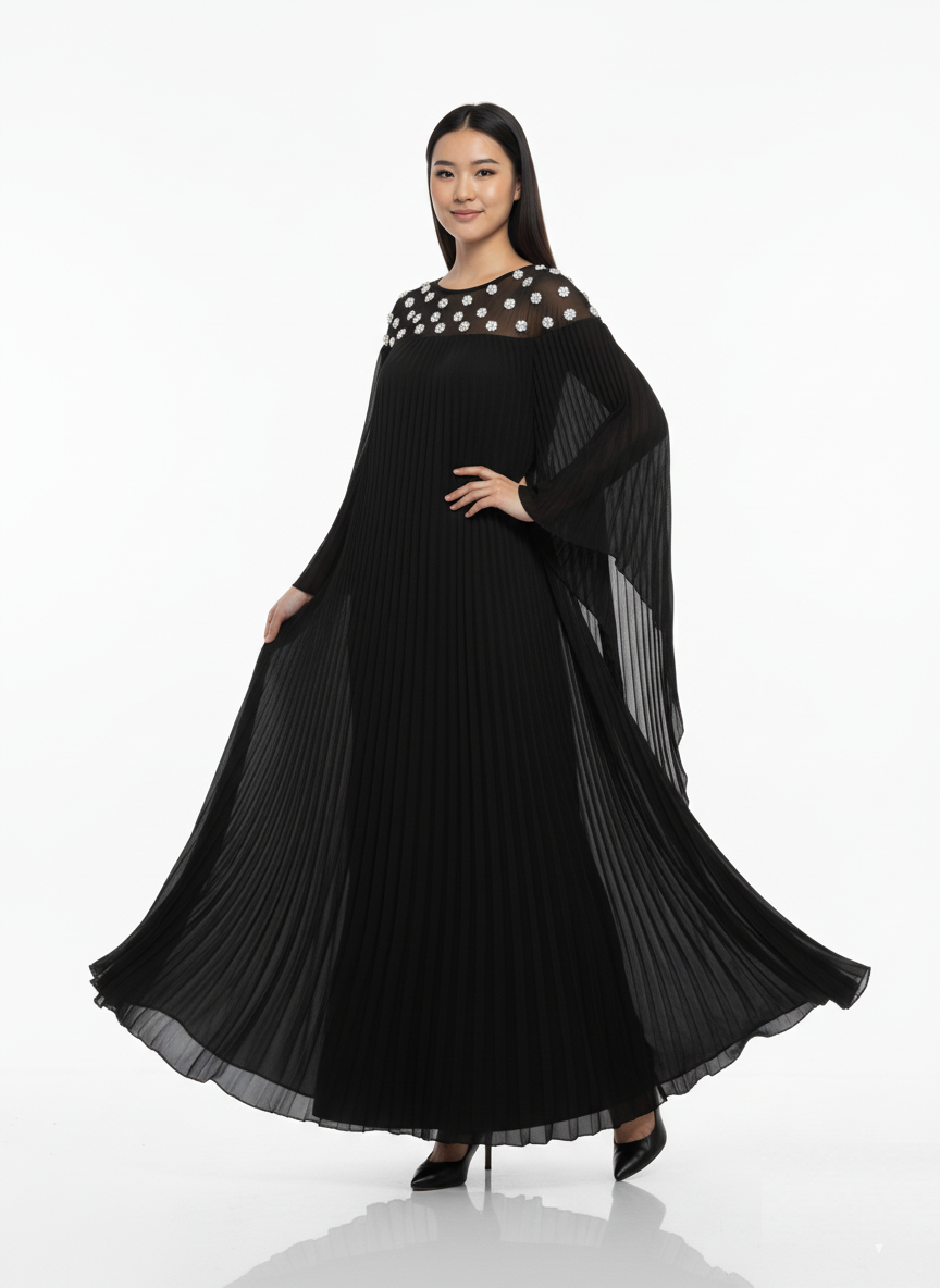 Sleeves Dramatic flared cape sleeves with fine pleating, designed to provide elegant movement and coverage.