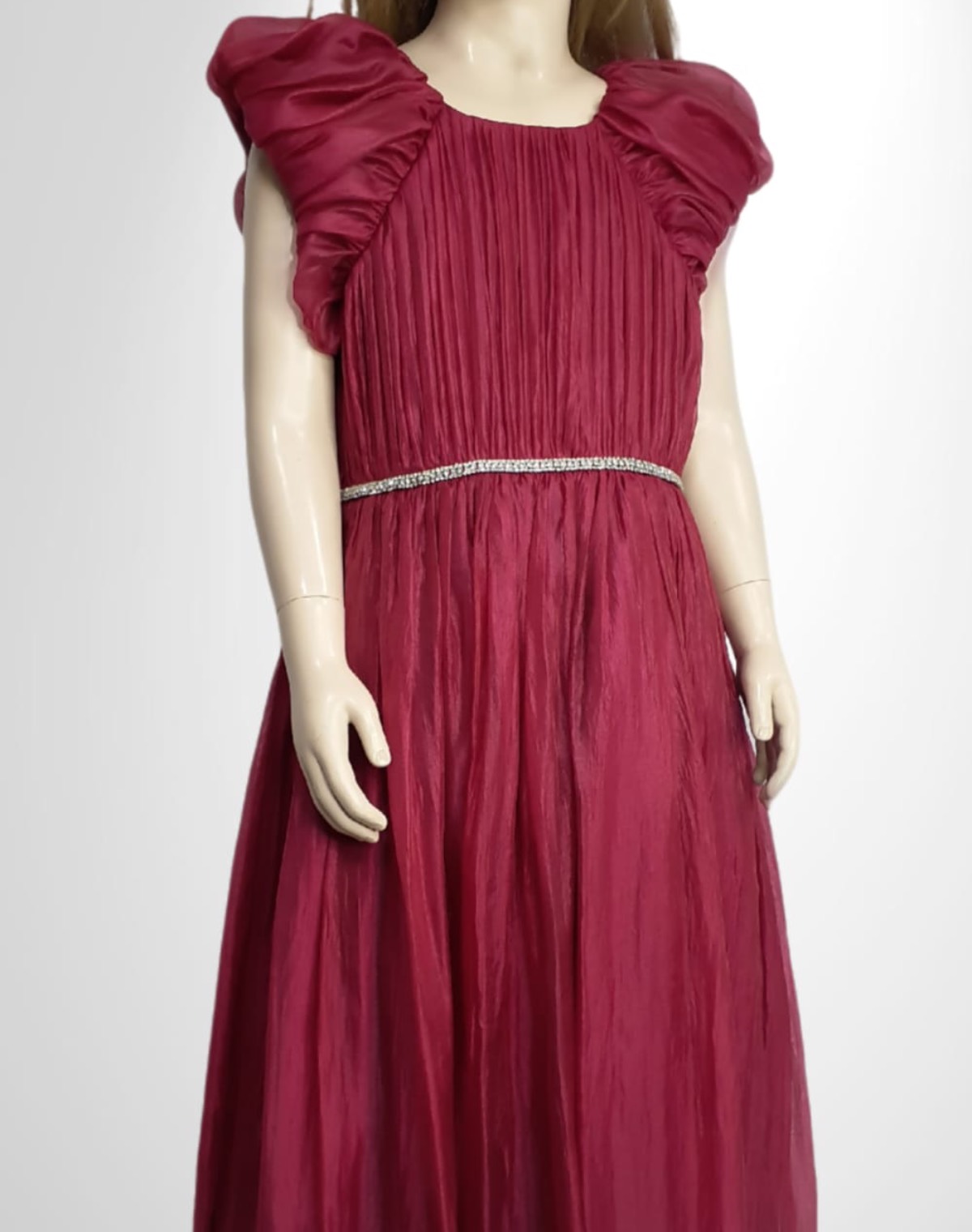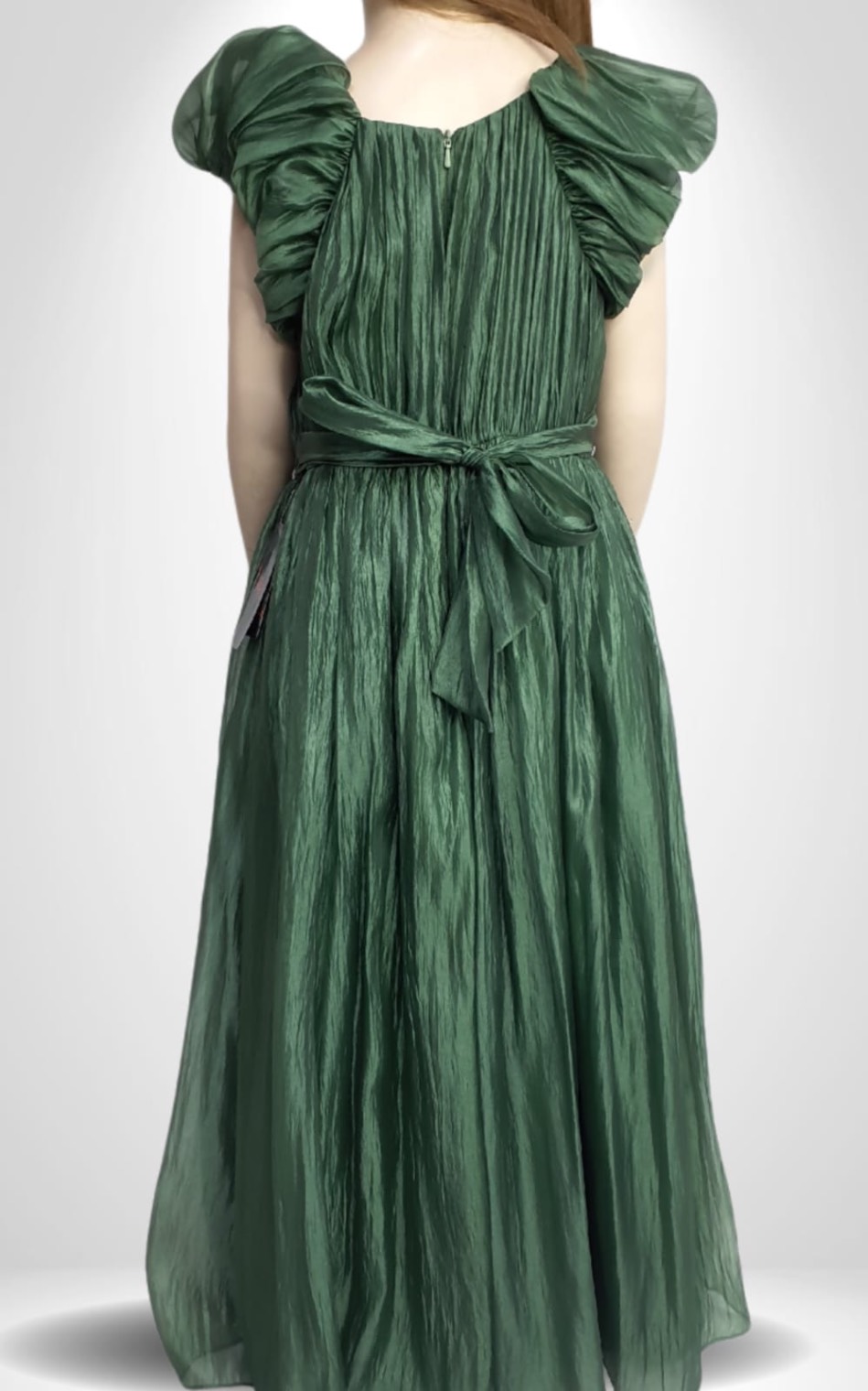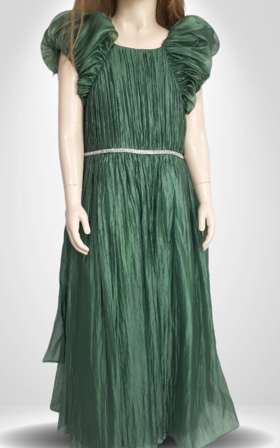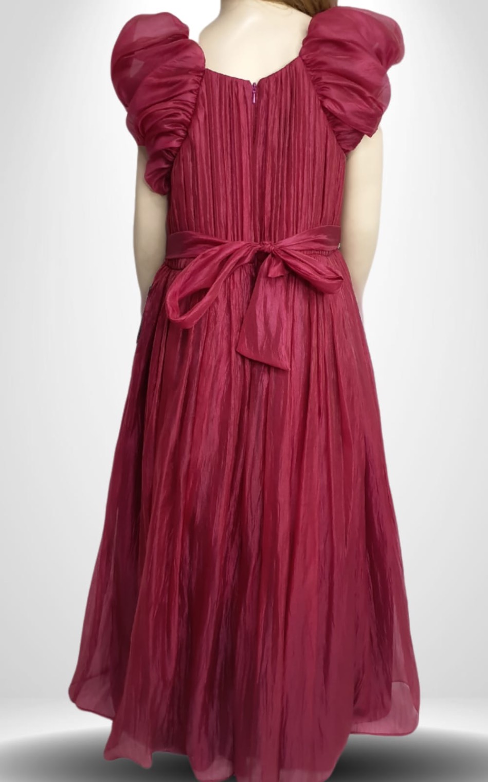 This elegant gown features a crinkled organza overlay with a pleated bodice, puff sleeves, a sparkly front belt, and a large sash bow at the back.