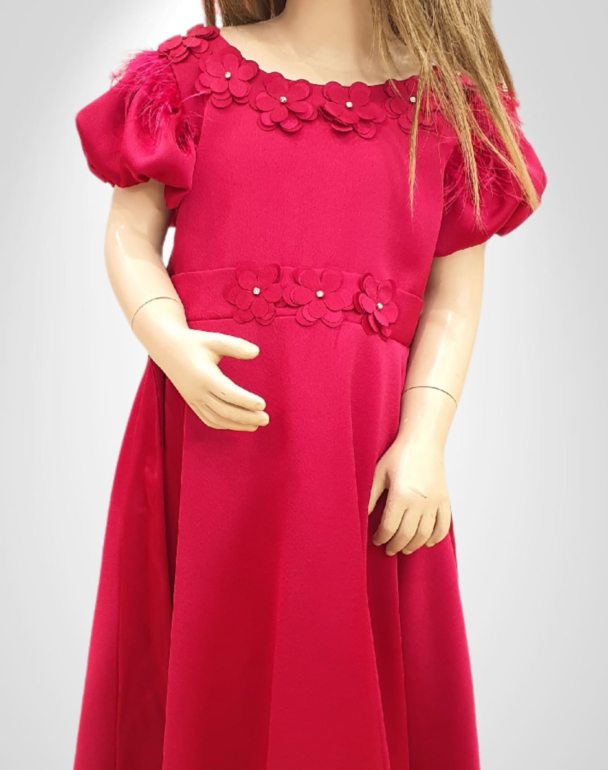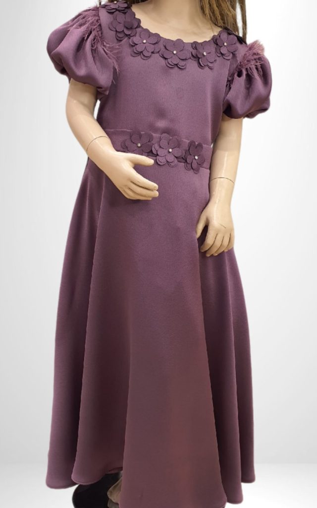 This elegant mauve gown features floral appliqués with jeweled centers at the neckline and waist, complemented by whimsical, feather-trimmed puff sleeves.