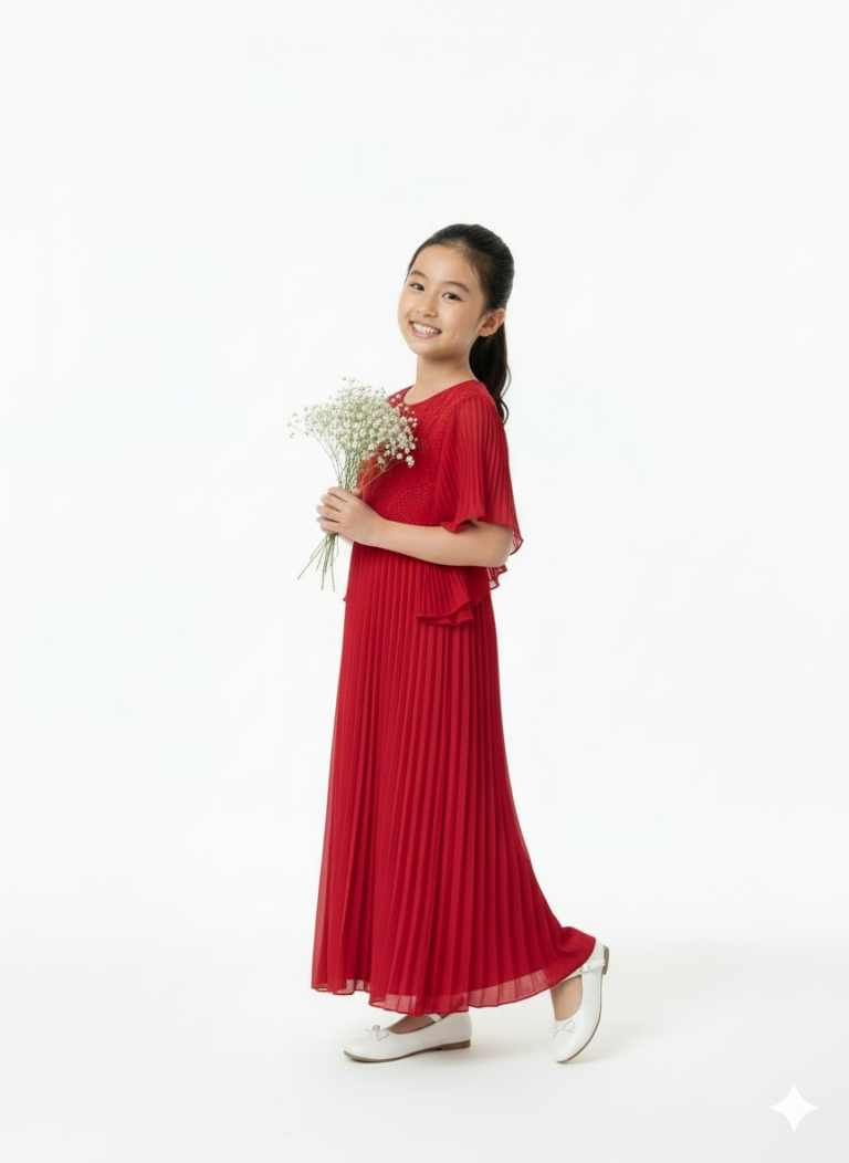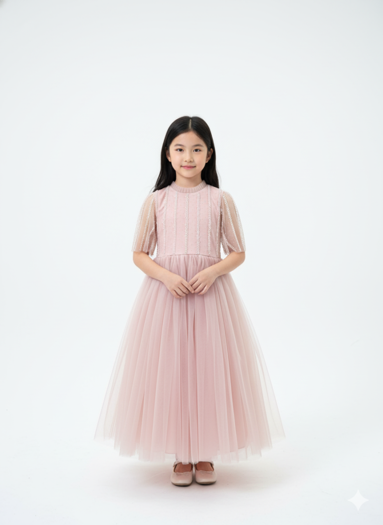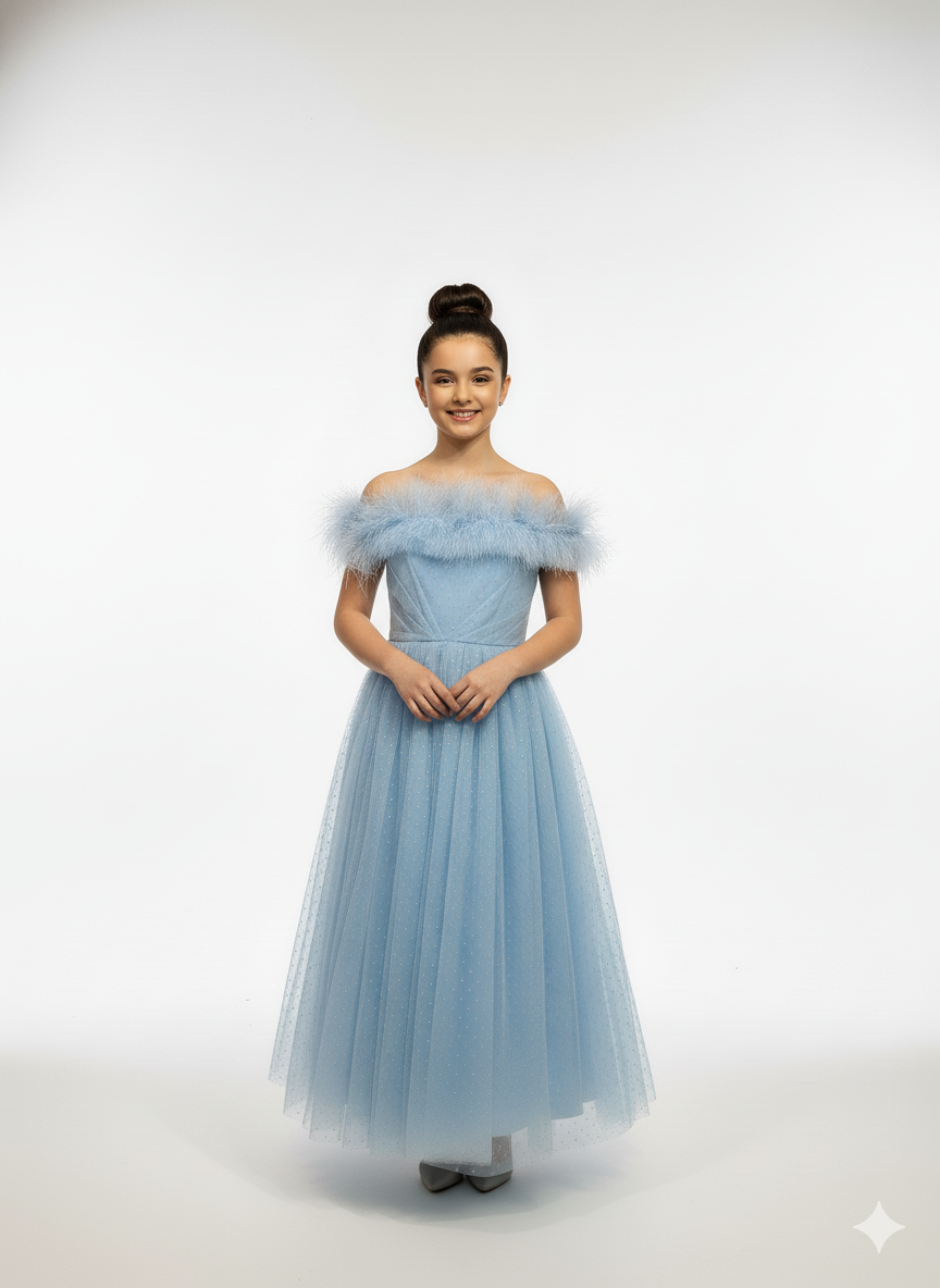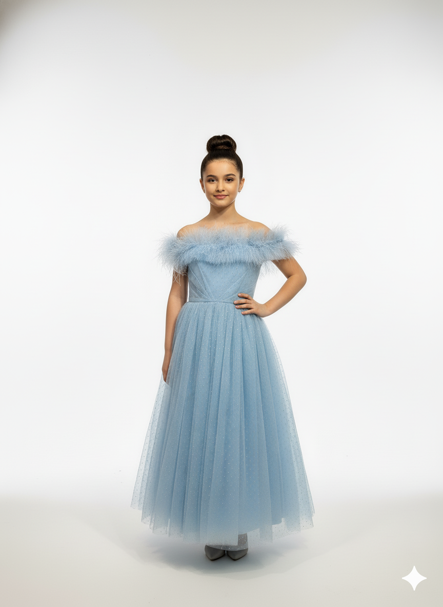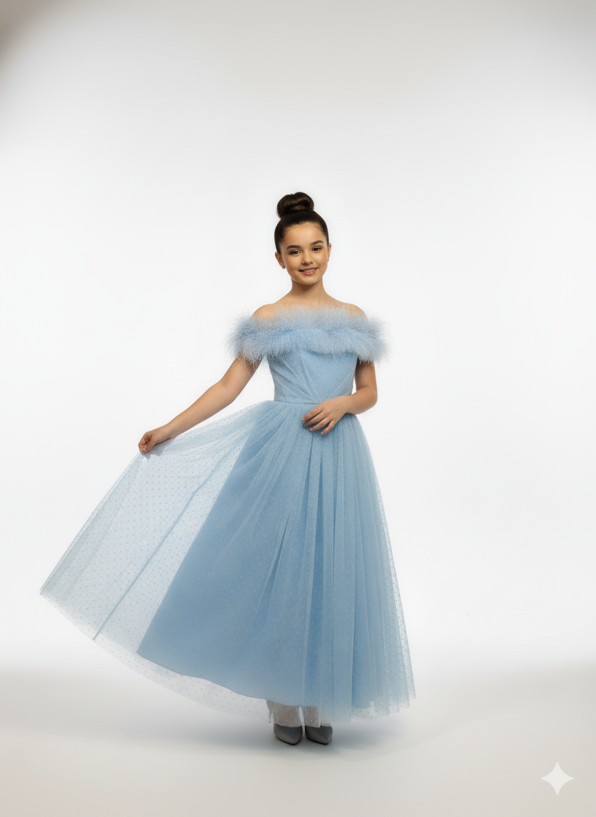 An elegant off-shoulder tulle dress designed for little girls with a soft and dreamy princess look.