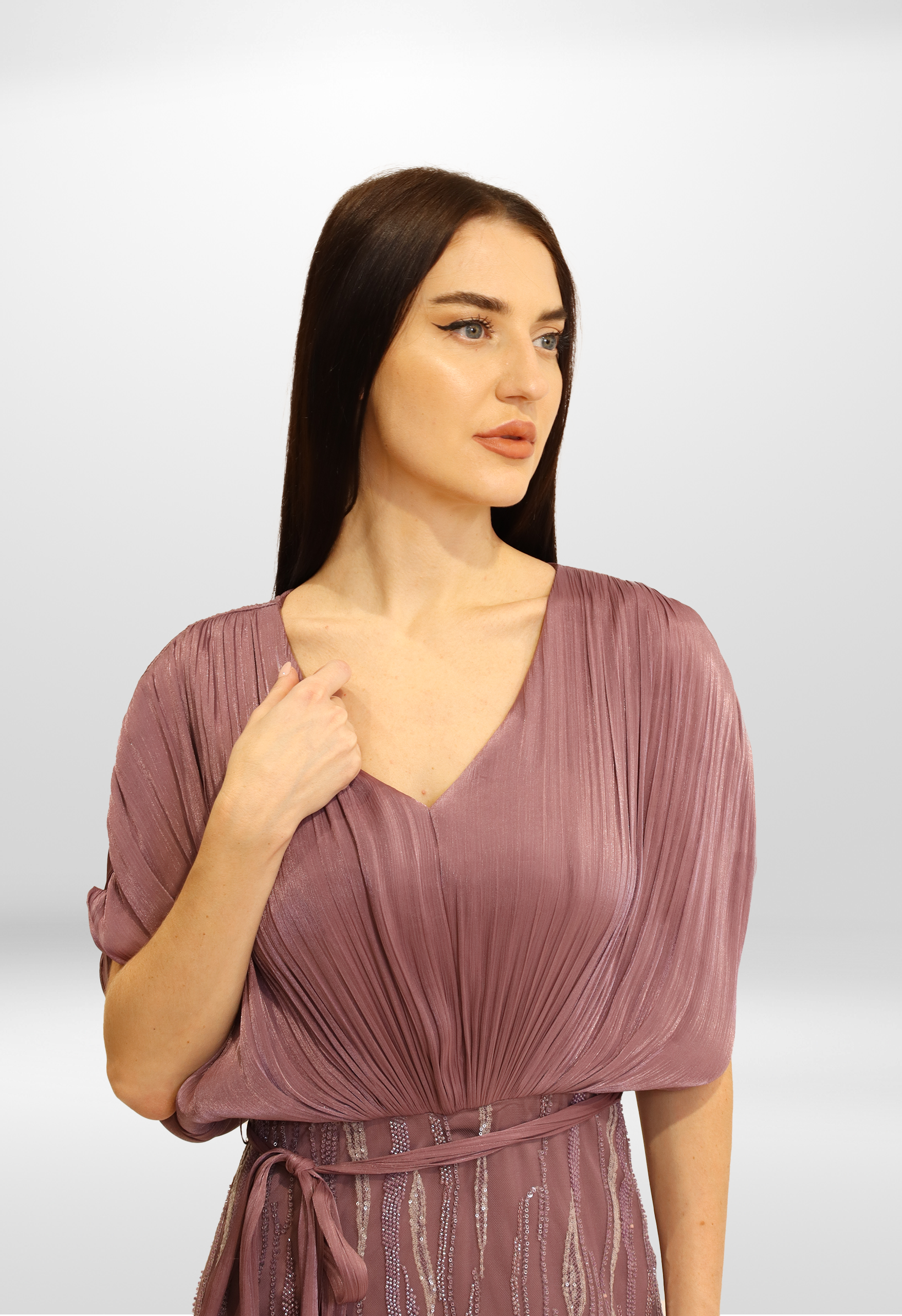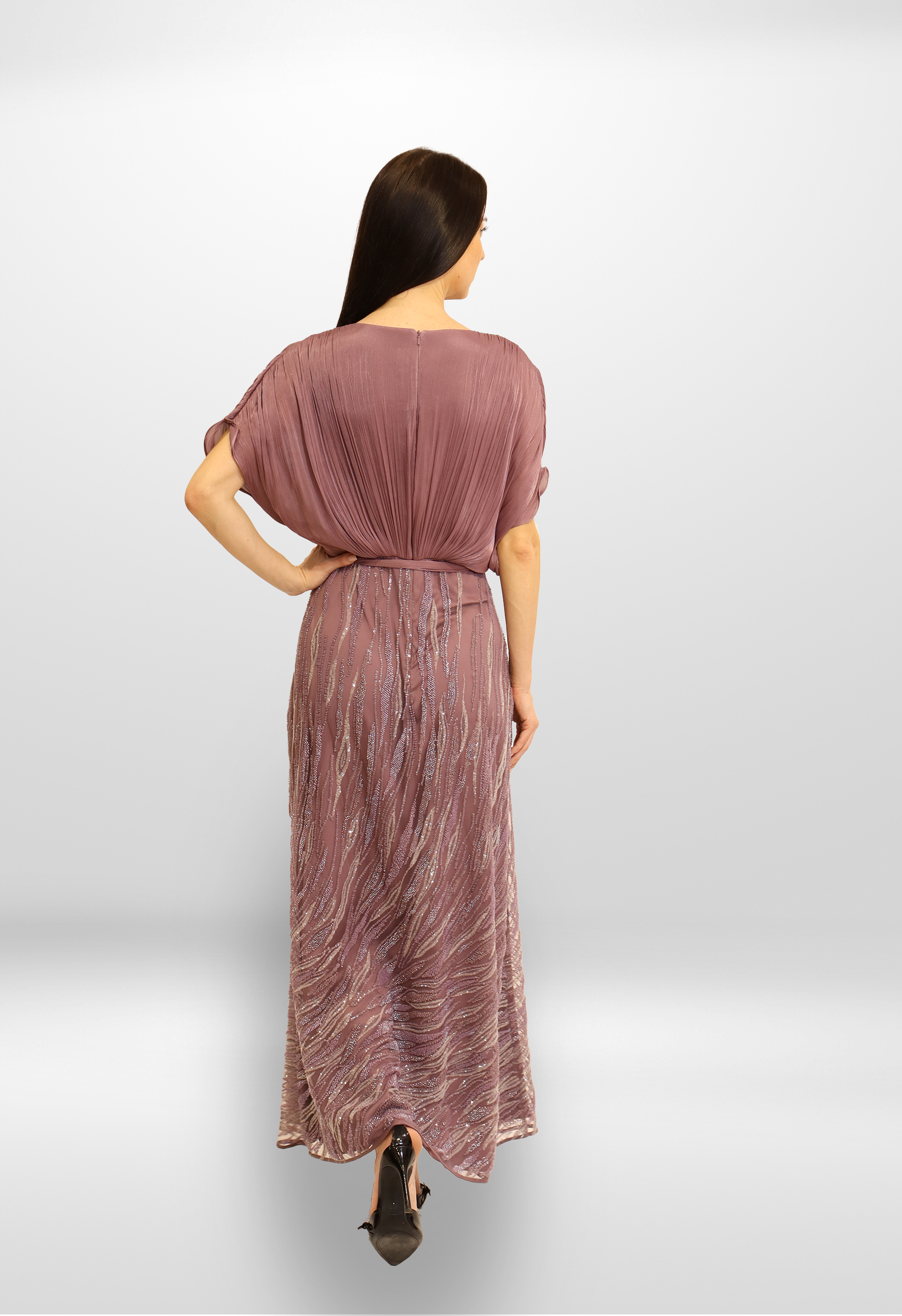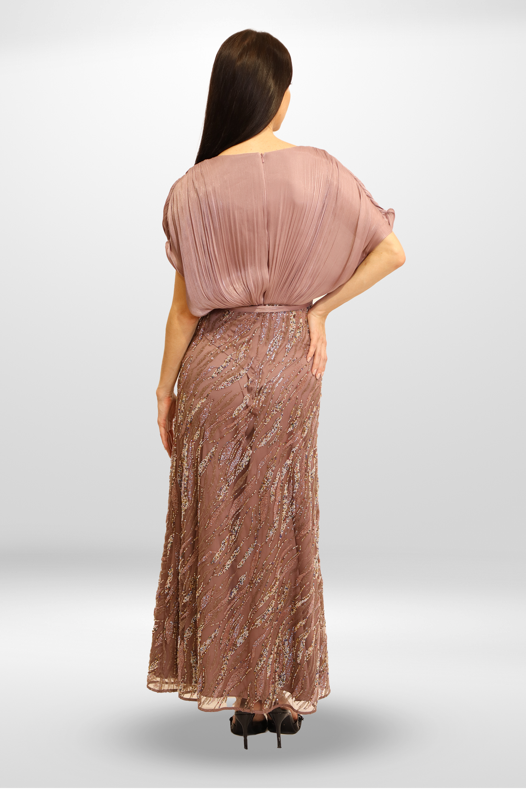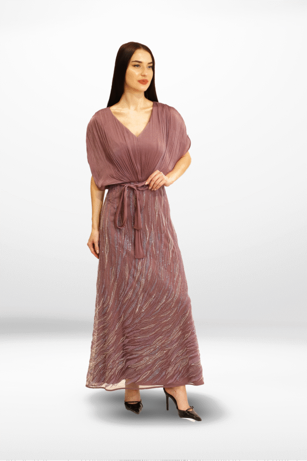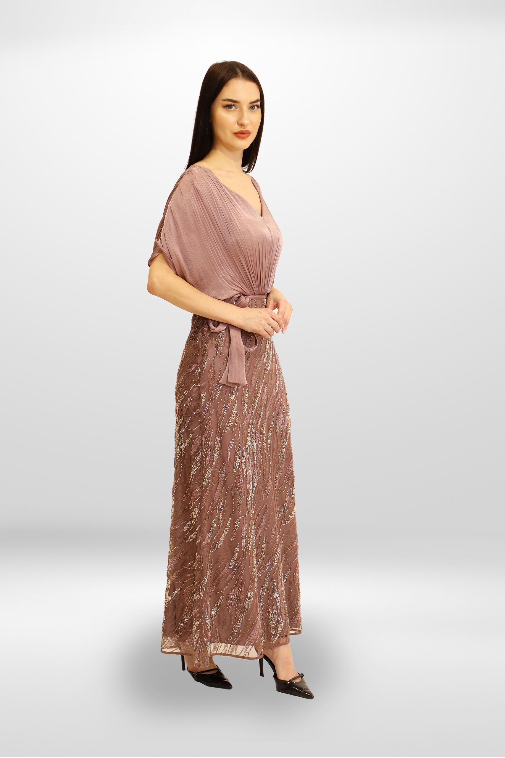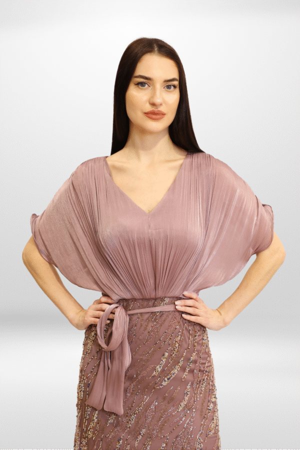 A refined luxury gown blending soft rosire fabric on the upper body with an embroidered flowing skirt, creating timeless sophistication.