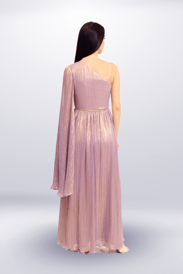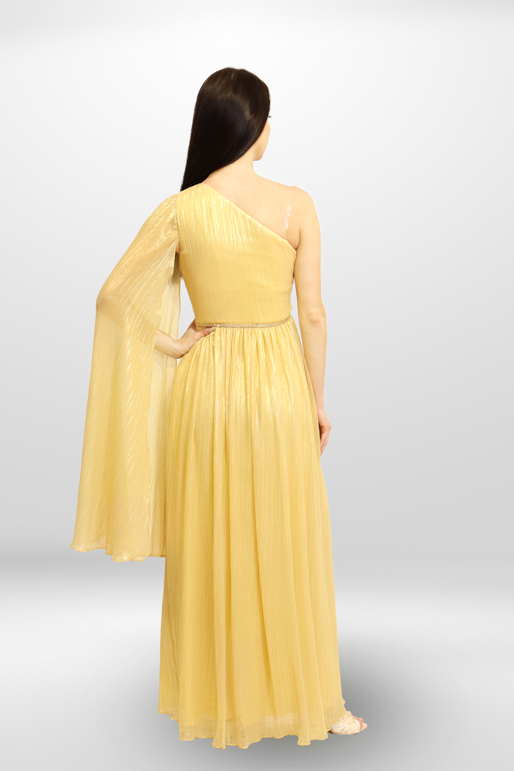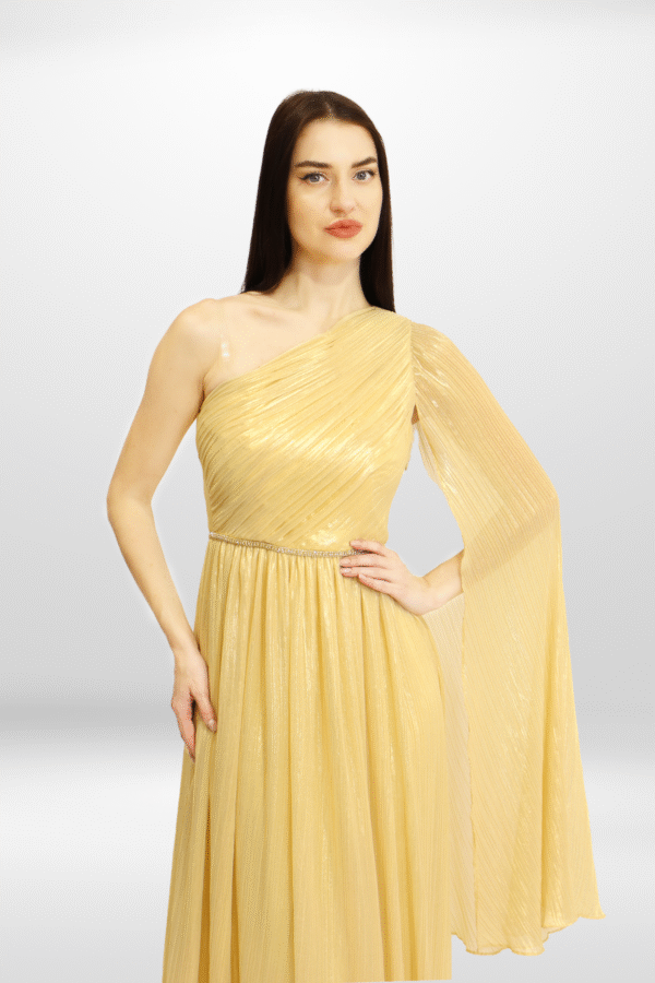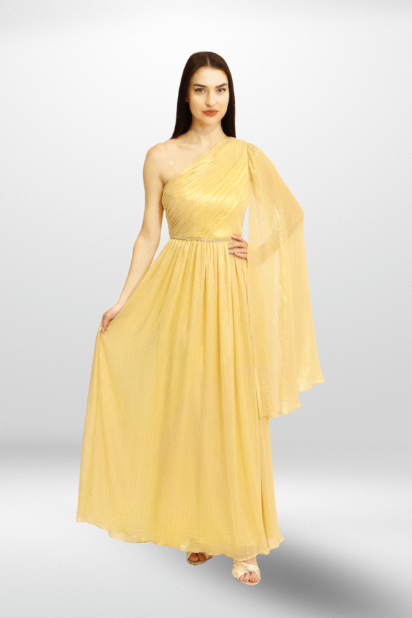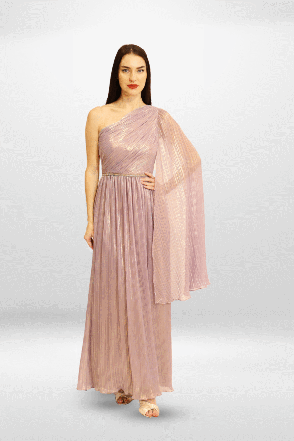 A graceful one-shoulder gown with flowing pleats, exuding sophistication and modern elegance for special occasions.