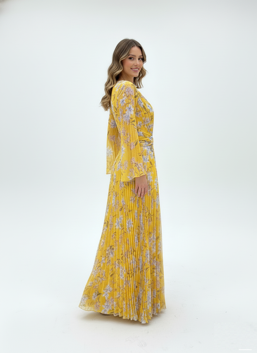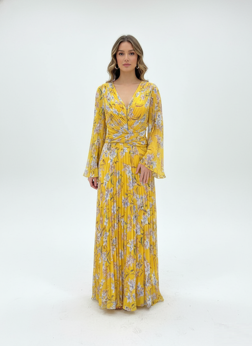 The dress shown in the image is a Yellow Floral Printed Pleated Maxi Dress. Based on the visual characteristics, it closely resembles designs from several luxury and contemporary brands, most notably Self-Portrait, which is known for its signature floral chiffon and pleated styles.